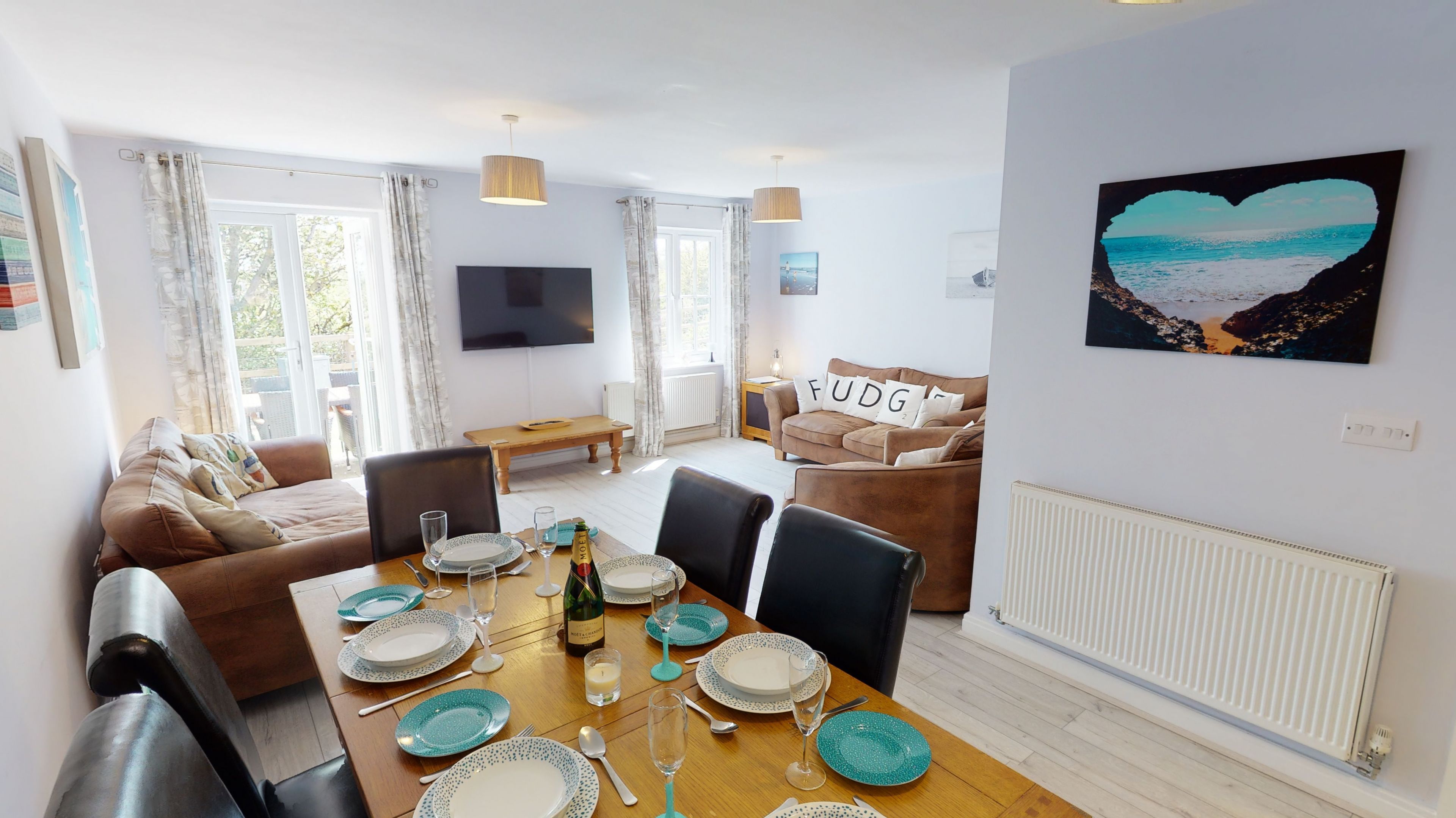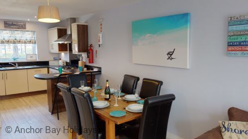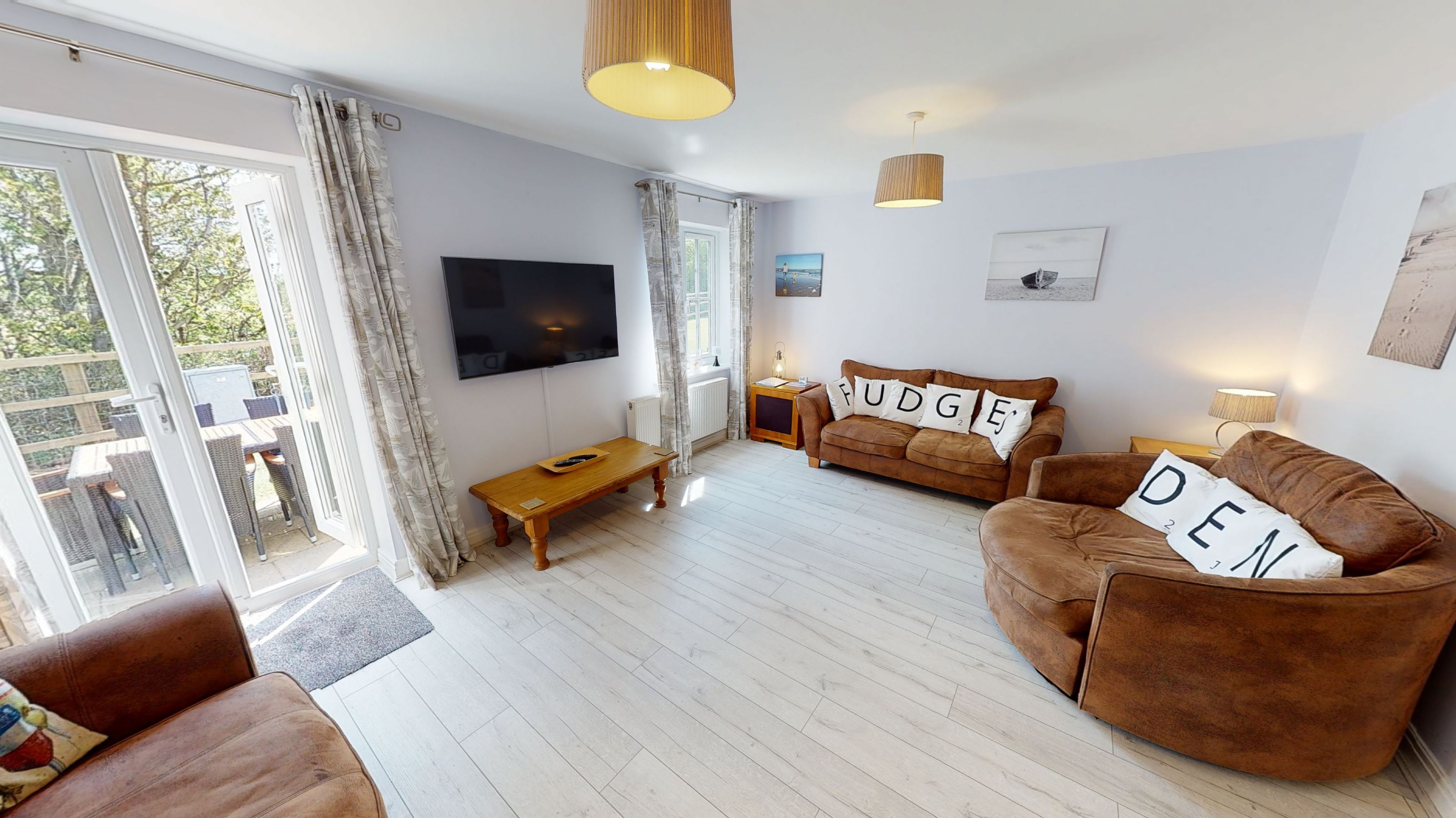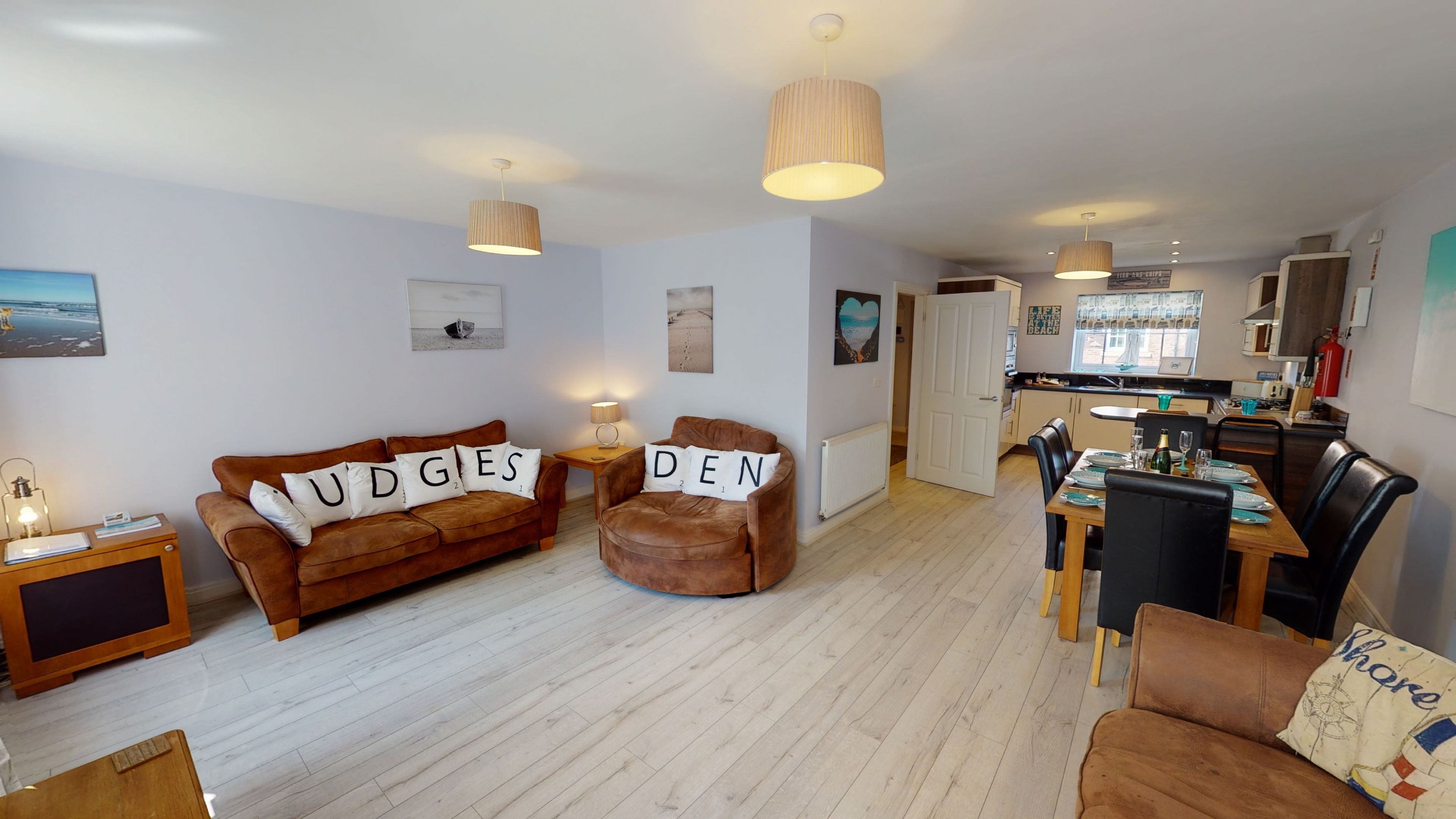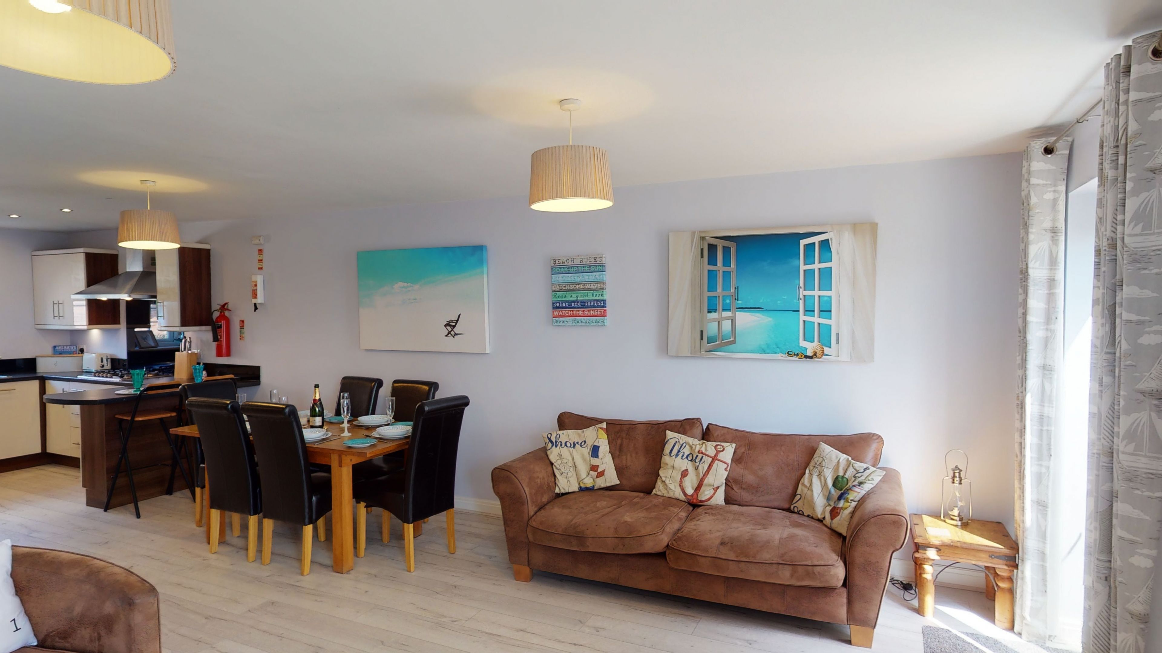 Enter into a spacious hallway, with space for your coats and shoes. Ahead to the right is a large kitchen diner / lounge with all the appliances you’ll expect for a self-catering break. There is an excellent dining space in the kitchen, with extended dining table seating 6 with French doors to the patio, and 2 large comfortable sofas. Across the hall there is a WC.