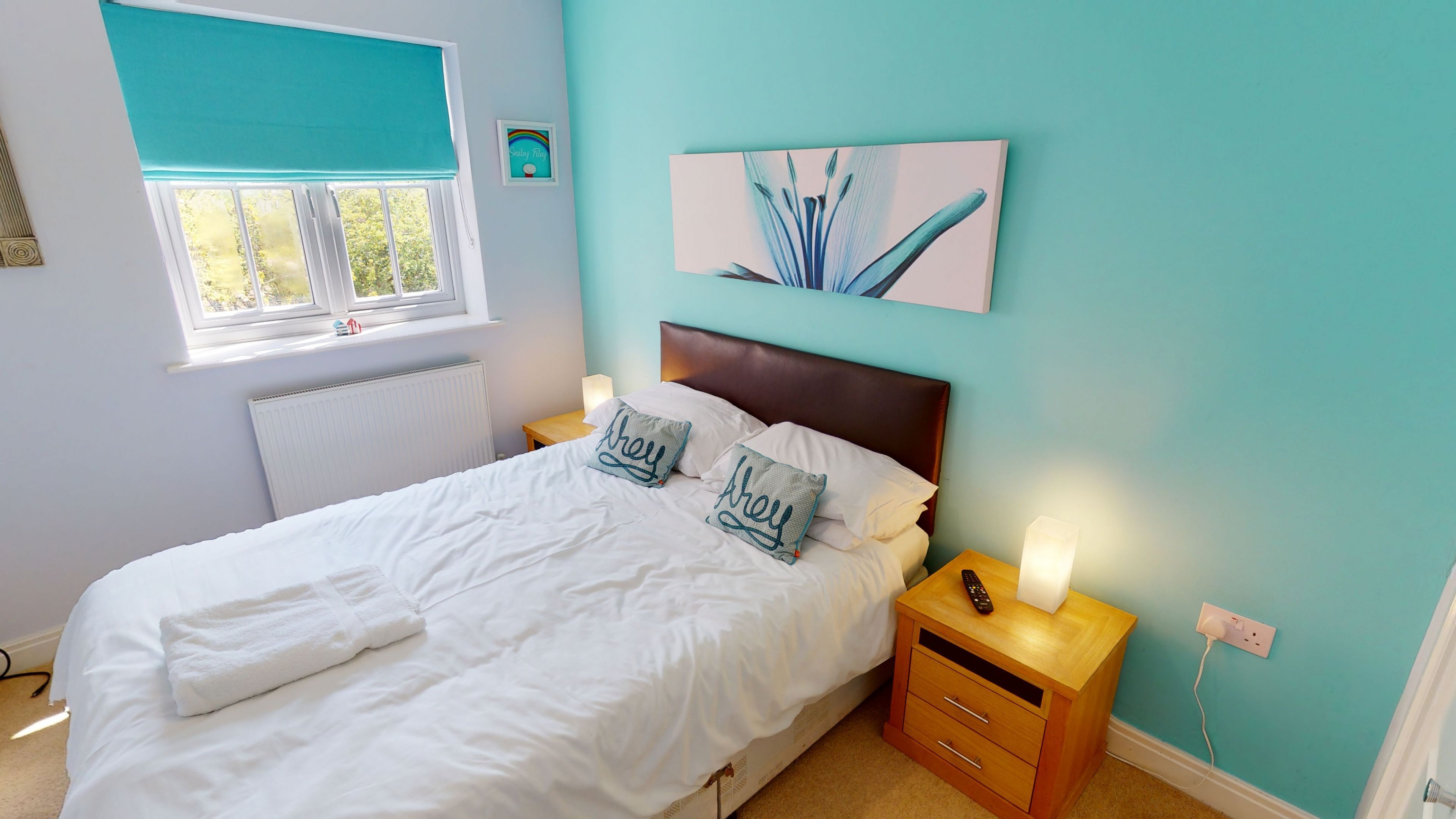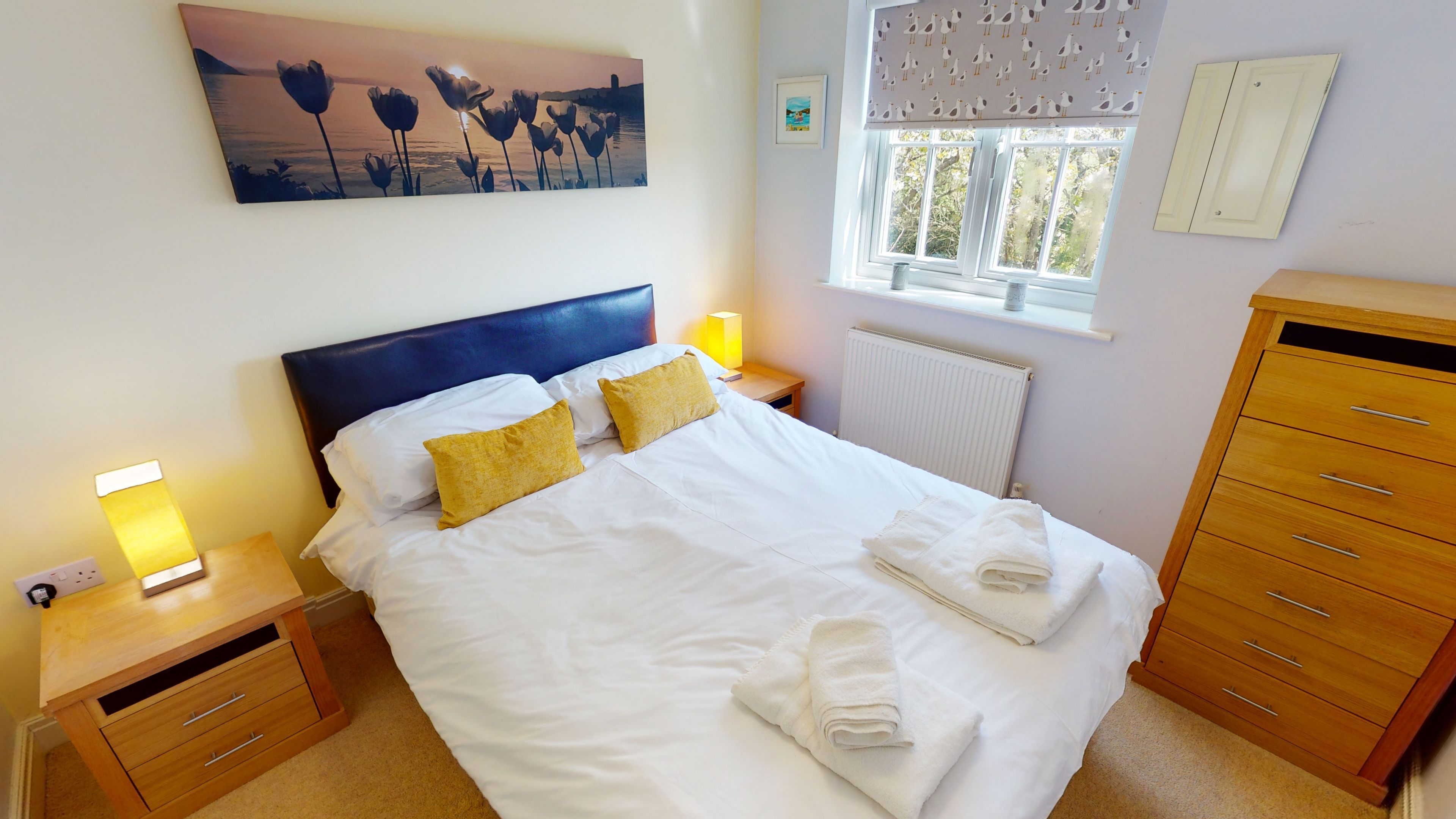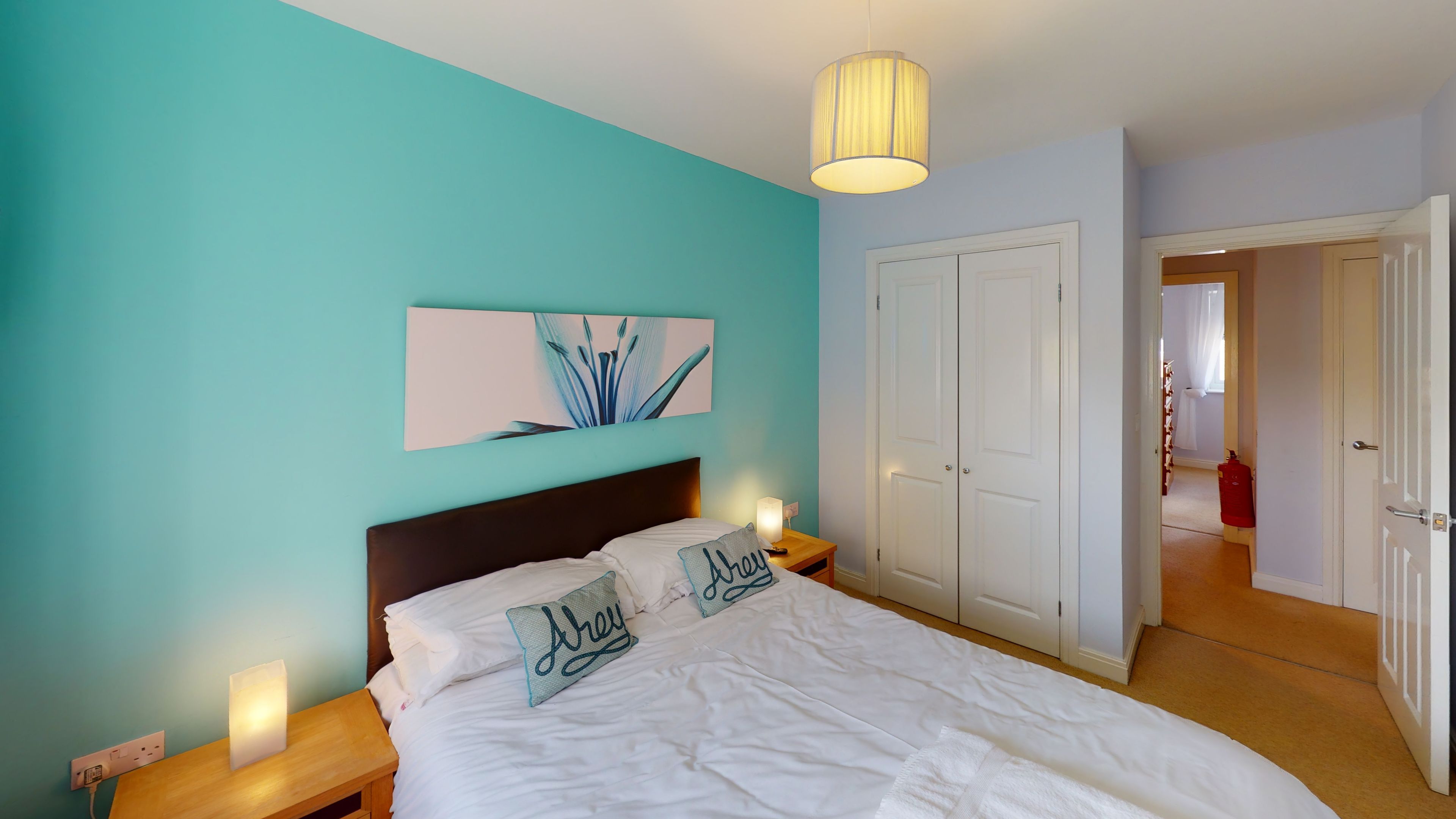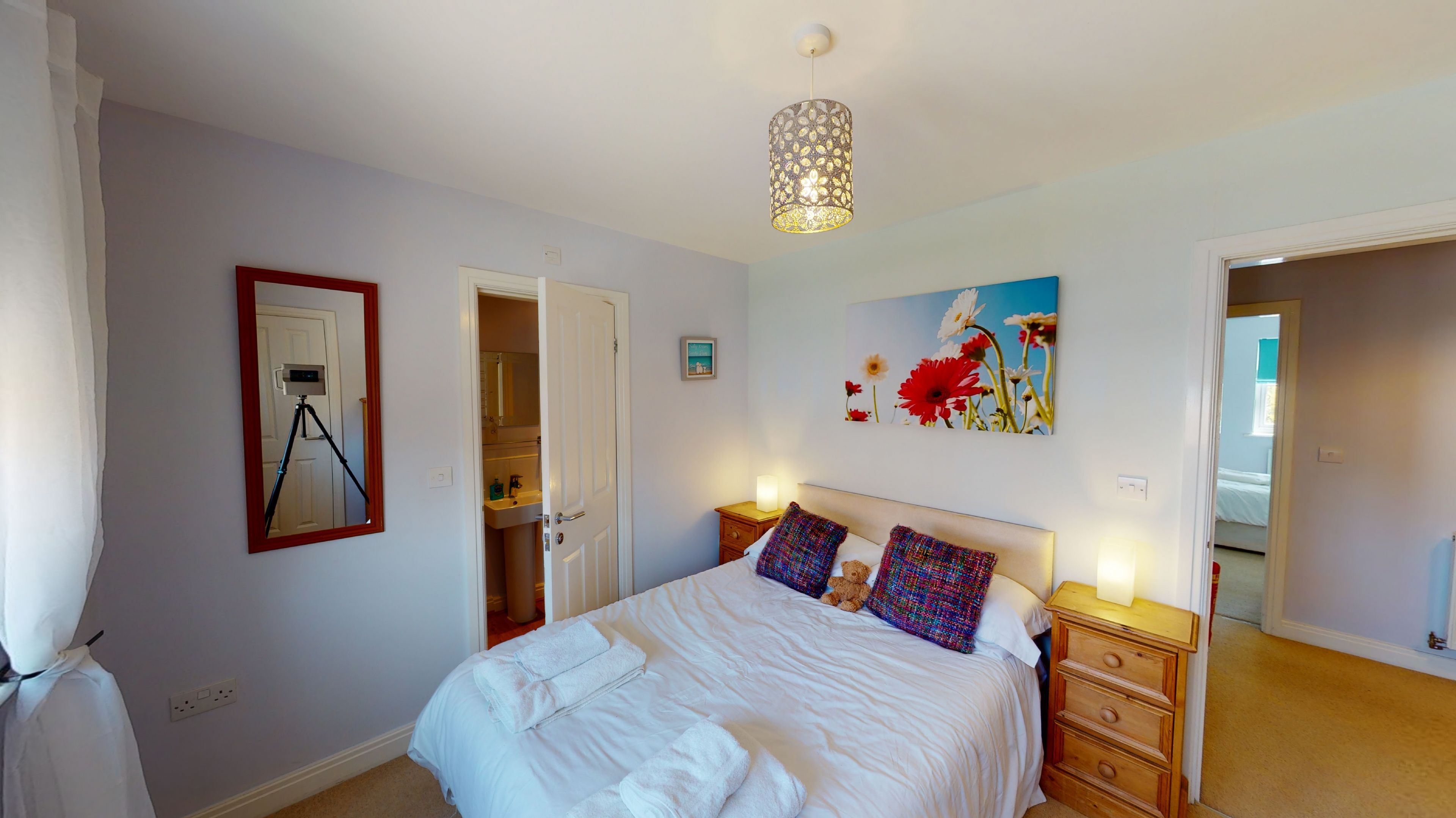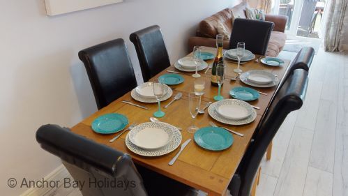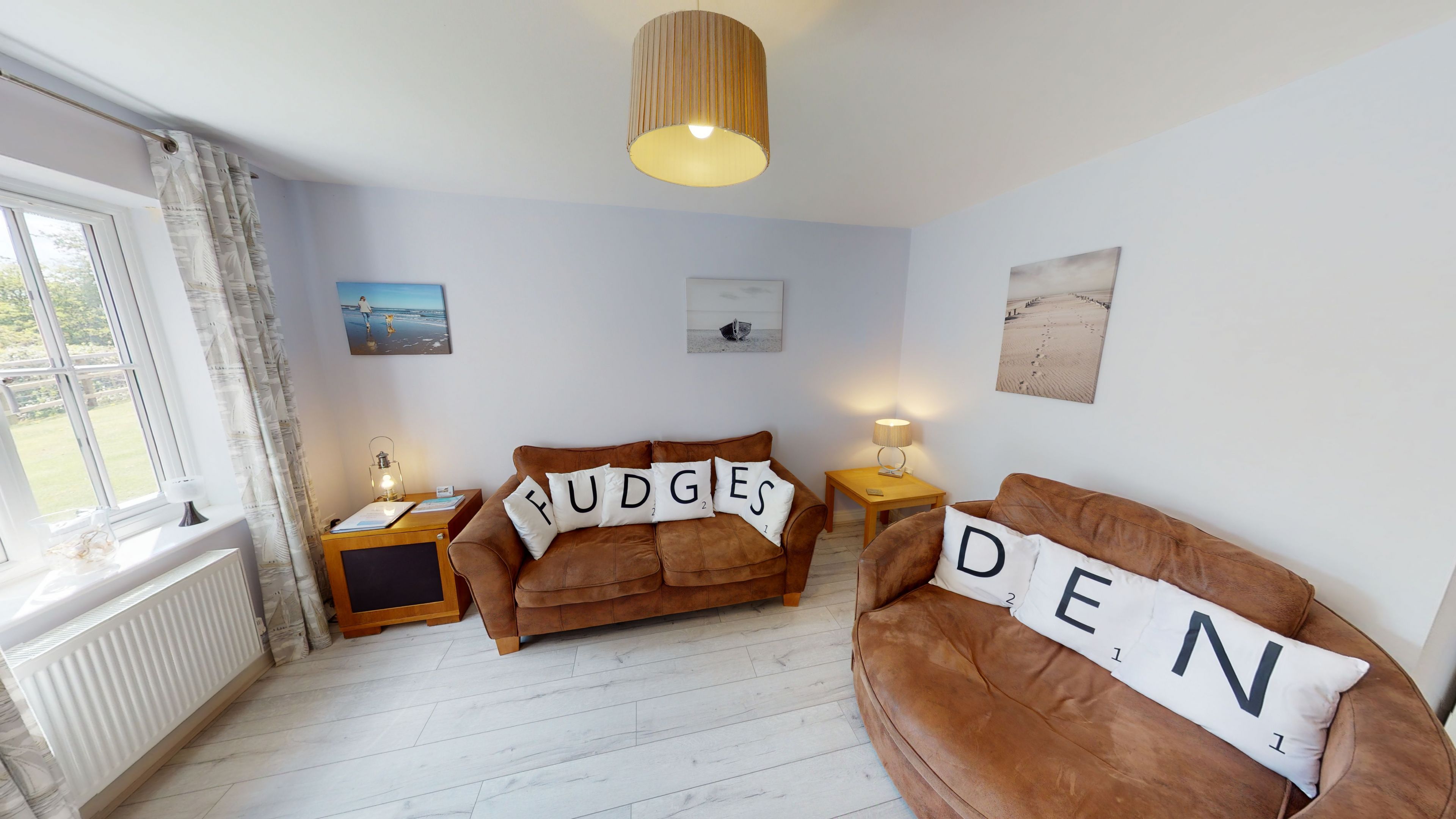 Enter into a spacious hallway, with space for your coats and shoes. Ahead to the right is a large kitchen diner / lounge with all the appliances you’ll expect for a self-catering break. There is an excellent dining space in the kitchen, with extended dining table seating 6 with French doors to the patio, and 2 large comfortable sofas. Across the hall there is a WC.