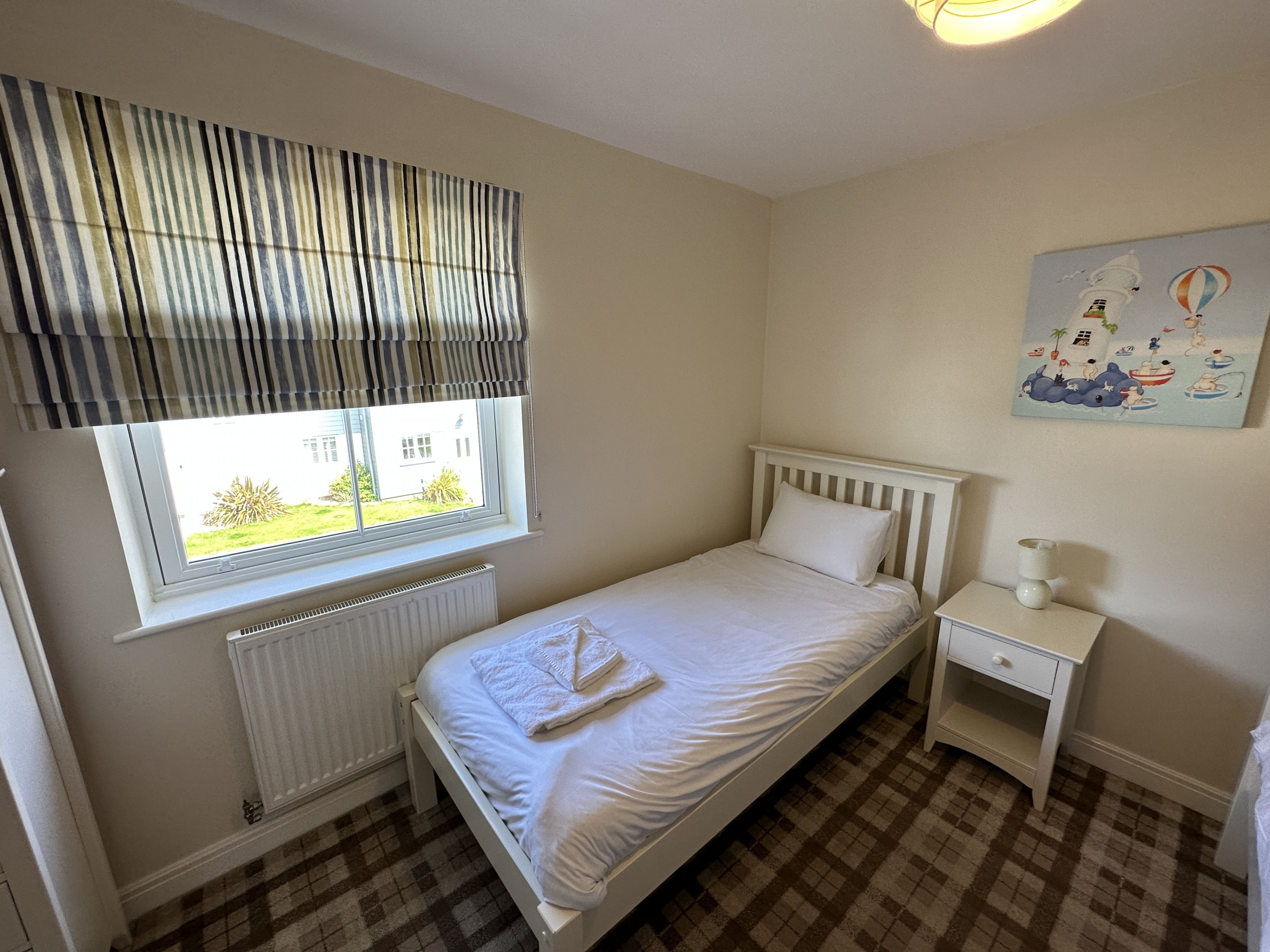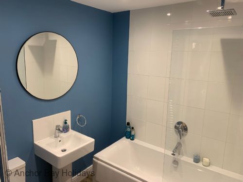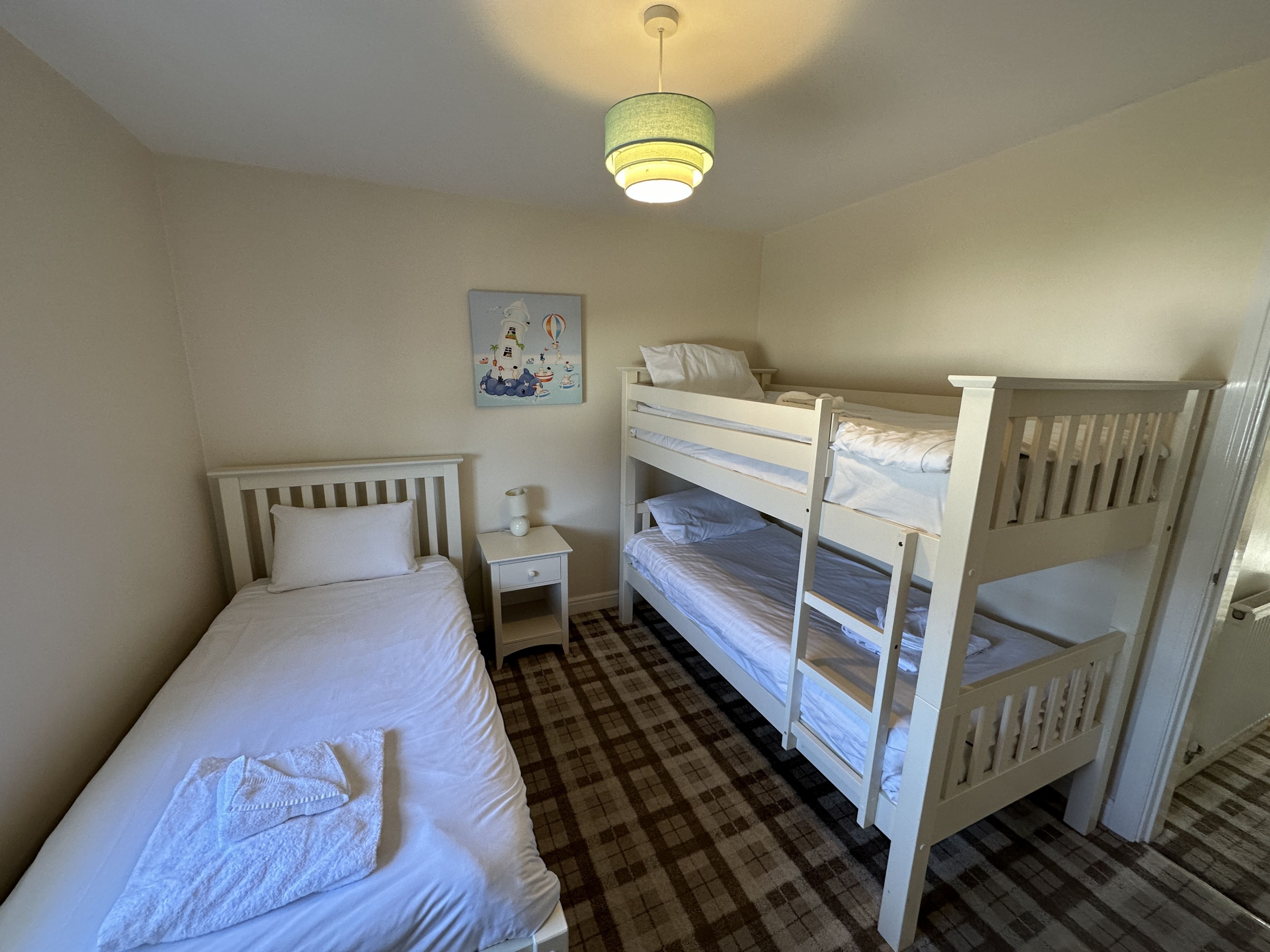 Upstairs the property comprises of 1 king bedroom and 1 second bedroom with single bed and a bunk bed (sleeping 3 in that room). There is a large family bathroom complete with bath and overhead rainfall shower.