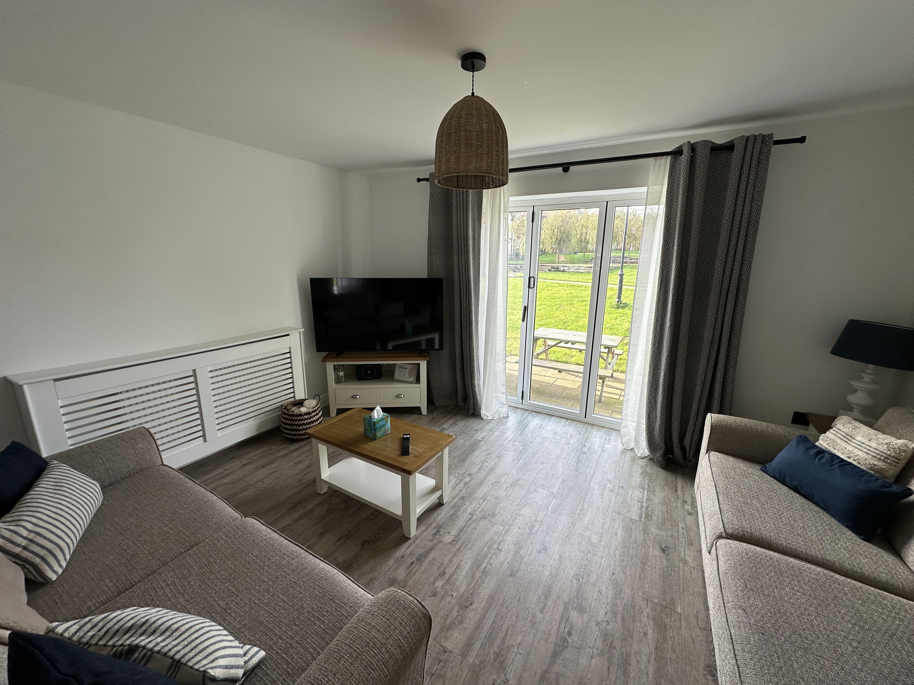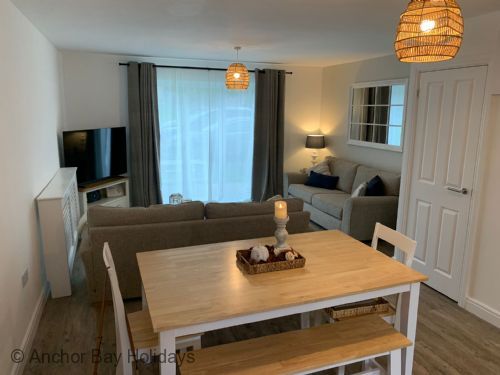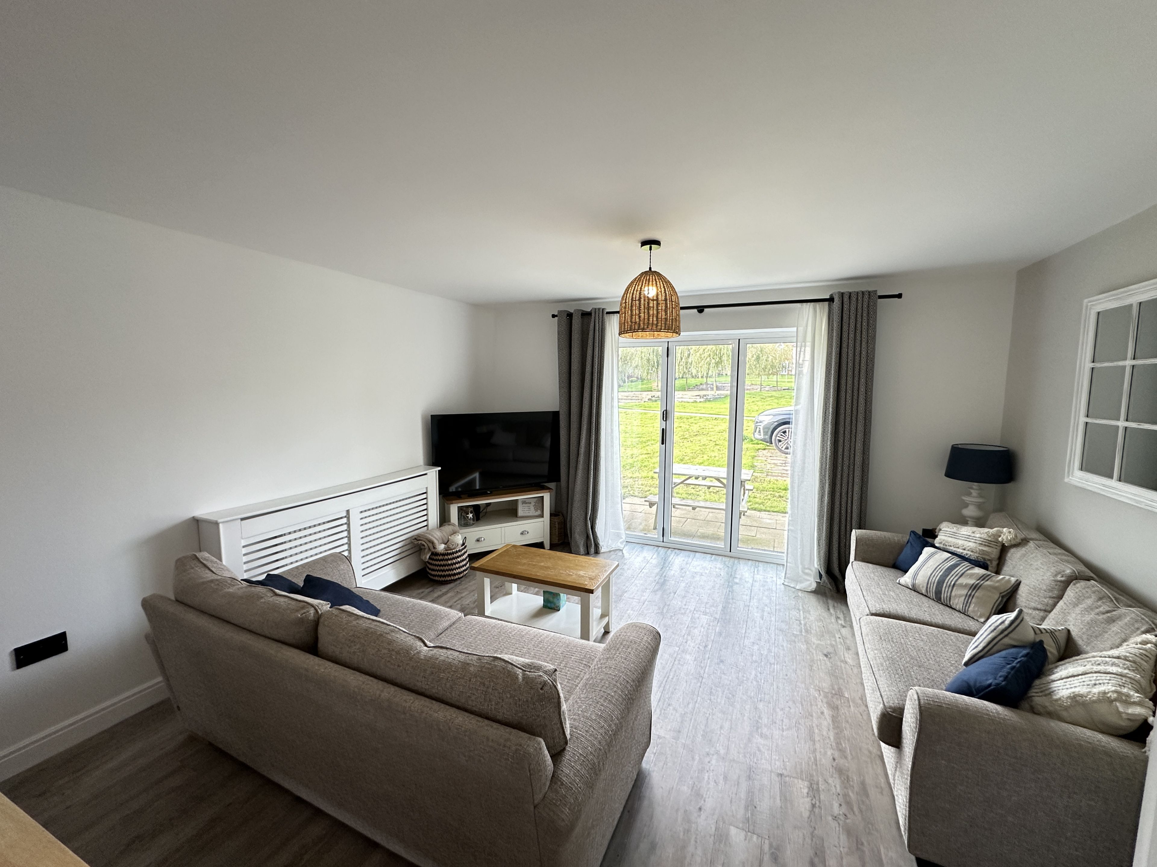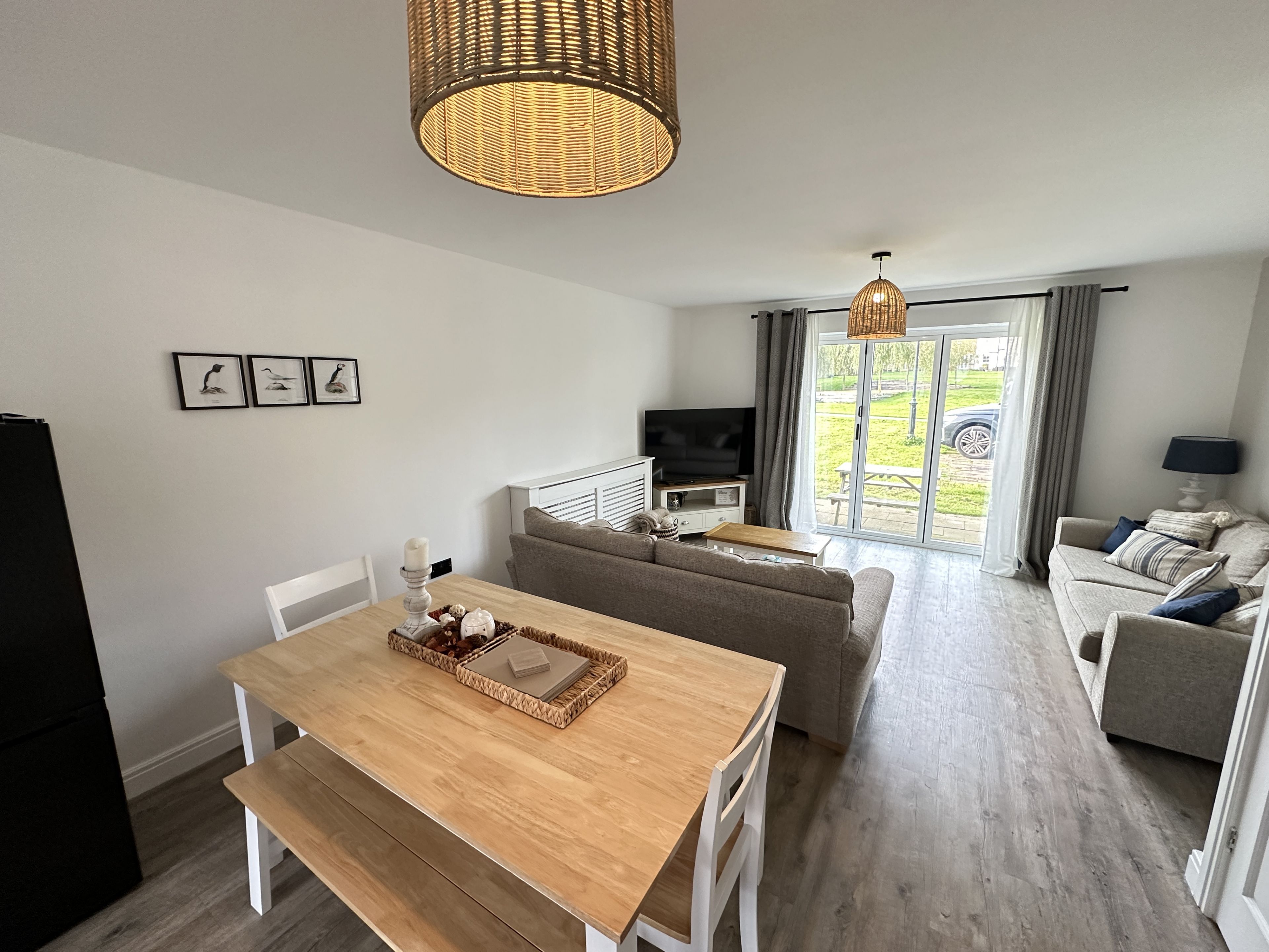 Walk through into the large open plan L shaped lounge with lovely 3 seater and 2 seater sofas, SMART TV, dining room (sits 5) and fully fitted kitchen including dishwasher, washer, new fridge freezer, air-fryer etc.