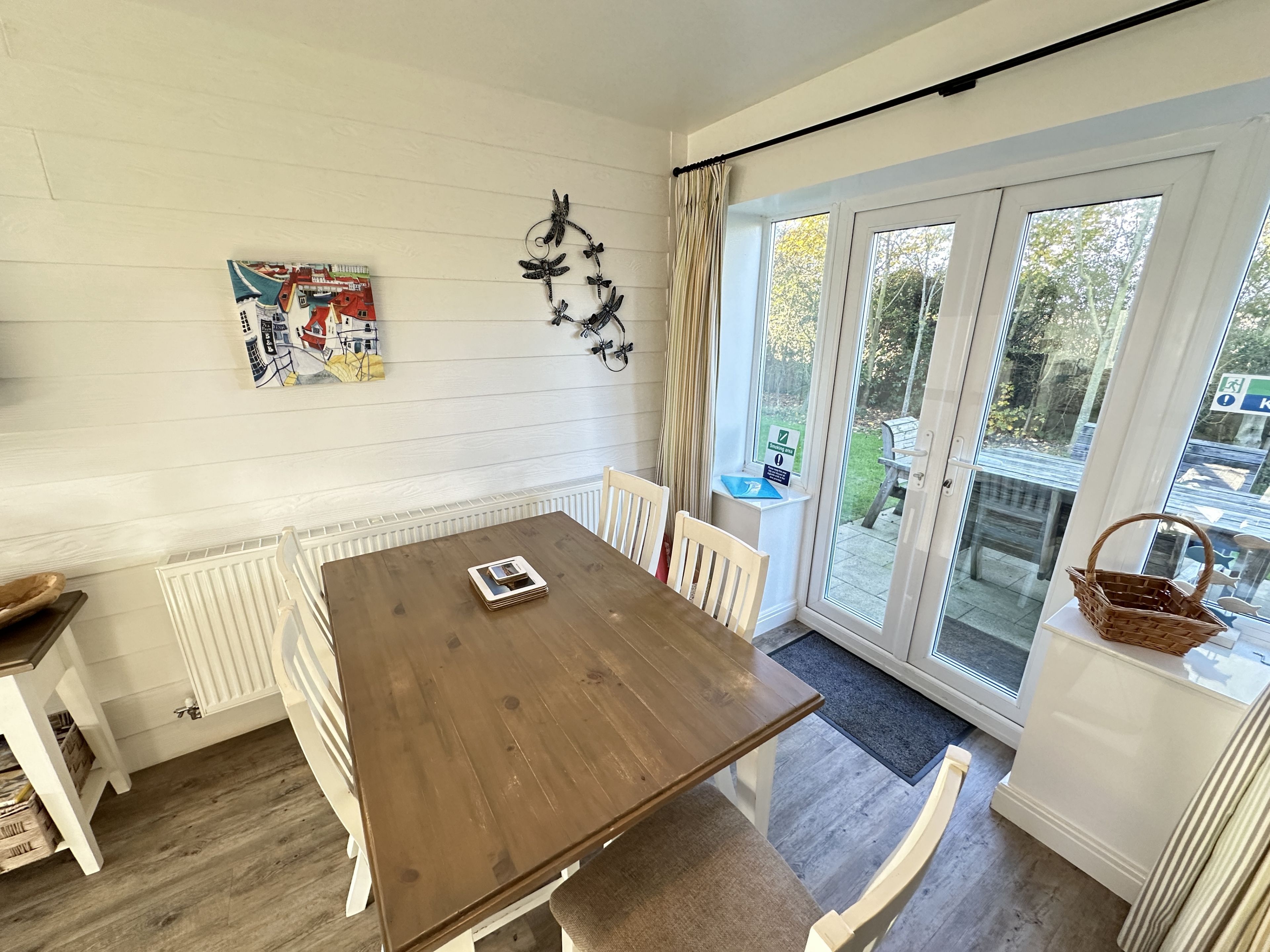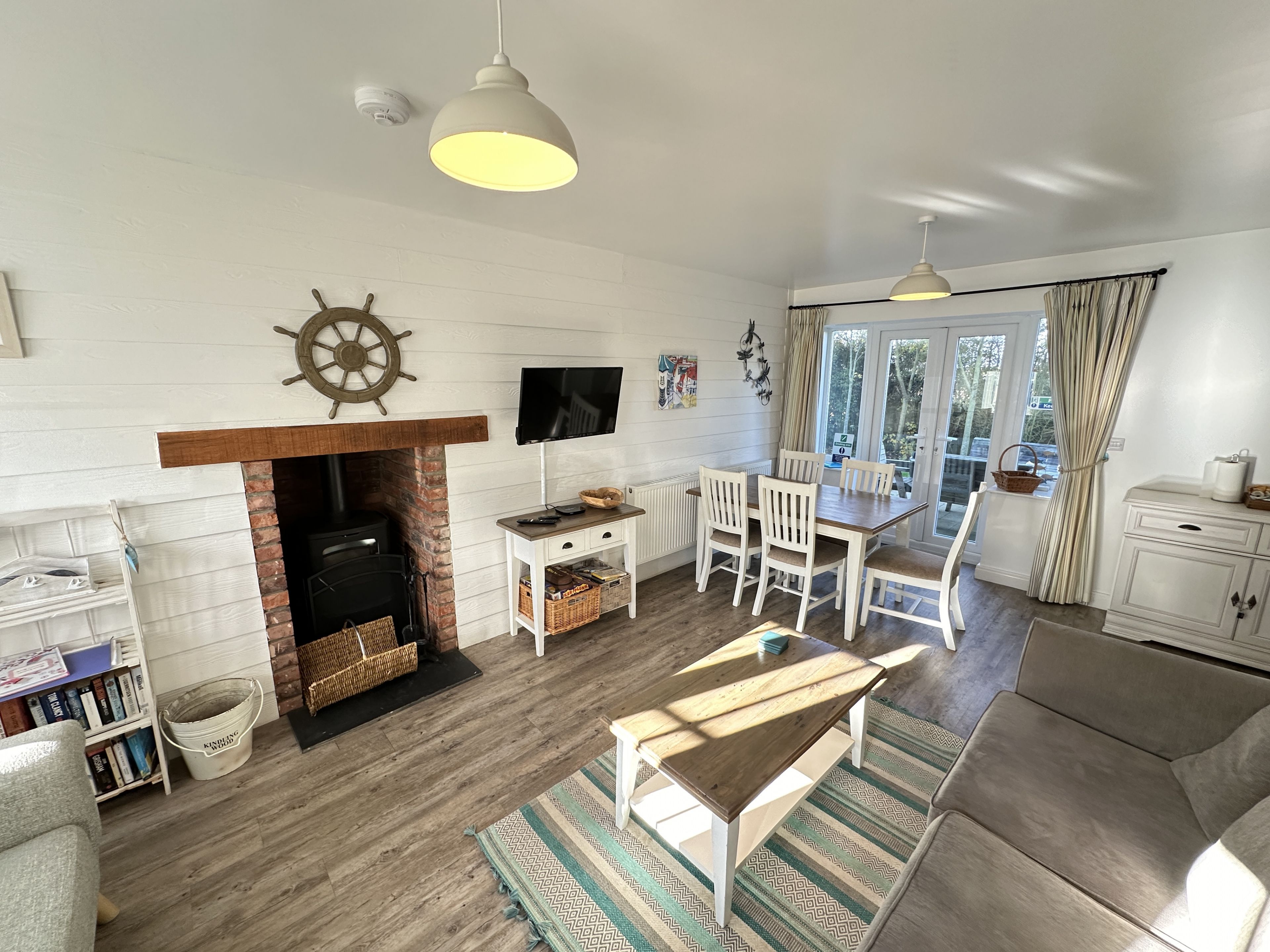 Enter through the step free doorway into a generously proportioned hallway with cloakroom and storage. Walk into the 'L' shaped open plan living, dining and kitchen area with wood-burner stove, sofas for 5 and SMART TV (with free Sky Cinema via Now TV), dining table for 5 and modern fully equipped kitchen including a dishwasher, washer-dryer, air fryer and microwave. Off the dining area French doors lead onto a private furnished patio with BBQ area, ideal for outside relaxing with seating for 6 with quiet lawned area.