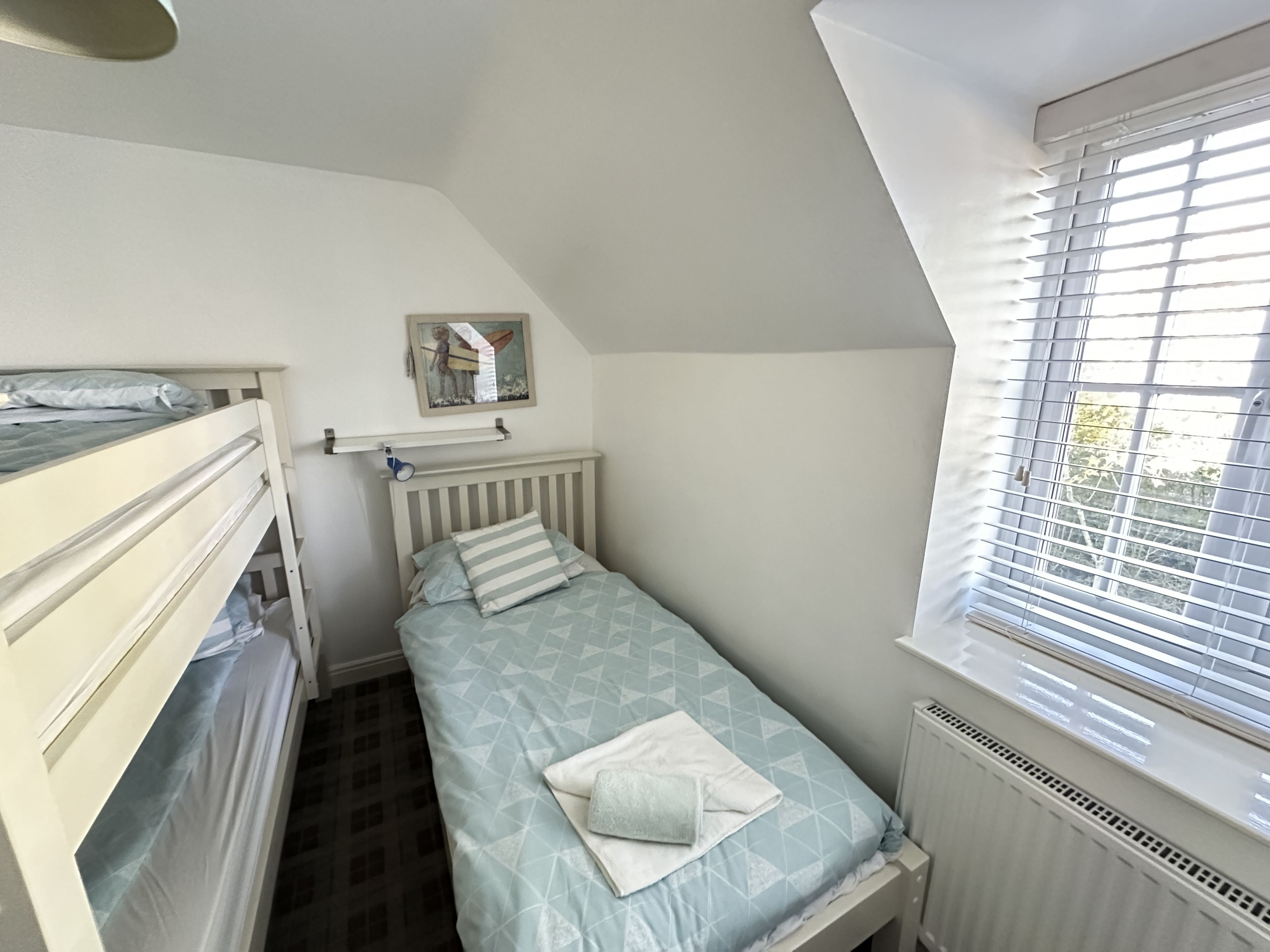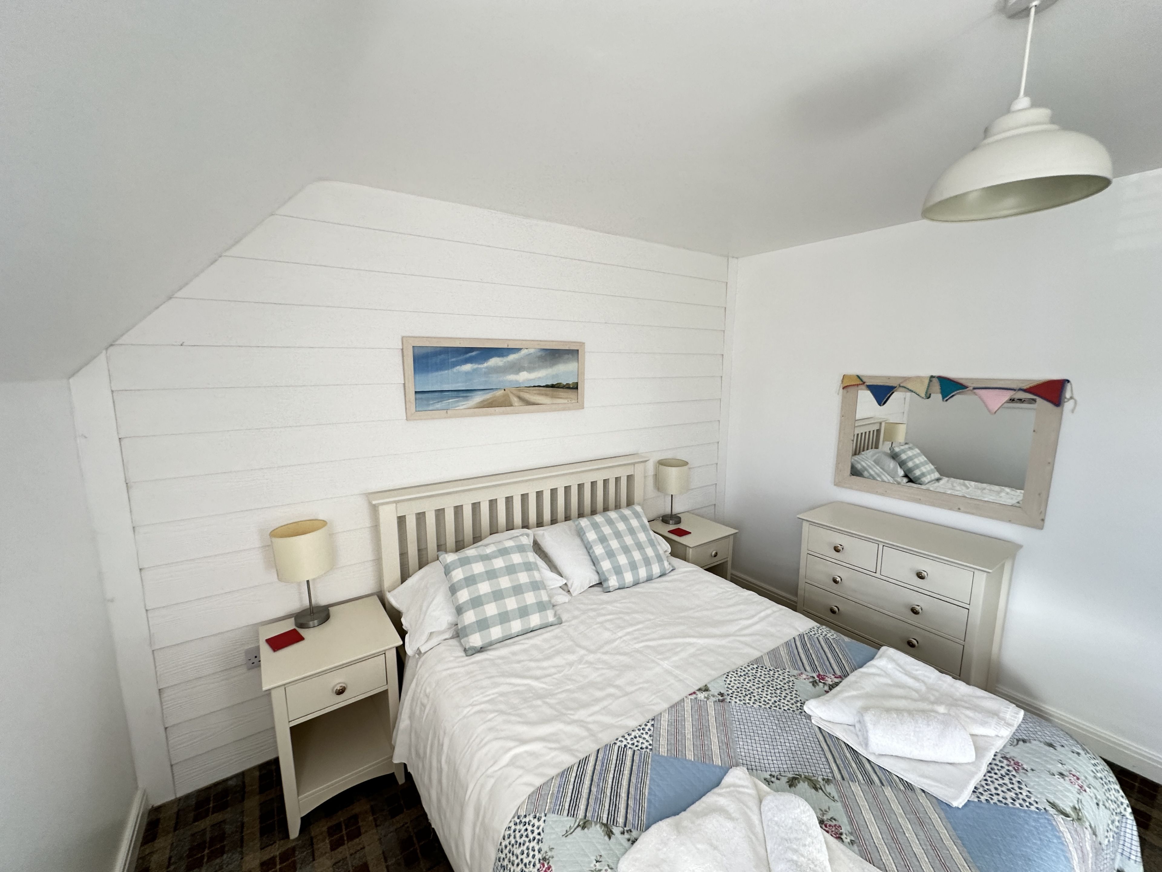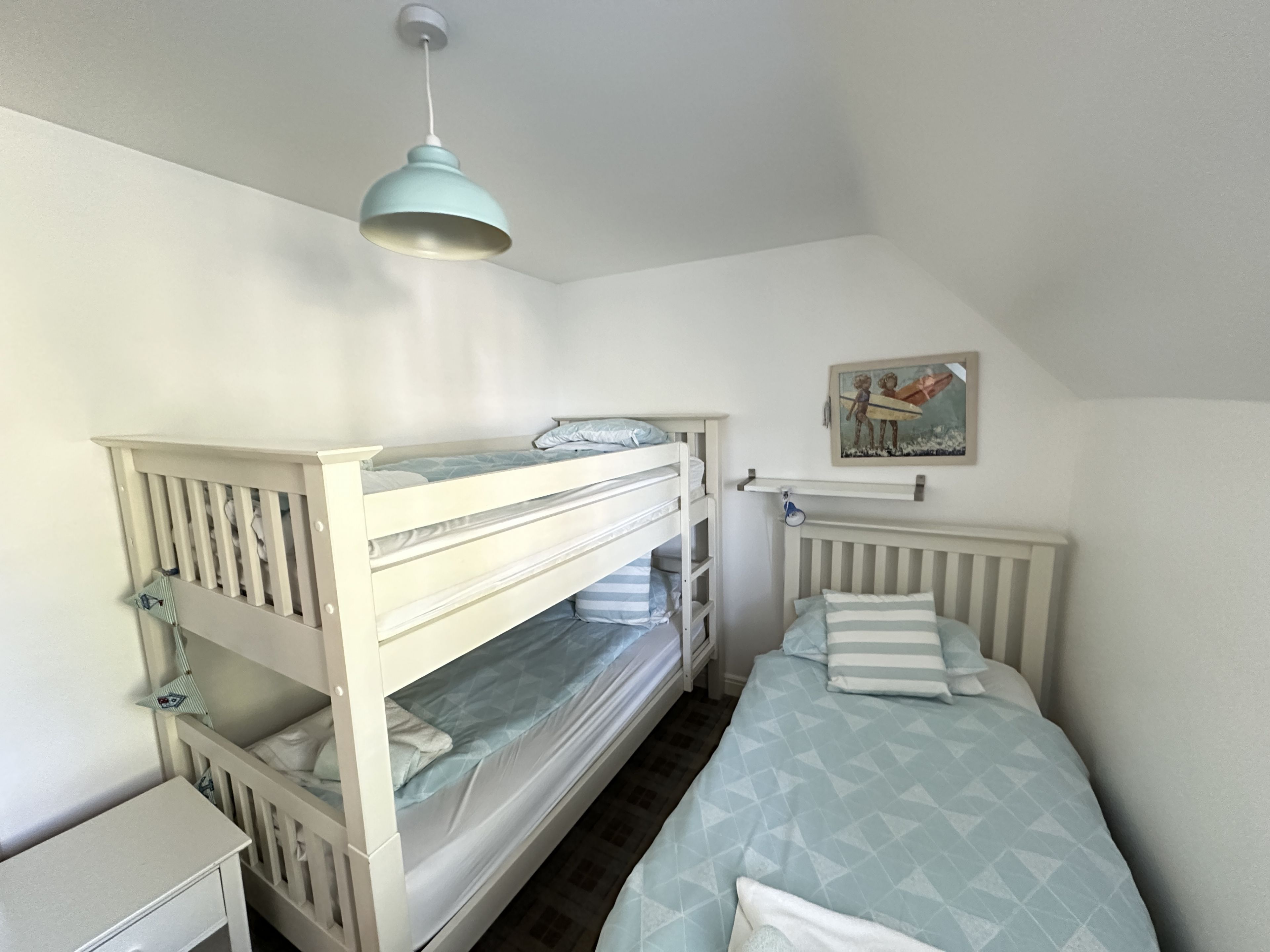 Upstairs the master bedroom includes a king size bed (from Feb 2024 (double until then)) and luxury En-suite with rainfall shower (New in 2021). The second bedroom has two single beds and a bunk over one of them with access to the family bathroom with bath and overhead rainfall shower.