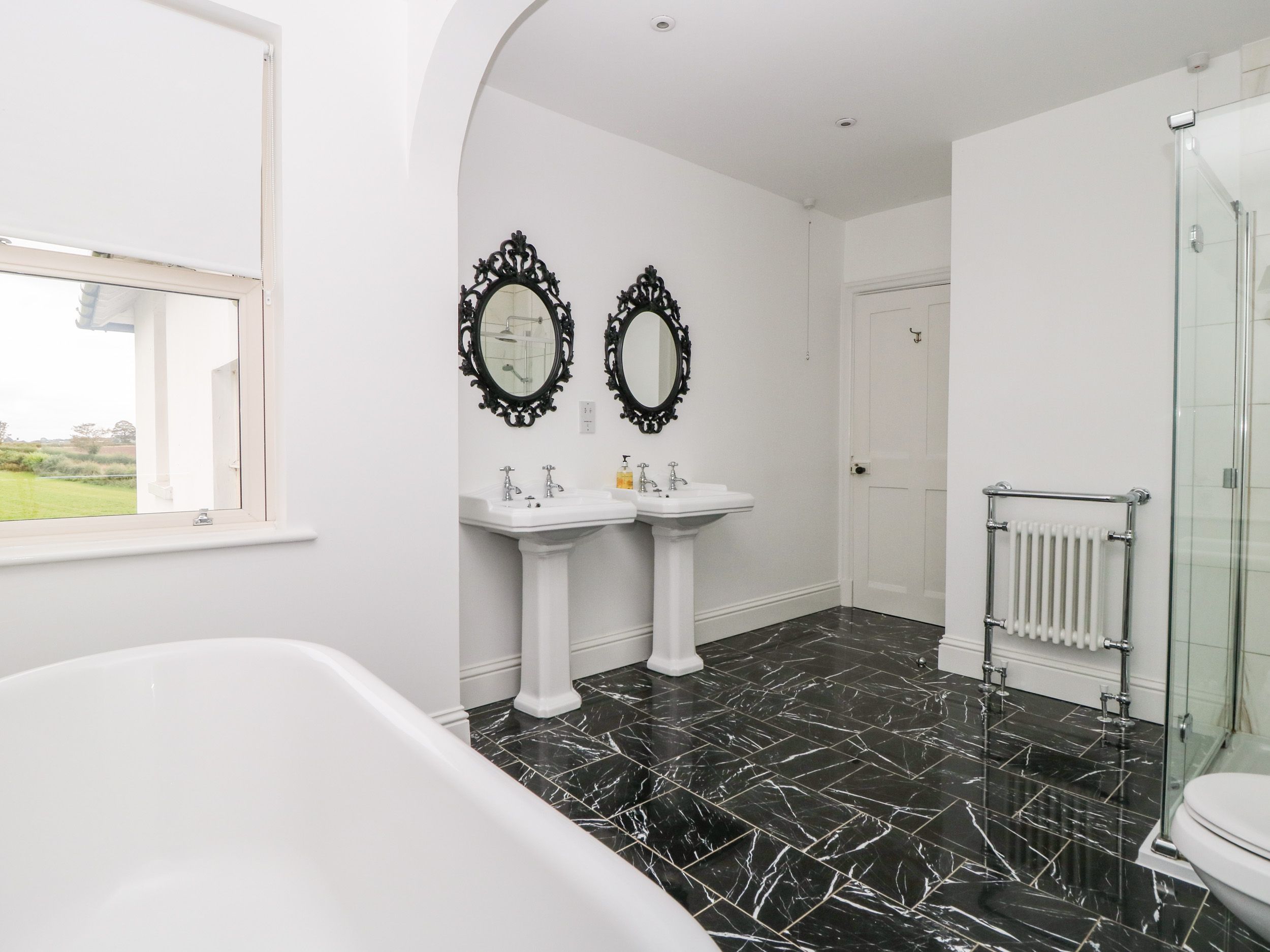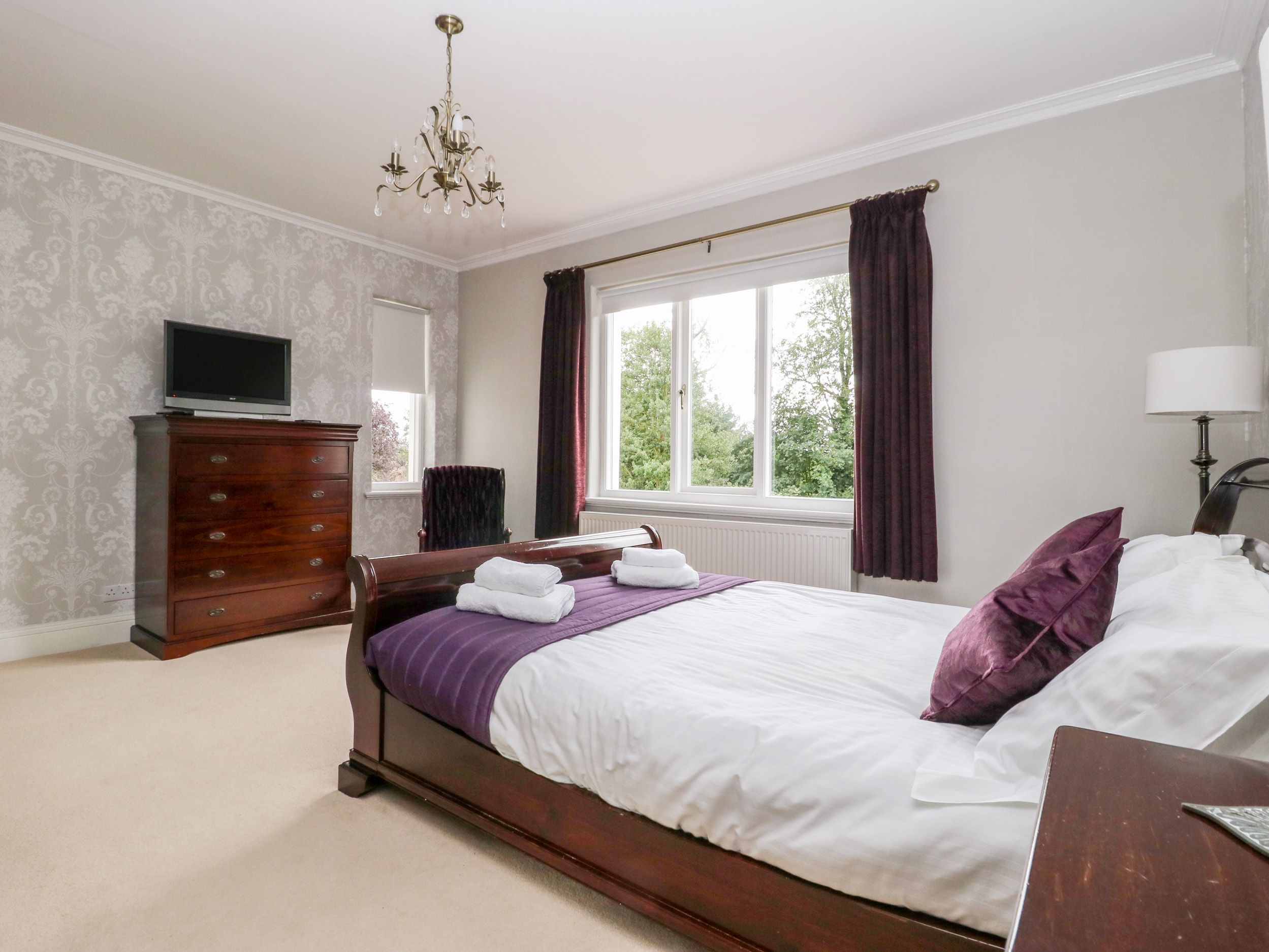Accomodation Details Five bedrooms: 1 x king-size with TV and walk-in wardrobe with en-suite wet room shower, 2 x basin and WC, 1 x king-size with TV with en-suite shower, basin and WC, 1 x king-size, 1 x double and 1 x twin. Bathroom with bath, separate shower, 2 x basin and WC. Cloakroom with basin and WC. Open-plan living space with kitchen, dining area and sitting area with woodburning stove. 2 x sitting room with open fire. Study