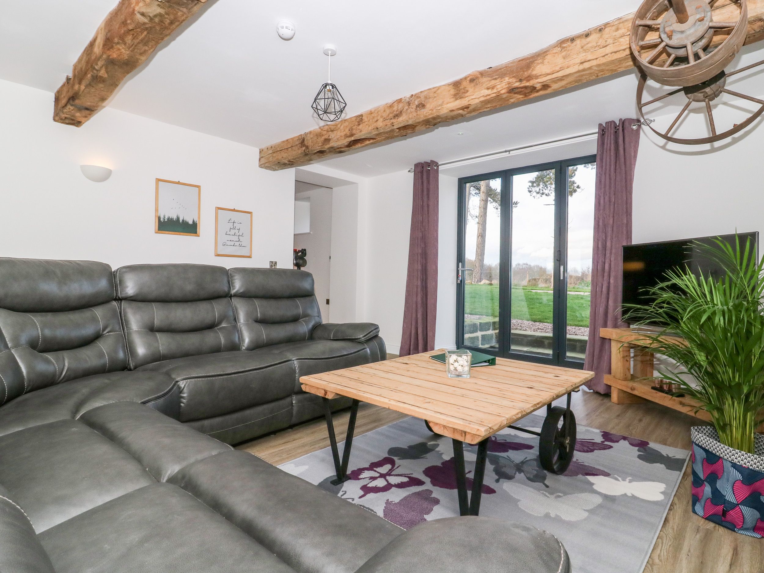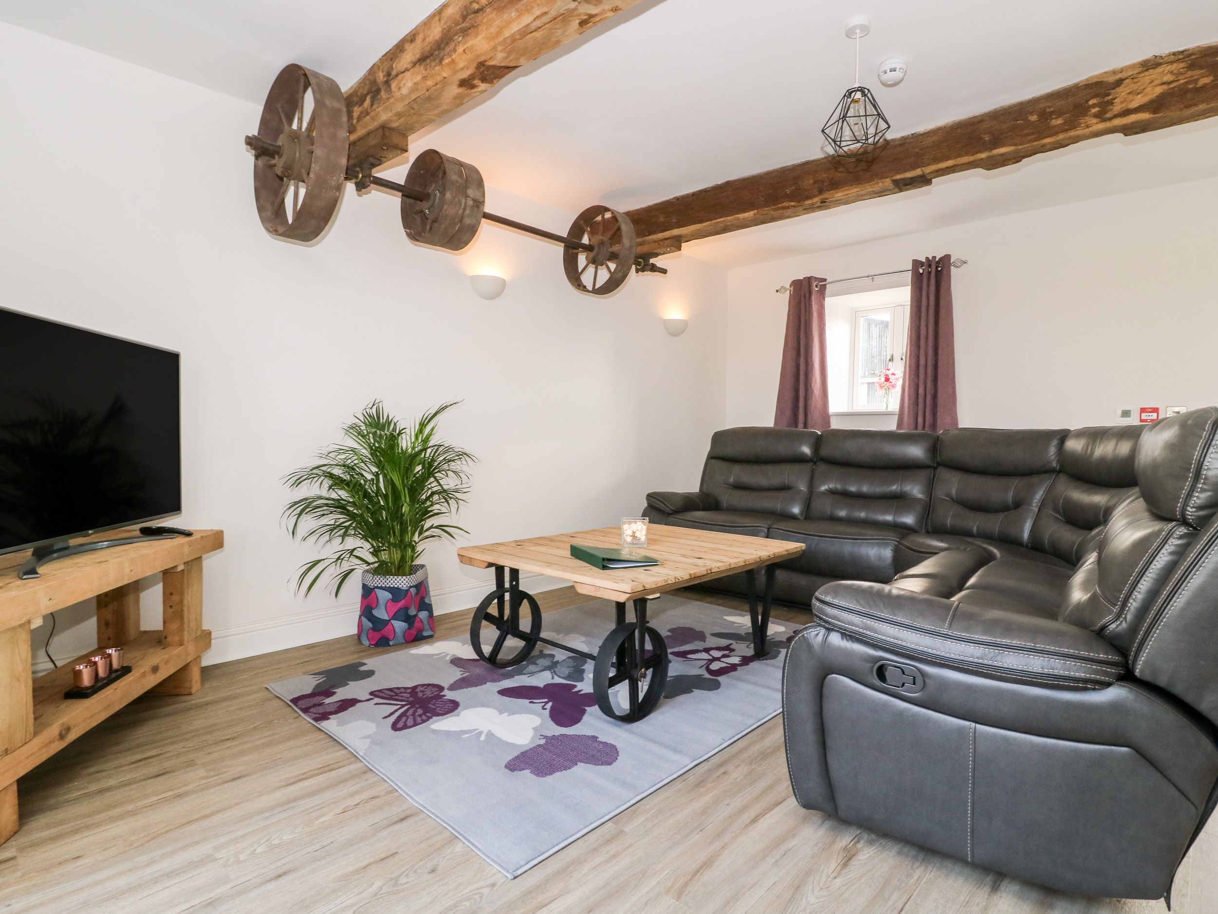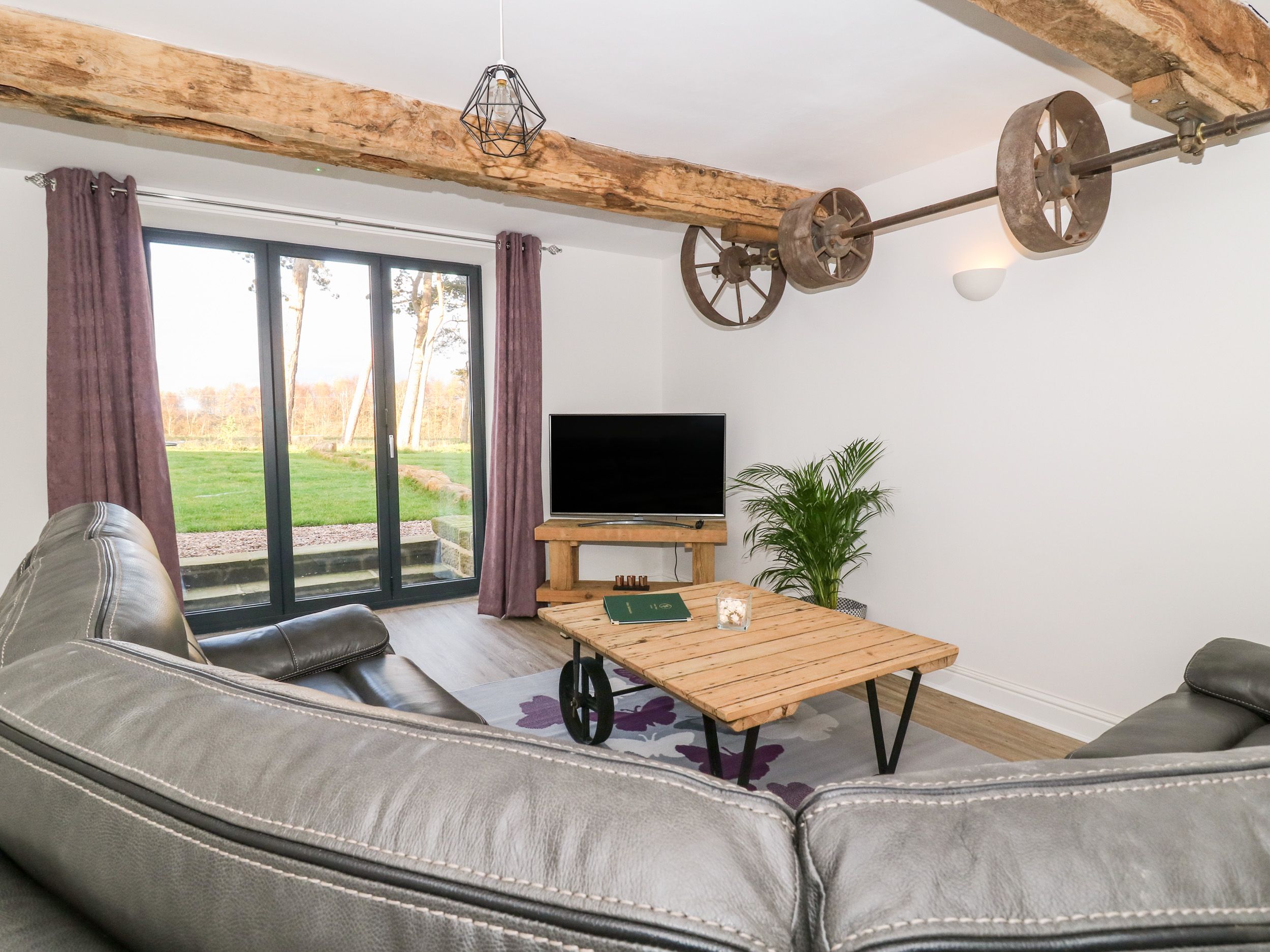 Holiday home Miller's Wheel is a superb barn conversion resting in Follifoot near Spofforth, North Yorkshire. There are two bedrooms in the property sleeping five guests, made up of a family room with a super-king-size (zip/link, twin on request), a single and a cot with an en-suite bathroom, and a super-king-size with an en-suite shower room. There is also a cloakroom and an open-plan living space with a kitchen, dining area and sitting area. Outside you will discover ample off-road parking with an electric car charging point, a private patio with furniture, and a rear lawn with a pagoda and furniture. Miller's Wheel is an exceptional choice for an escape to explore the Yorkshire Dales with friends or family. Property is accessed down a farm lane which drivers need to take at a steady pace.