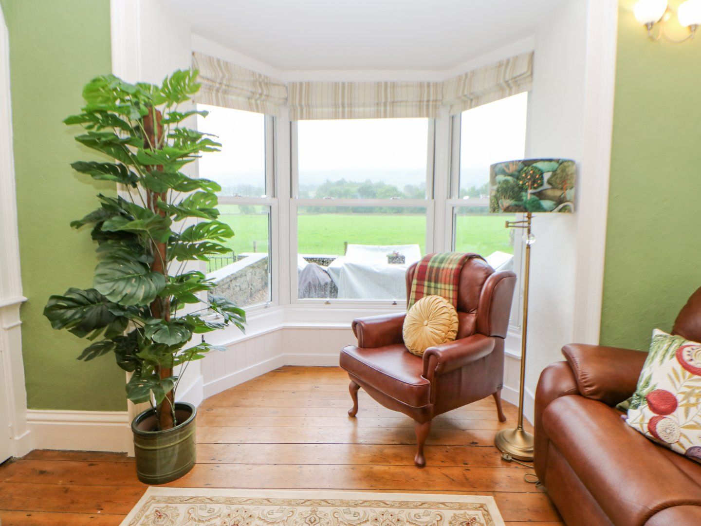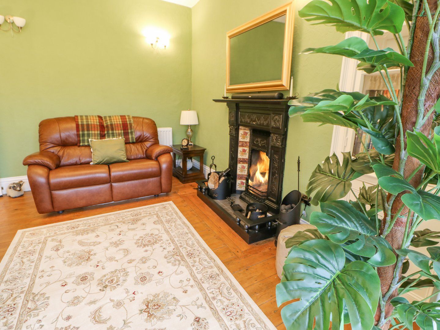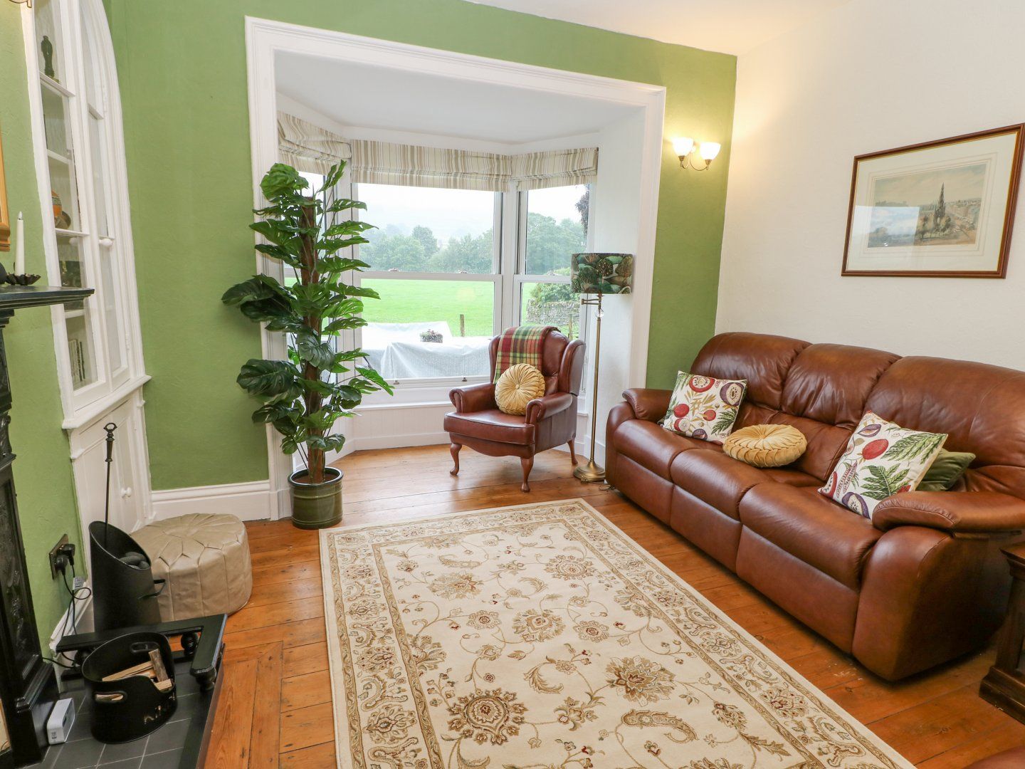 Sitting room with open fire, mirror Smart TV and open countryside views.
