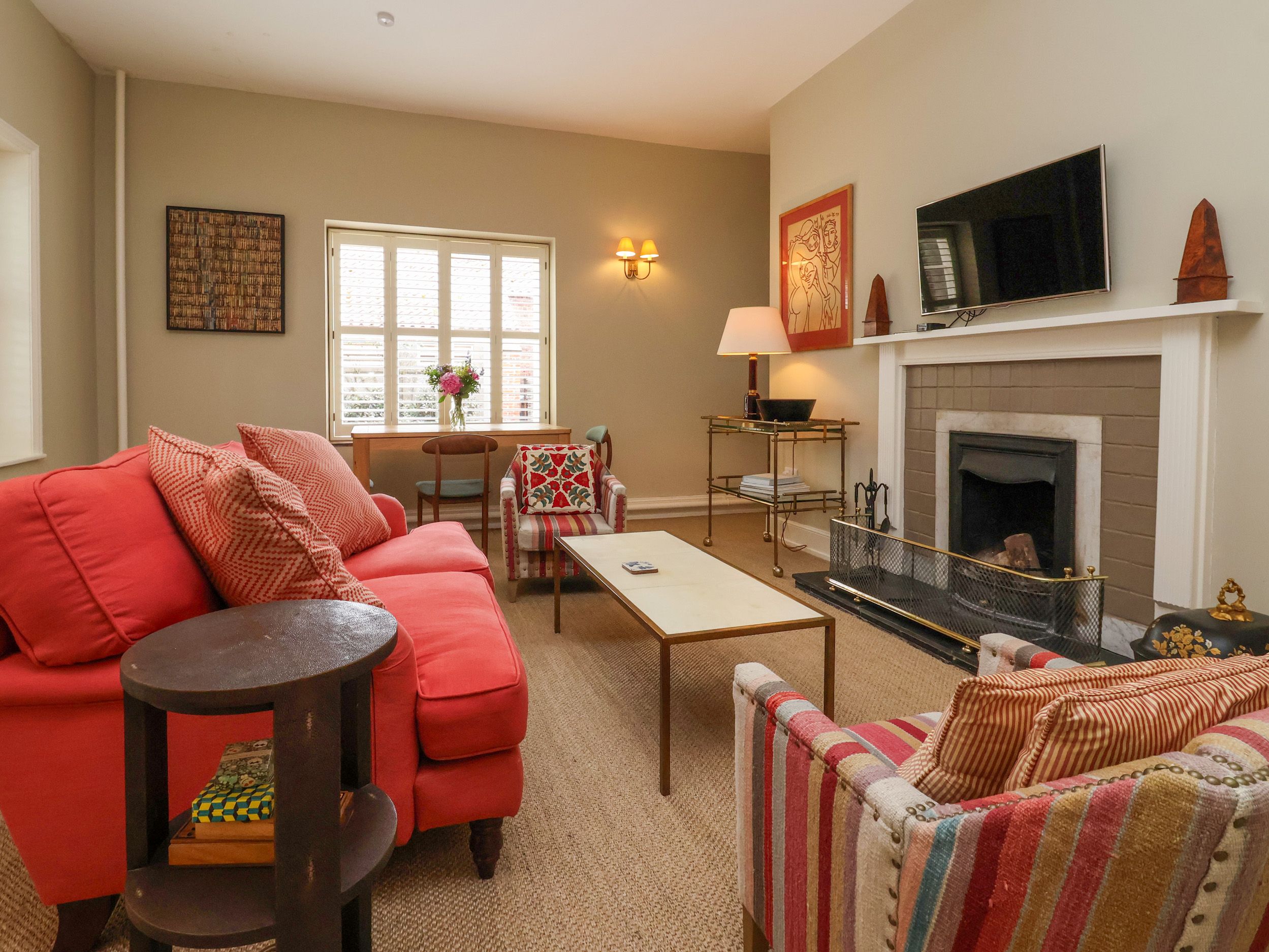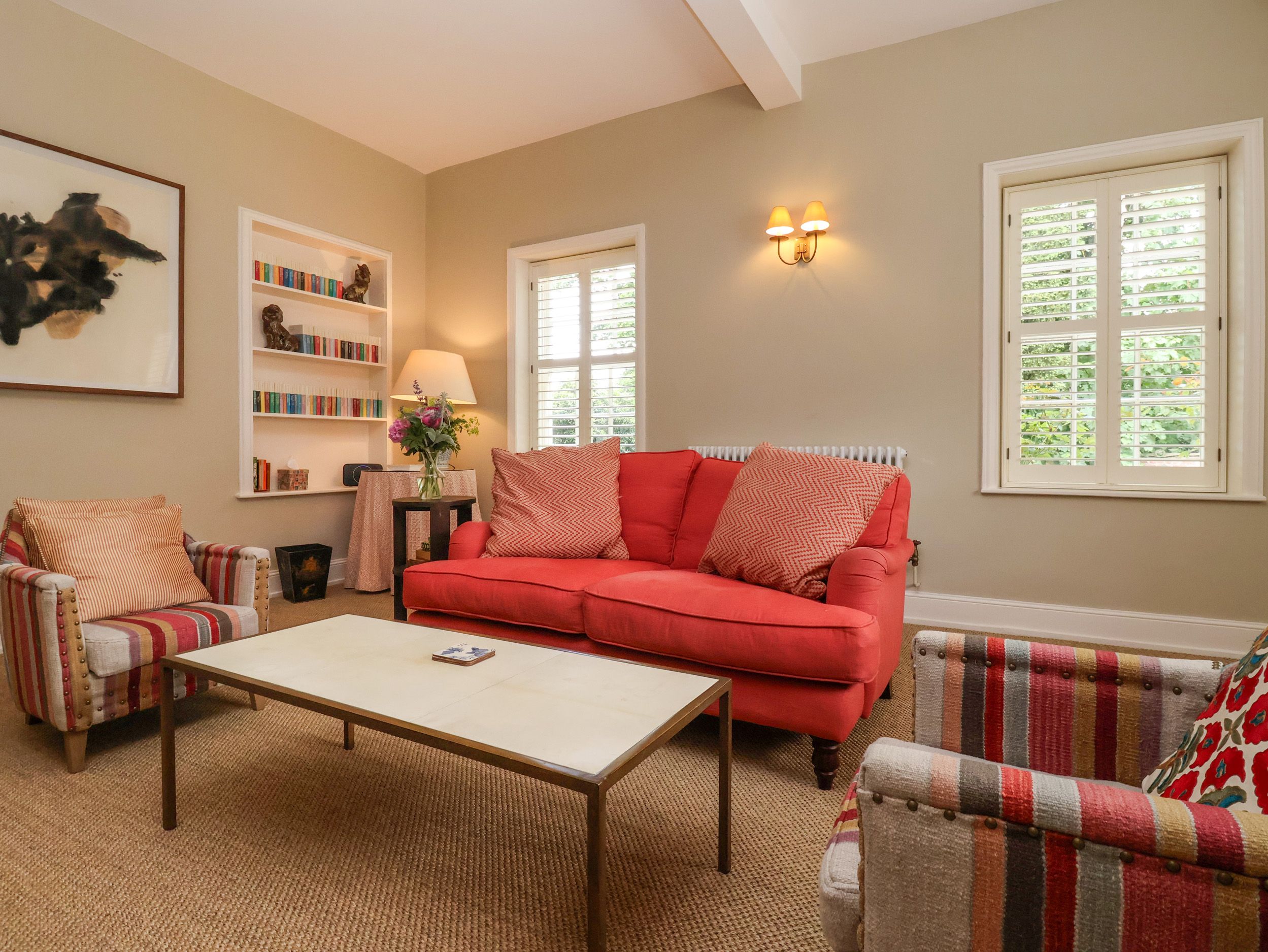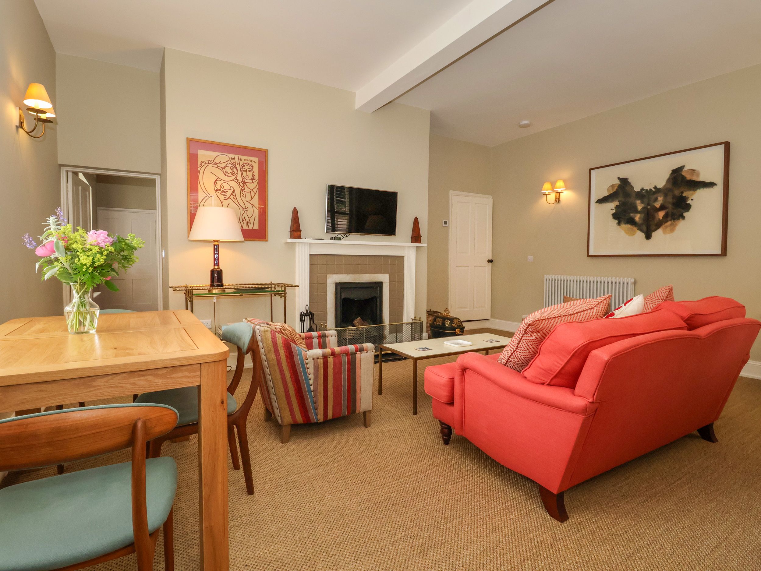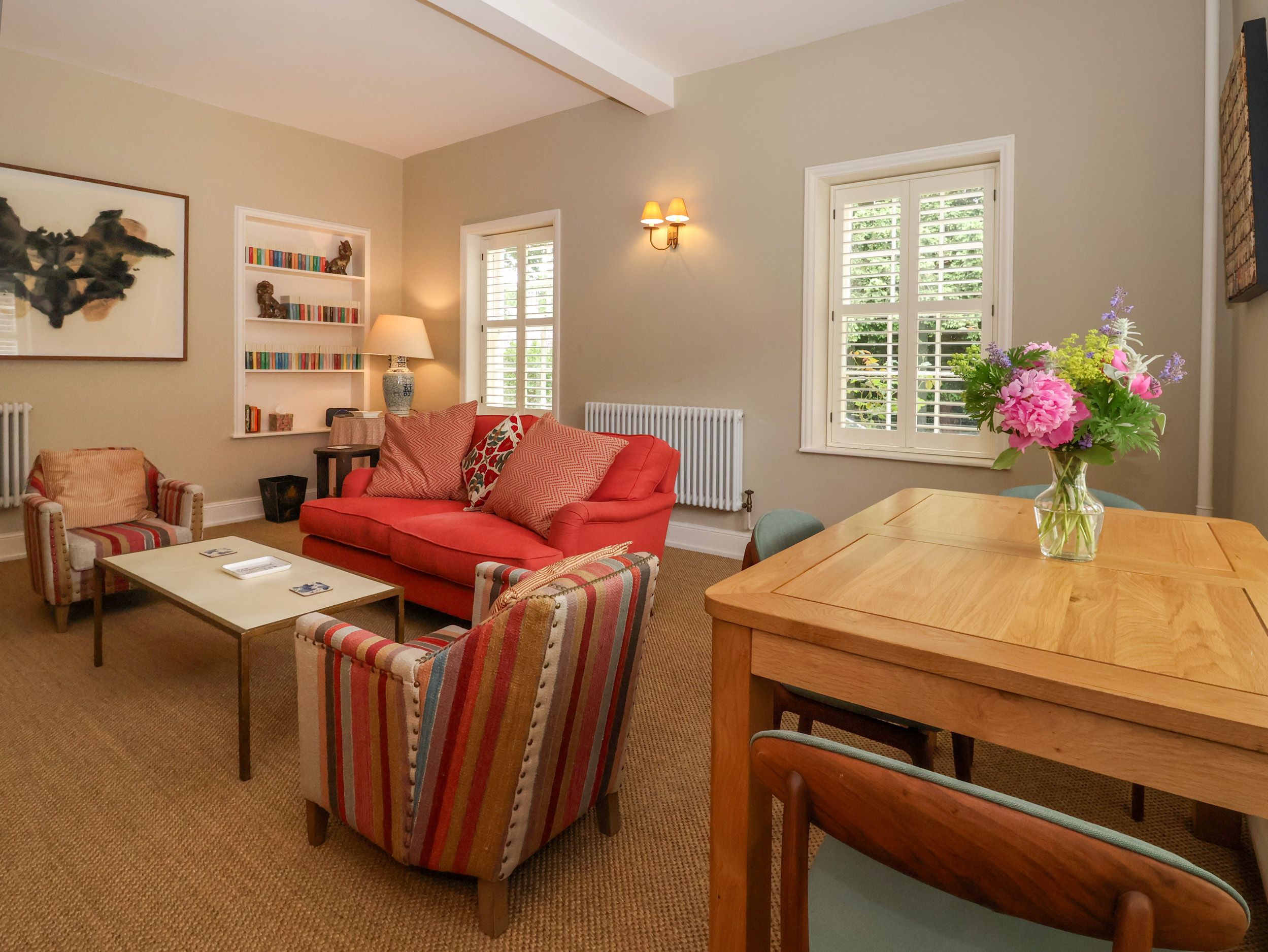 Amenities Central heating. Electric oven, hob, microwave, fridge/freezer, kettle, toaster. TV with Apple TV, WiFi. Fuel, power, and starter pack for open fire, inc. in rent. Bed linen and towels inc. in rent. Off-road parking for 1 car. Enclosed rear patio with gravelled area, barbecue and 2 x sun loungers. Access to award-winning estate gardens and 50-acre parkland. Two well-behaved dogs welcome. Sorry, no smoking. Shop and pub 1.4 miles