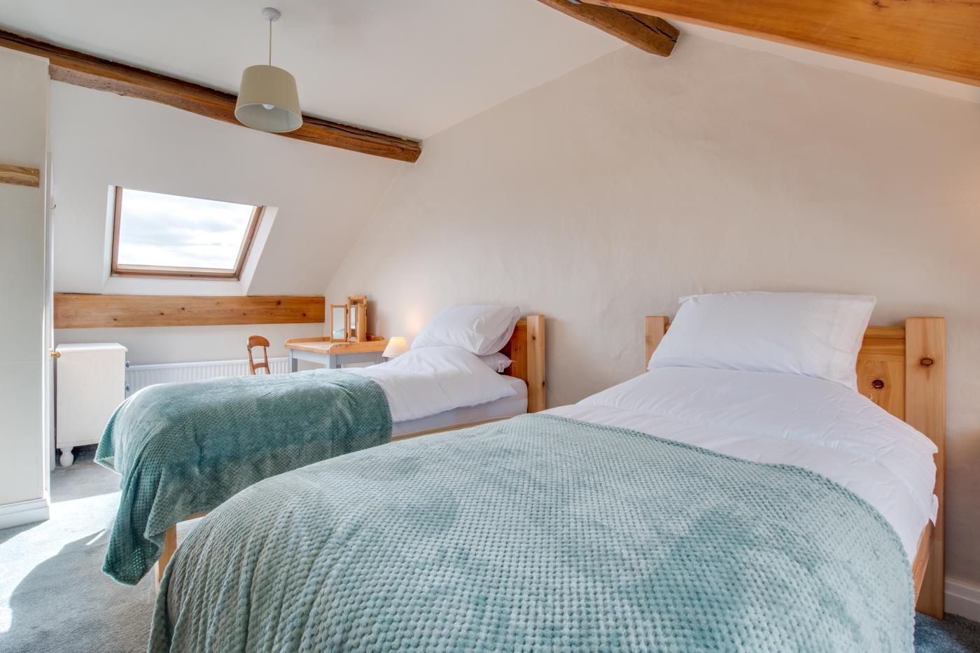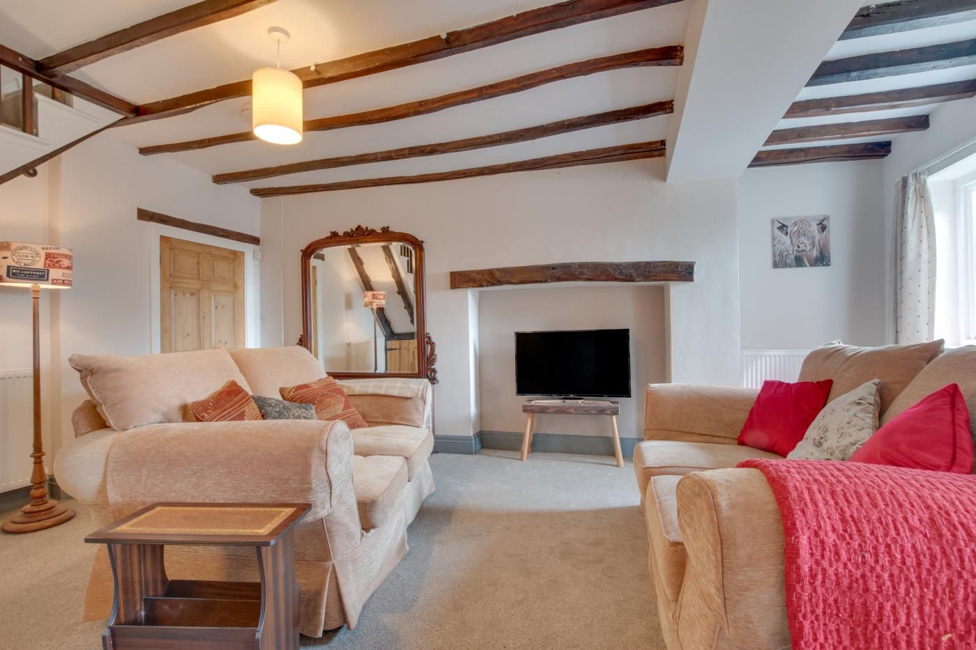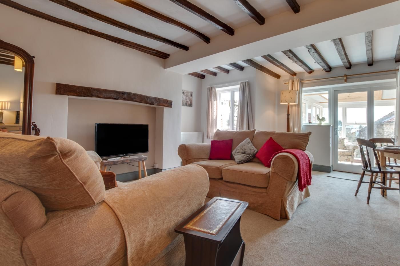Step inside to find a bright and homely open-plan living space with neutral tones, a wooden beamed ceiling and plenty of natural light.