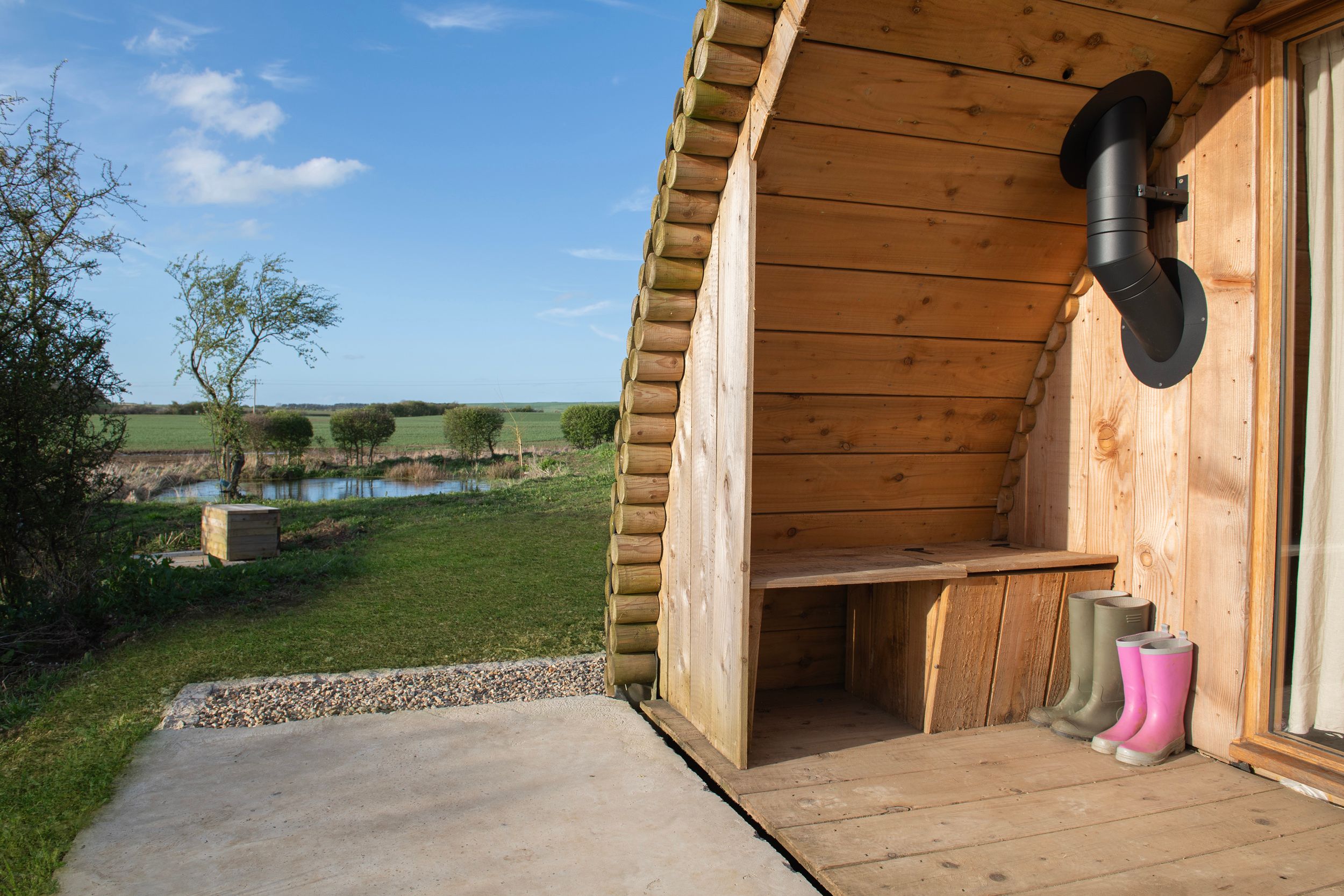 Holiday home Glamping Pod 5 Shelter, a single-storey hut consists of studio-style living space including double bed, kitchen with a mini oven, microwave, fridge with ice box, kettle, toaster, dining area, and sitting area with woodburning stove. There is also a shower room. Outside, there is a non-enclosed wraparound patio garden with furniture, Big Green Egg barbecue,hot tub, and pizza oven. Sorry, no pets and no smoking. Shop and pub 1 mile, beach 2.5 miles. WiFi, fuel, power, starter pack for woodburning stove, bed linen, and towels are all included in the price. Glamping Pod 5 Shelter makes a splendid base for a rural retreat with your loved one. Note: There is a communal outdoor kitchen area with an open fire pit and pizza oven. Note: This property does not accept children. There is a pond on site, please be cautious