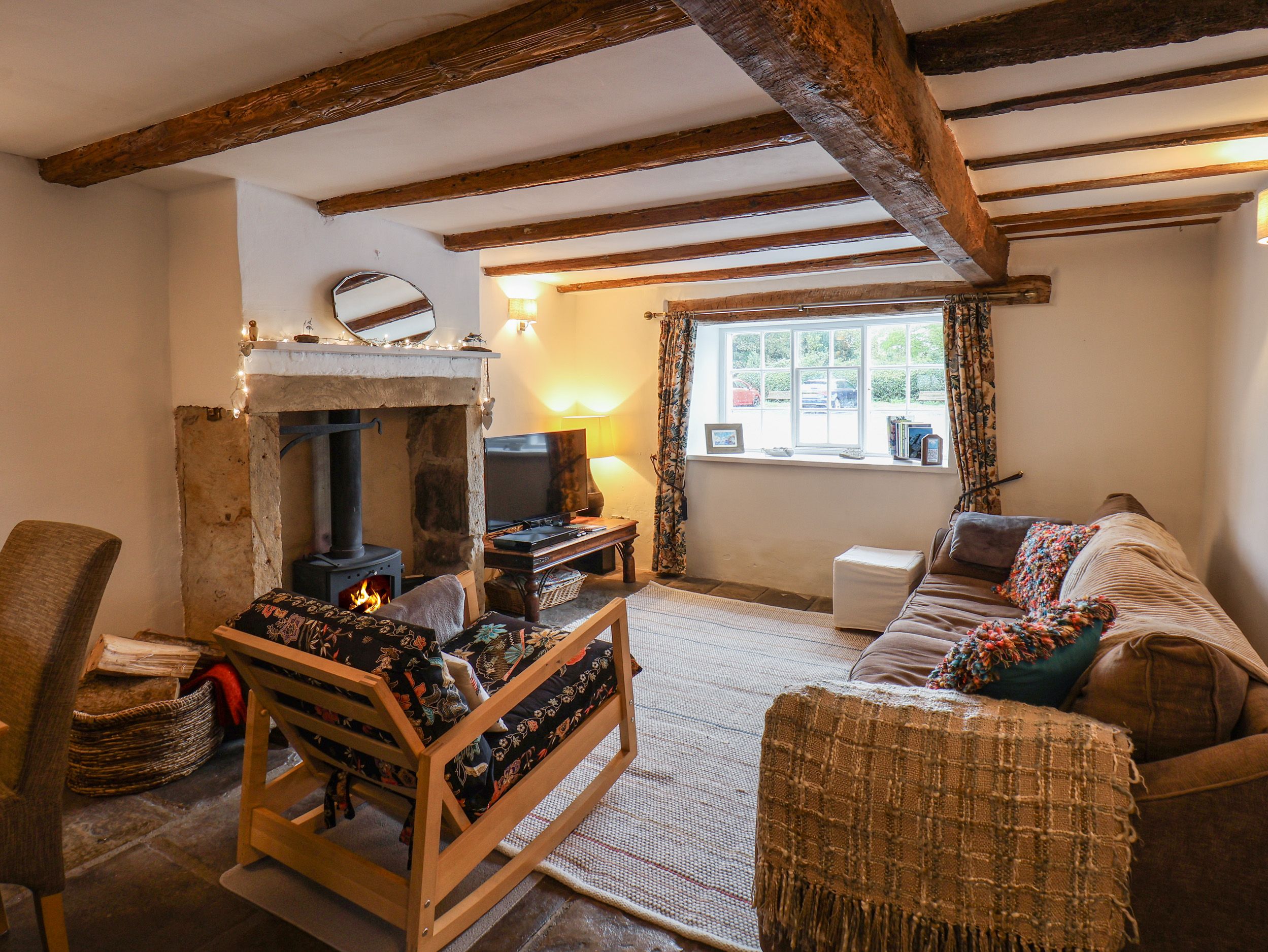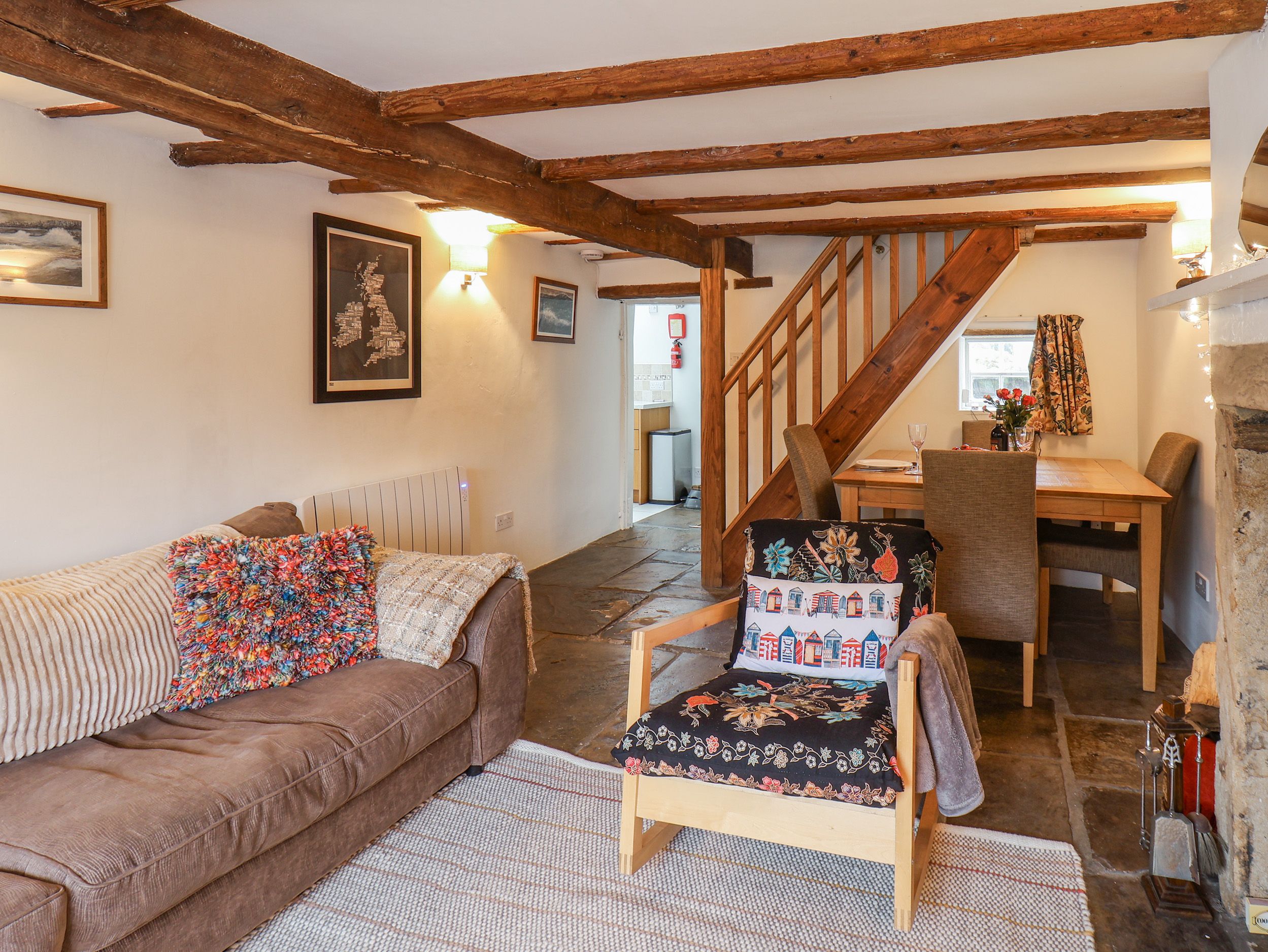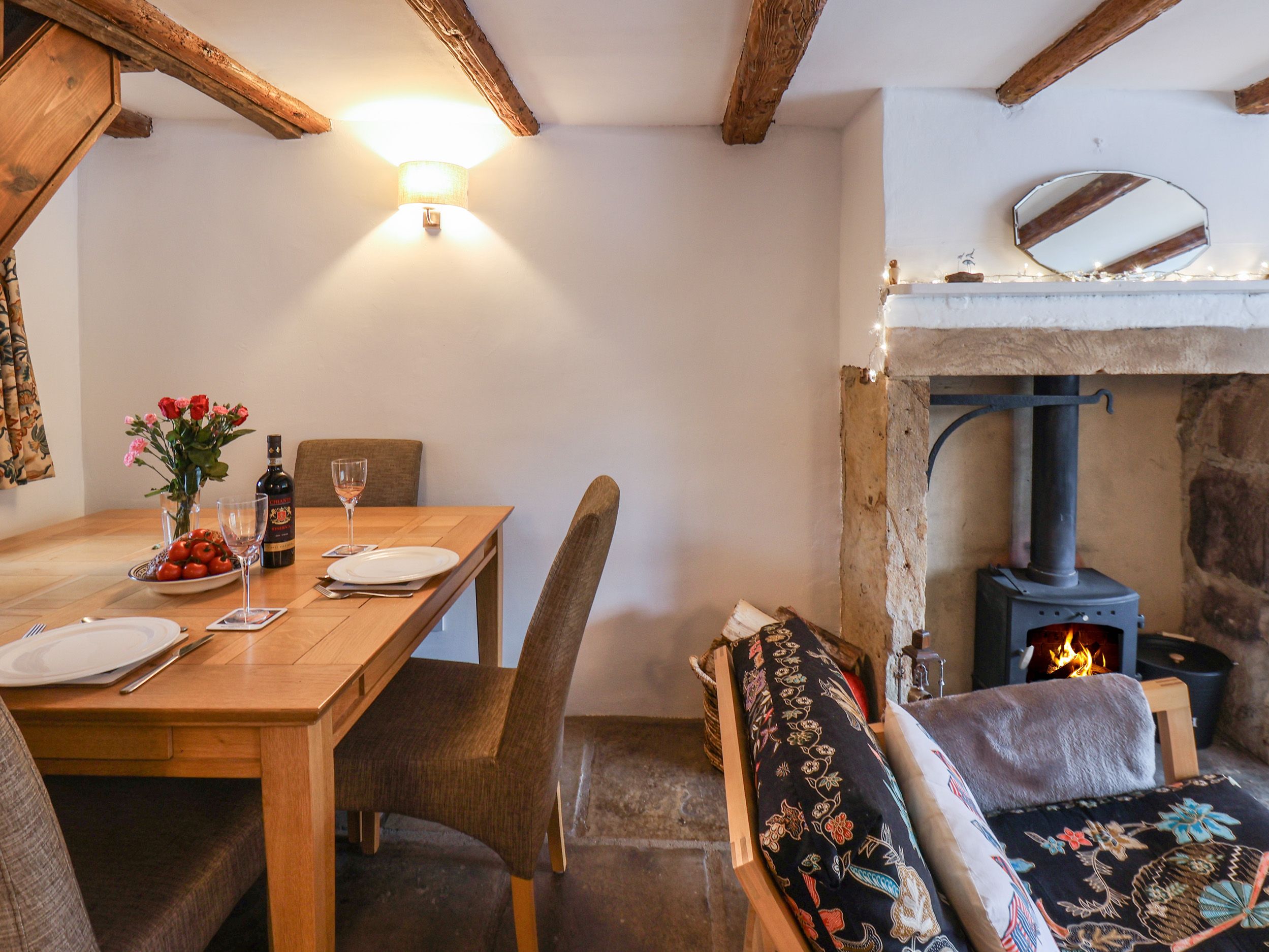 Lythe Cottage has a kitchen with electric oven and 2-ring hob, microwave, fridge with ice box and a washing machine, a living/dining room with dining seating for two guests, a Smart TV and woodburning stove. There is one king-size bedroom, serviced by a shower room. Outside there is an allocated parking space for one car. Within 0.1 miles you will find a shop and pub, and beach in 1.1 miles, and please note that this is a non-smoking property. WiFi, fuel, power, bed linen and towels are all included in the price, along with a starter pack for the woodburning stove. Lythe Cottage is a lovely base for your next adventure in North Yorkshire. Note: The stairs leading to the first floor are quite steep and may not be suitable for guests with lower mobility. Note: The property is located on a busy road, please ensure pets are supervised. Note: There are low beams on the ground floor, please take care. Note: There is a bus stop with easy links to Sandsend and Whitby, less than 100m away.