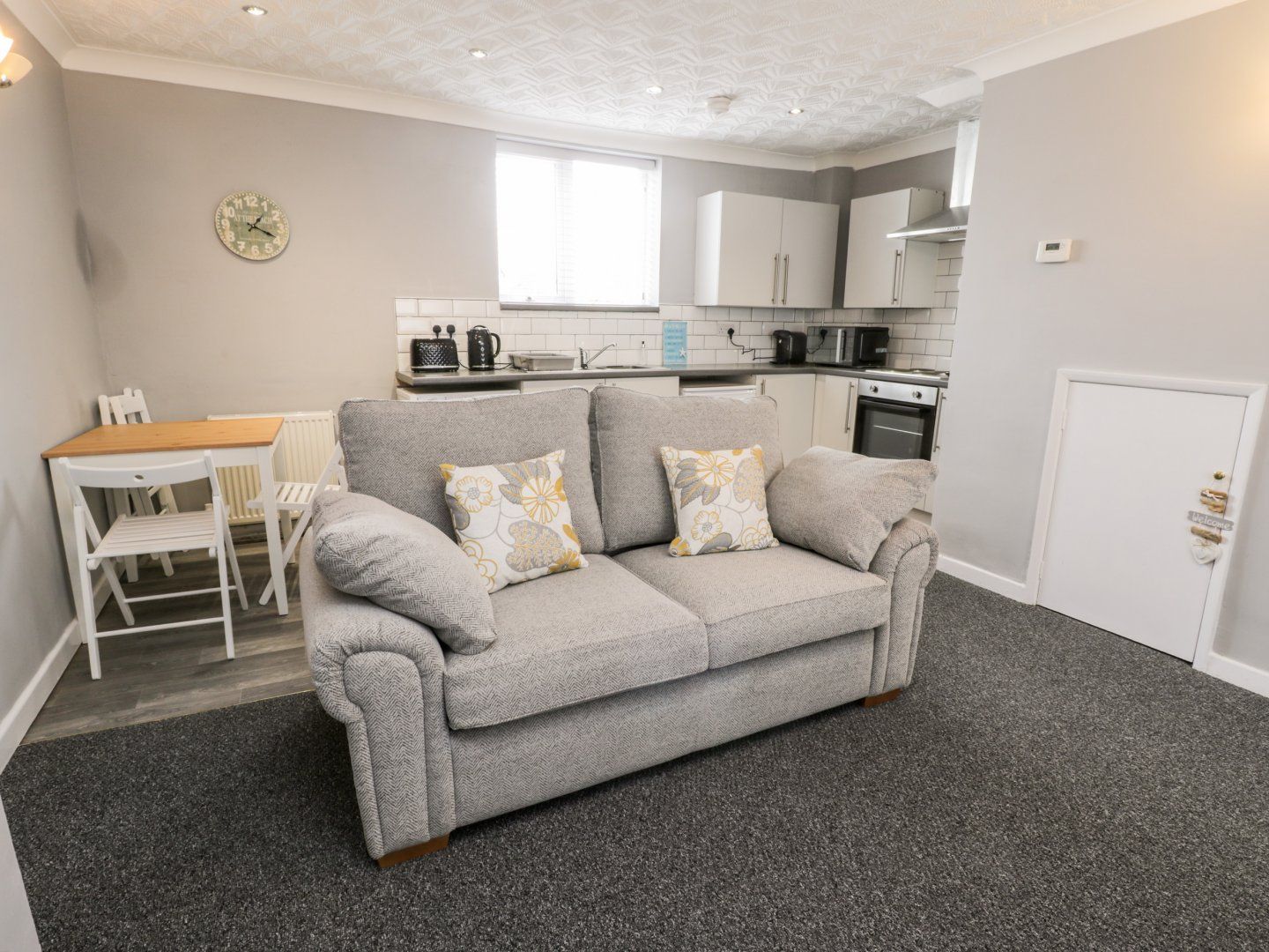 One double bedroom. Bathroom with bath, shower over, basin, heated towel rail and WC. Open-plan living space with kitchen, dining area and sitting area