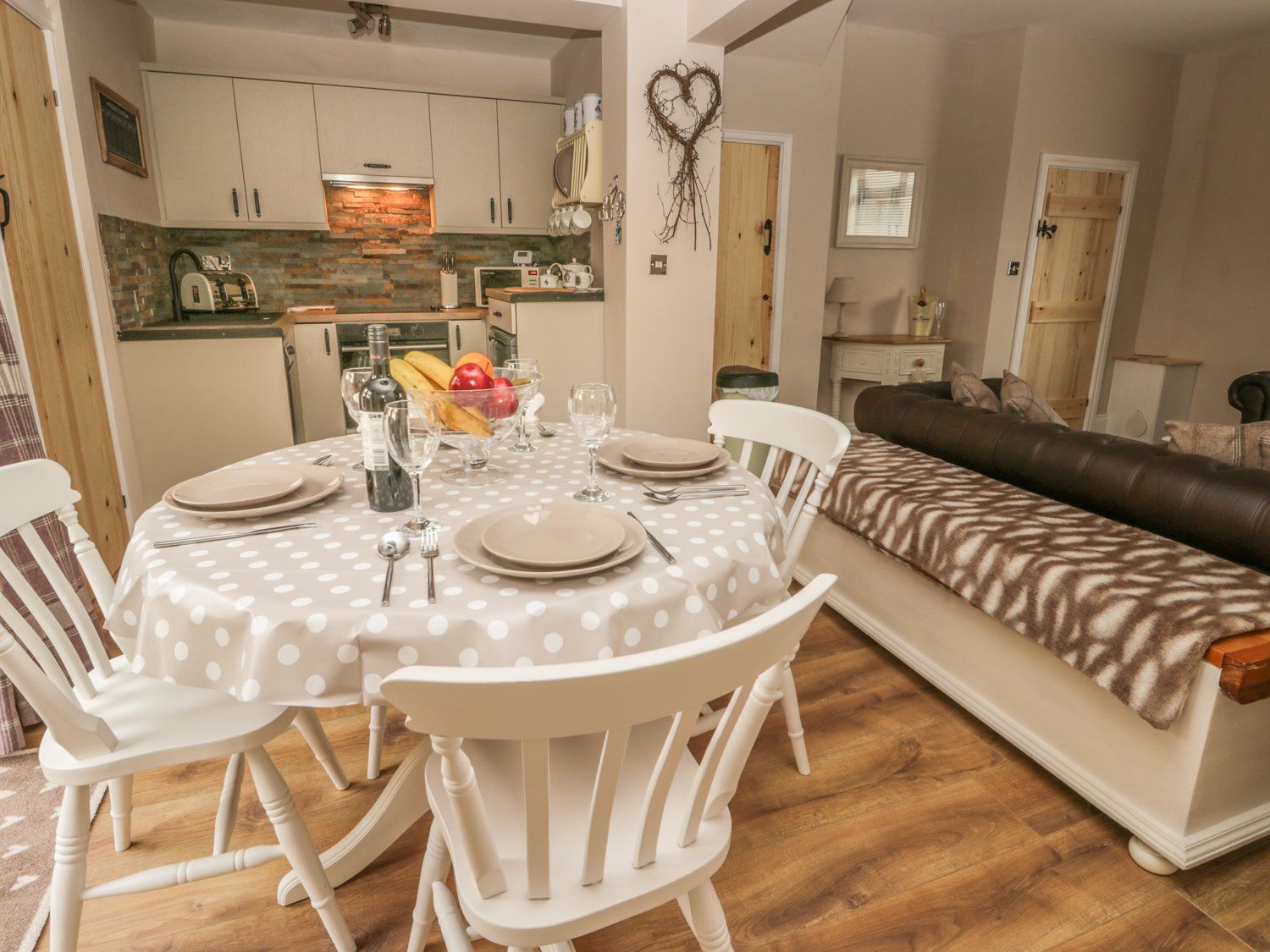 Three bedrooms: 2 x doubles, 1 x single. Bathroom with bath, separate power shower, basin and WC. Open plan living area with kitchen, dining area and sitting area with woodburner. Utility room. Open outdoor space.
