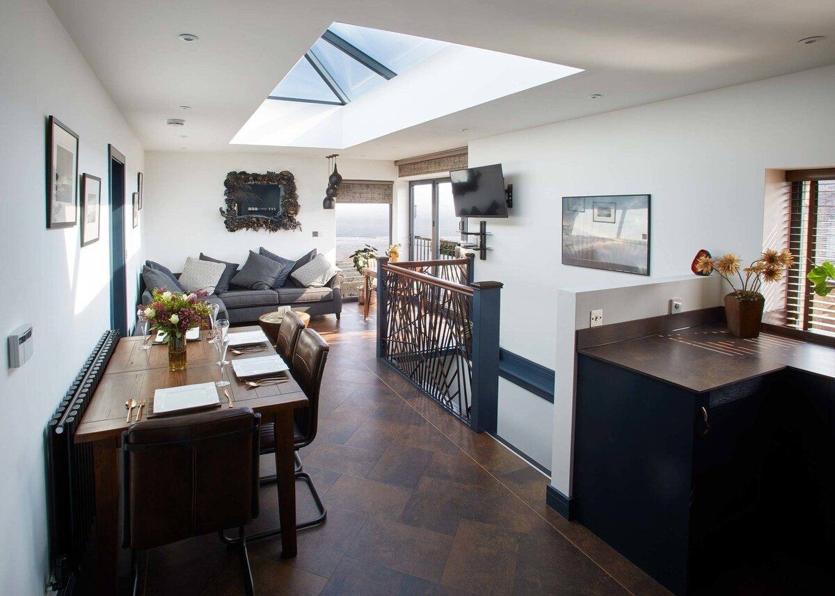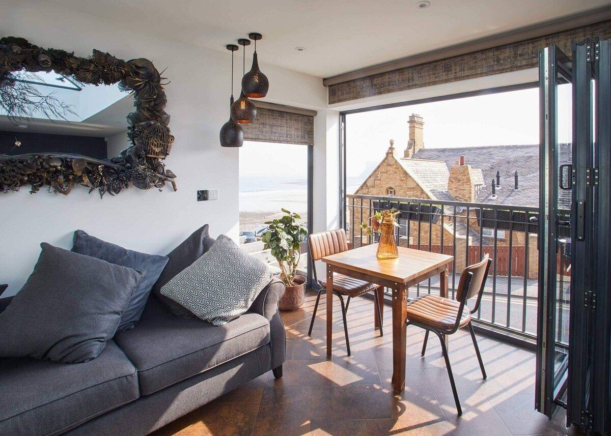 Built in 1862, this character-filled home that was once a stable boy's accommodation is now a cosy and atmospheric 21st-century getaway. We love every irresistible inch, from the light-filled skylights and gorgeous sea views down to the glossy parquet floor. The sumptuous master bedroom is so stylish, it's hard to believe it's all upcycled from cladding and roof joists, and the master bathroom is even better. Relax with a soak in the lavish free-standing bathtub or rinse off under the rainfall shower. The living area is warm and incredibly comfortable. In the mornings, open the bi-fold doors and sip your coffee on the Juliet balcony, watching the ocean waves from the floor-to-ceiling windows. After a tasty breakfast rustled up in the blue kitchen, head up to the roof terrace to soak up the sunshine. Decked out with lush greeny and a barbecue, you'll want to spend every minute you're not at the beach sitting up here, enjoying alfresco meals and sipping cocktails as the sun sets over the water. Speaking of the sea, it's just a five-minute walk down to the beach or into town, where you can snack on fish and chips and grab a pint at one of the local pubs. Shopaholics can browse Saltburn-by-the-Sea's independent boutiques, keen hikers can walk along the Cleveland Way or for a more leisurely pace, just stroll along the Victorian pier, relishing in the salty sea air.