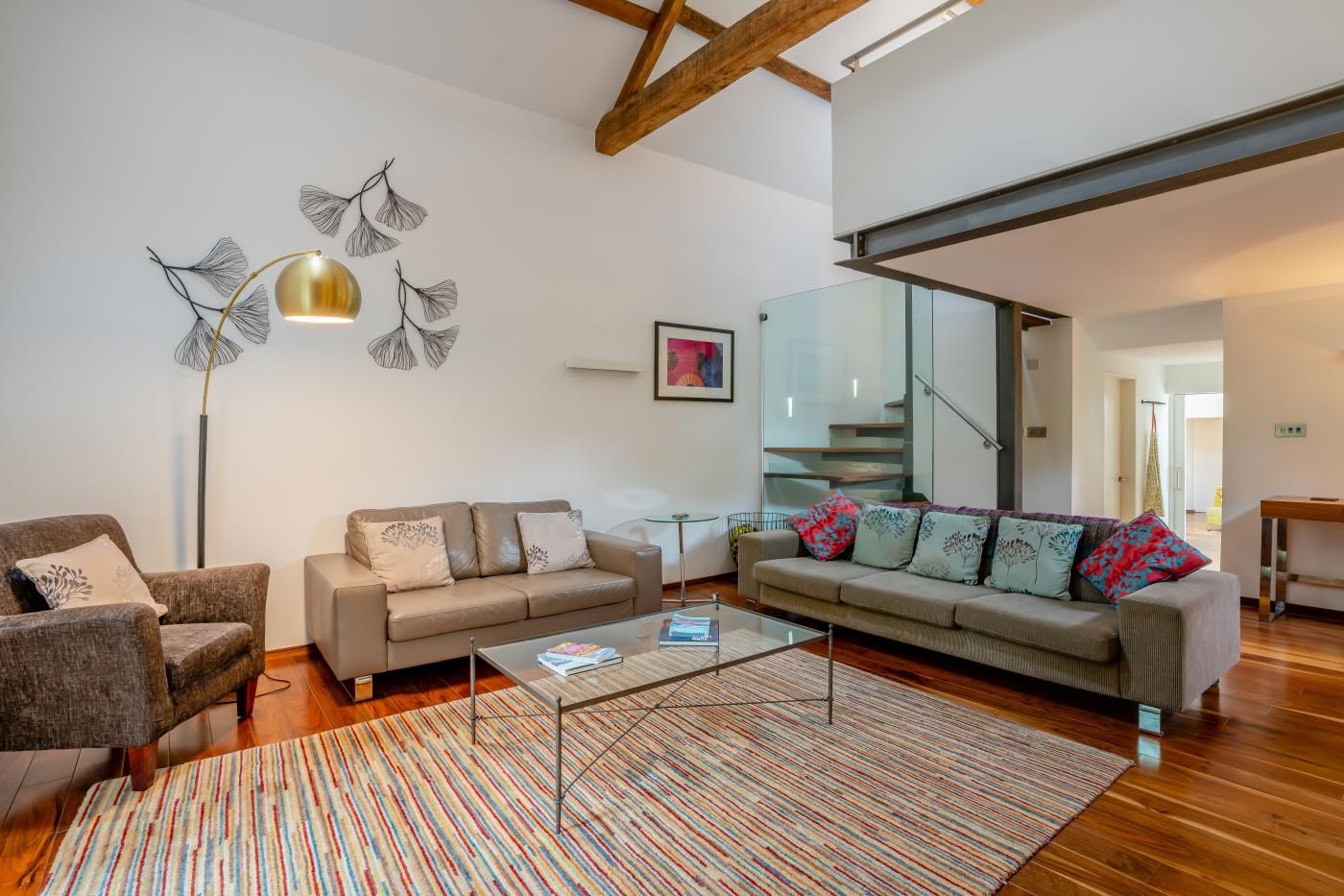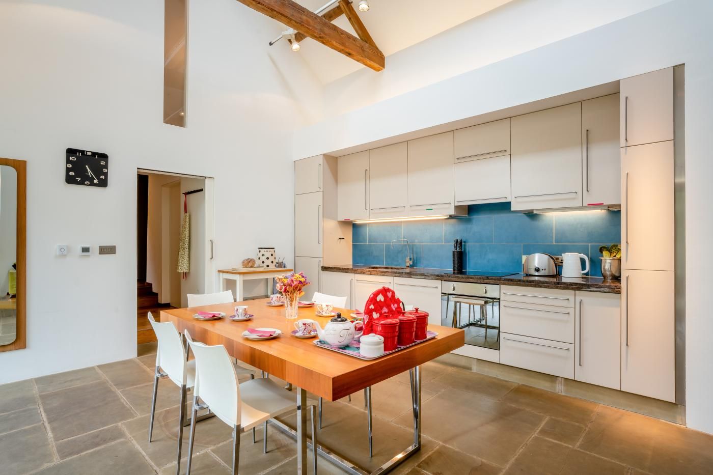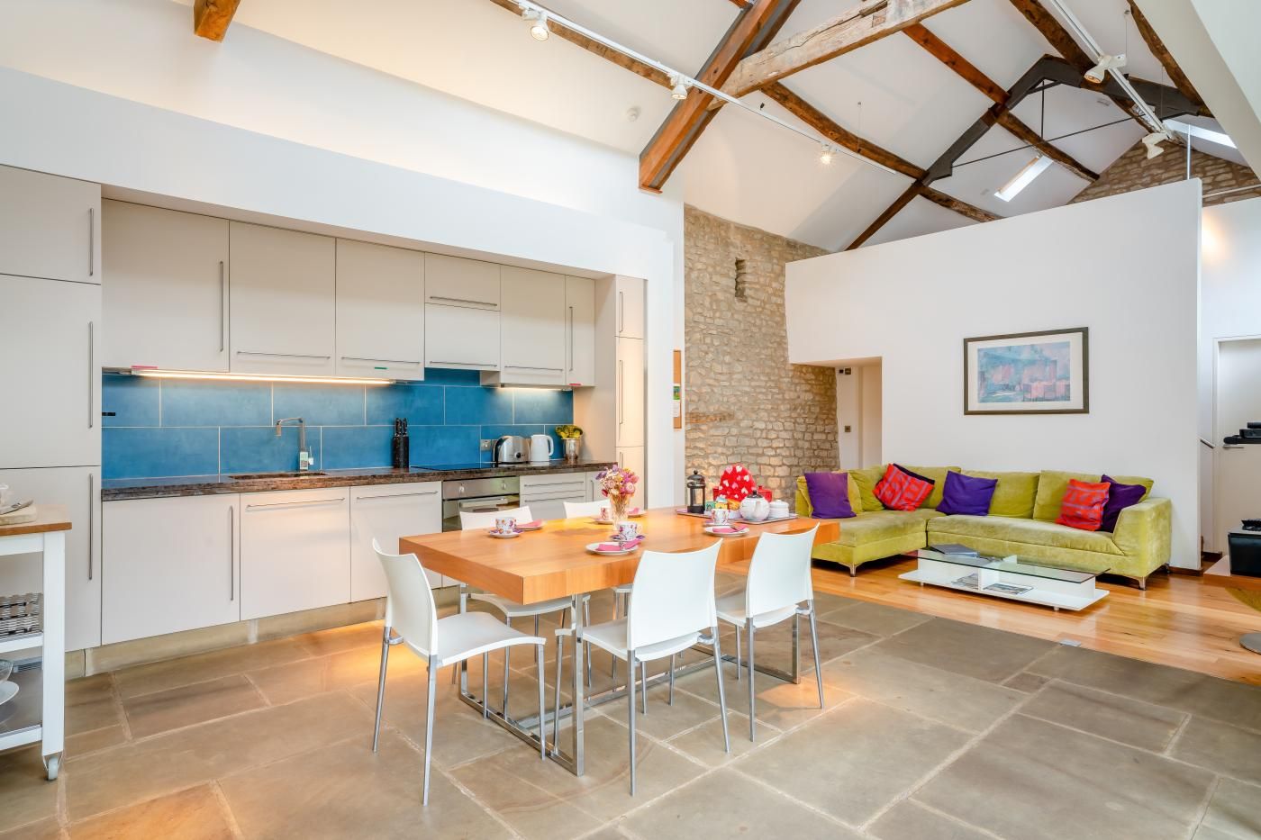 Escape to the North Yorkshire countryside with a small group of friends or family for a relaxing break in a sleek and contemporary converted barn with a sociable and bright open-plan living space boasting skylights, a warming wood burner and a stone feature wall.