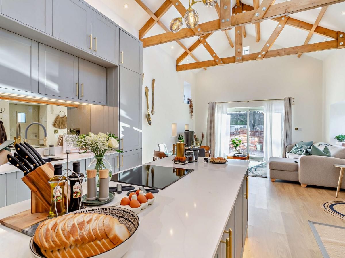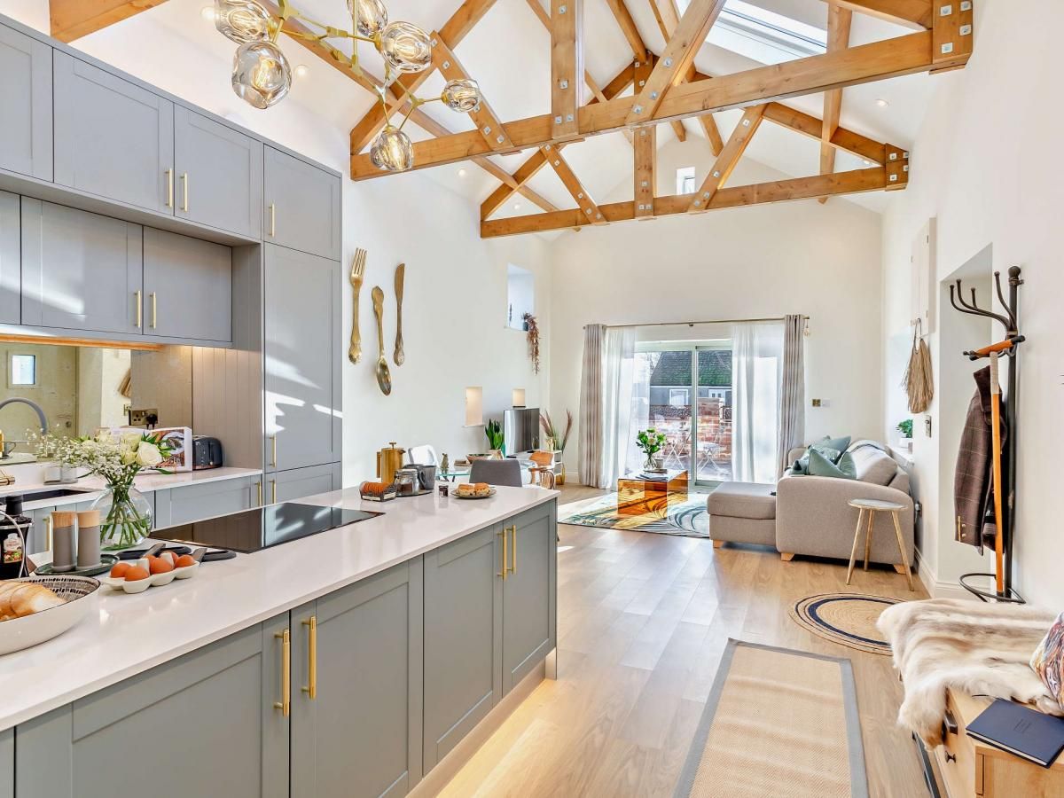 A double-height, gabled ceiling with magnificent exposed beams gives the open-plan living space of this converted farm building impressive style.