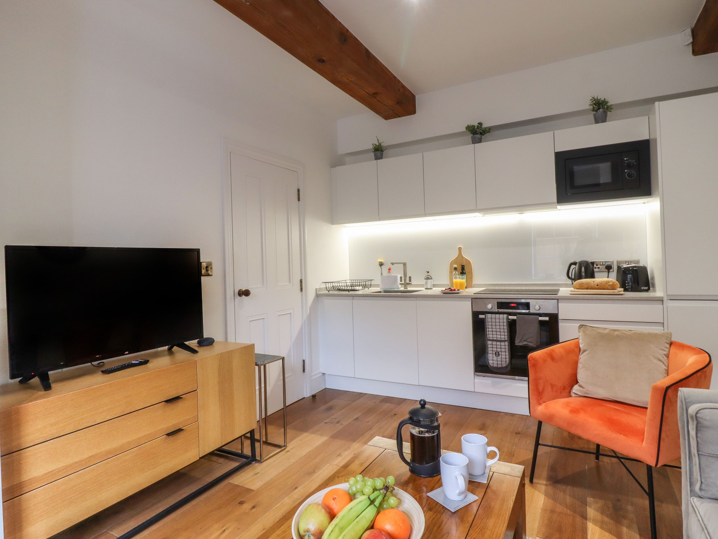 Over three floors. Two bedrooms: 1 x second-floor, mezzanine-style super-king-size (zip and link which can be separated into two single beds on request) with TV and en-suite walk-in shower, basin, and WC, 1 x king-size. Shower room with walk-in shower, basin and WC. Open-plan living space with kitchen, dining area and sitting area