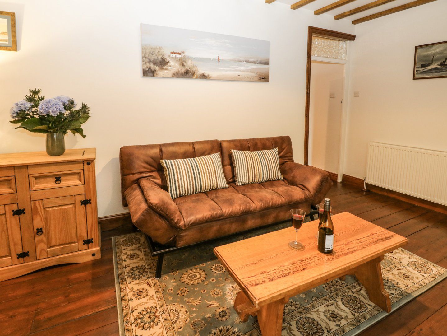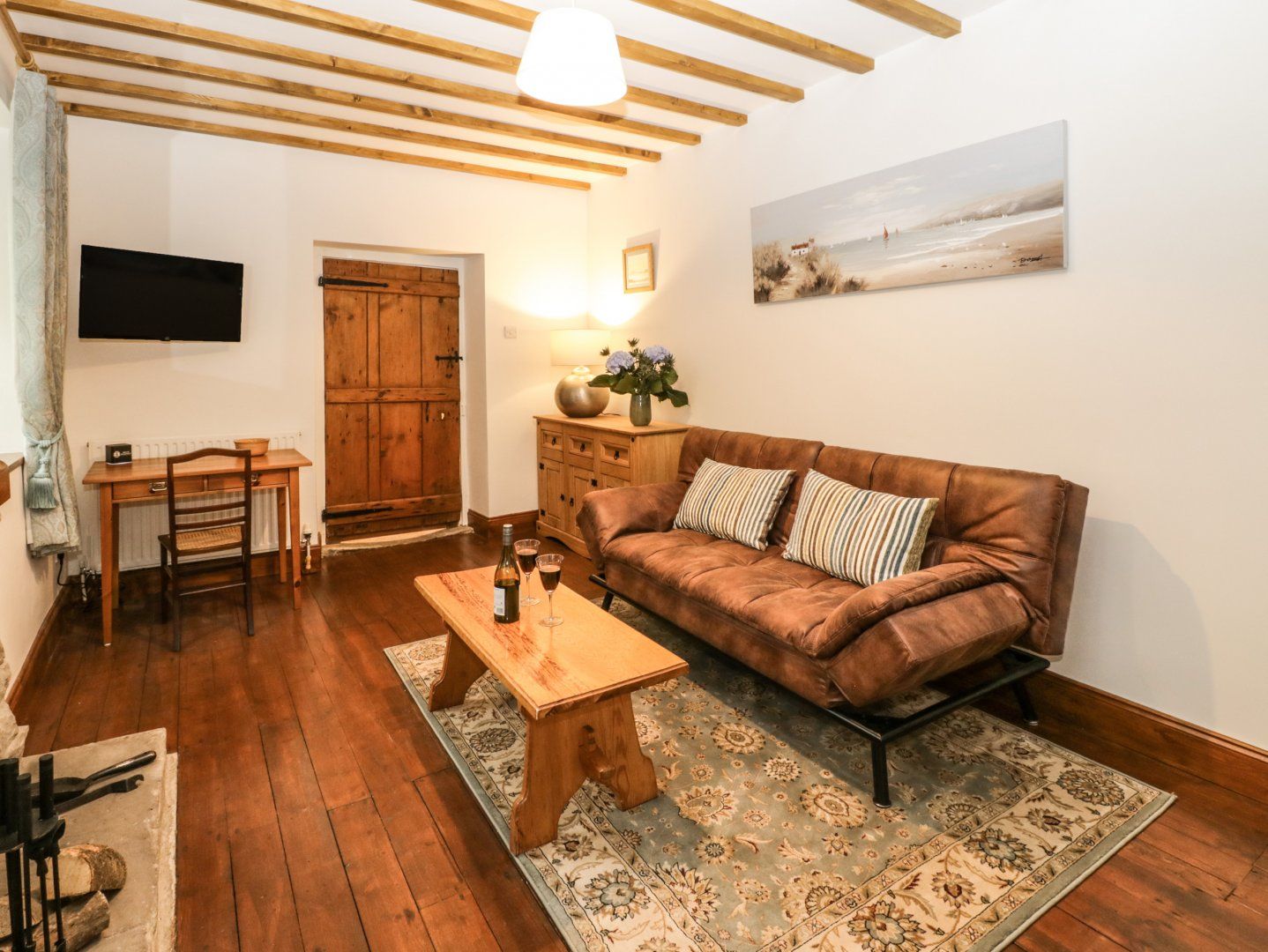 One bedroom. Shower room with walk-in shower, basin and WC. Kitchen/diner. Sitting room with sofa and woodburning stove