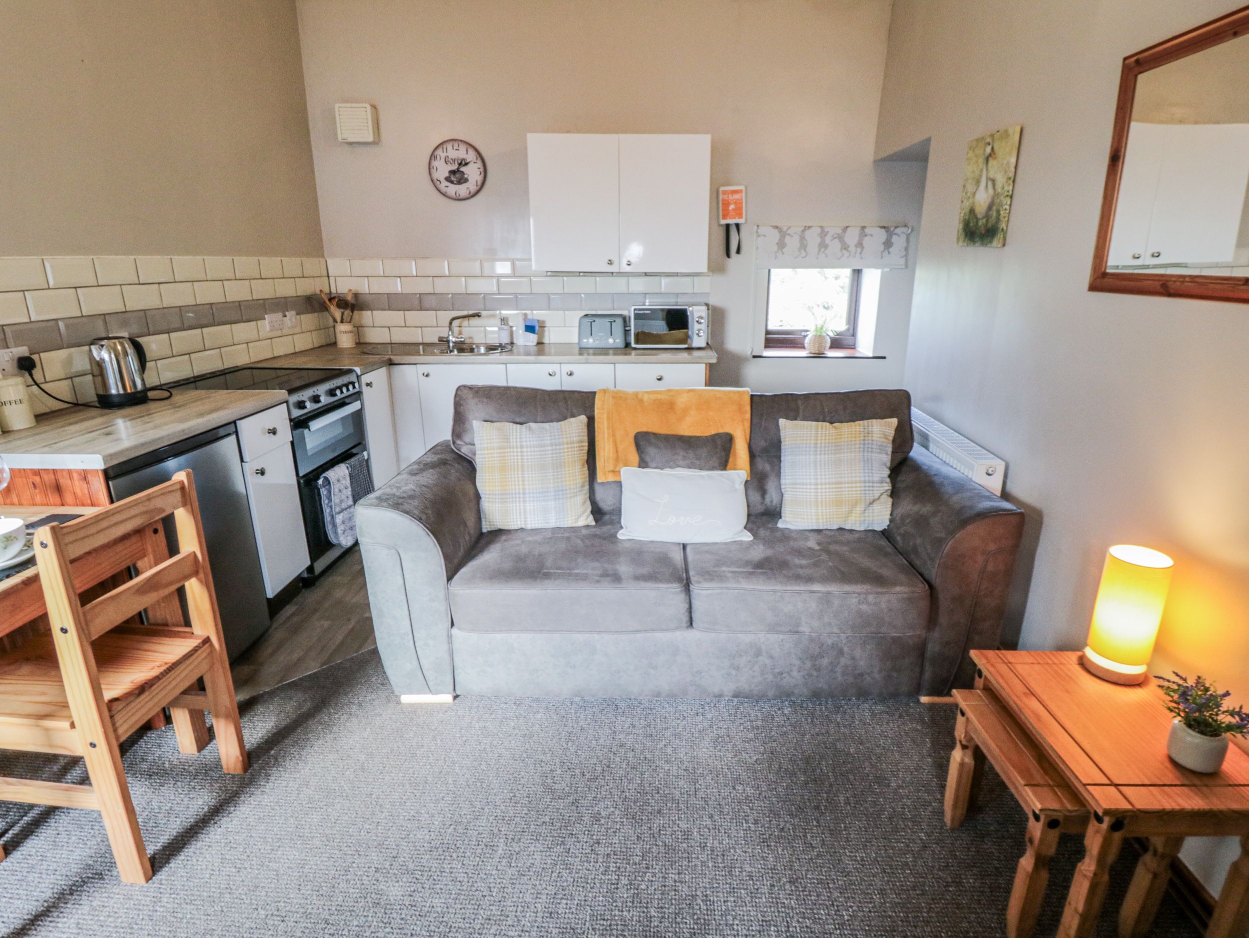 All ground floor. One bedroom: 1 x double with en-suite shower, basin and WC. Open-plan sitting, kitchen and dining area.