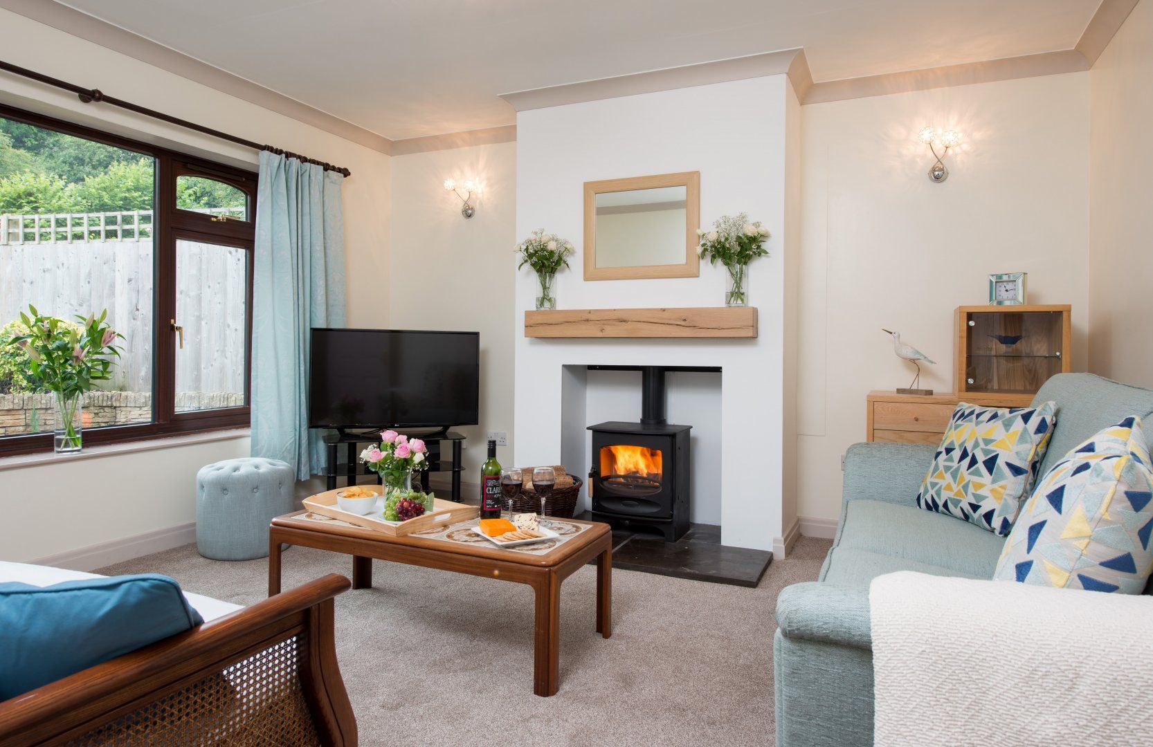 There is a lovely sitting room, with accents of duck egg blue, with a wood burning stove - so cosy in the cooler months - plus TV and DVD player, with comfortable seating to sit back and relax.
