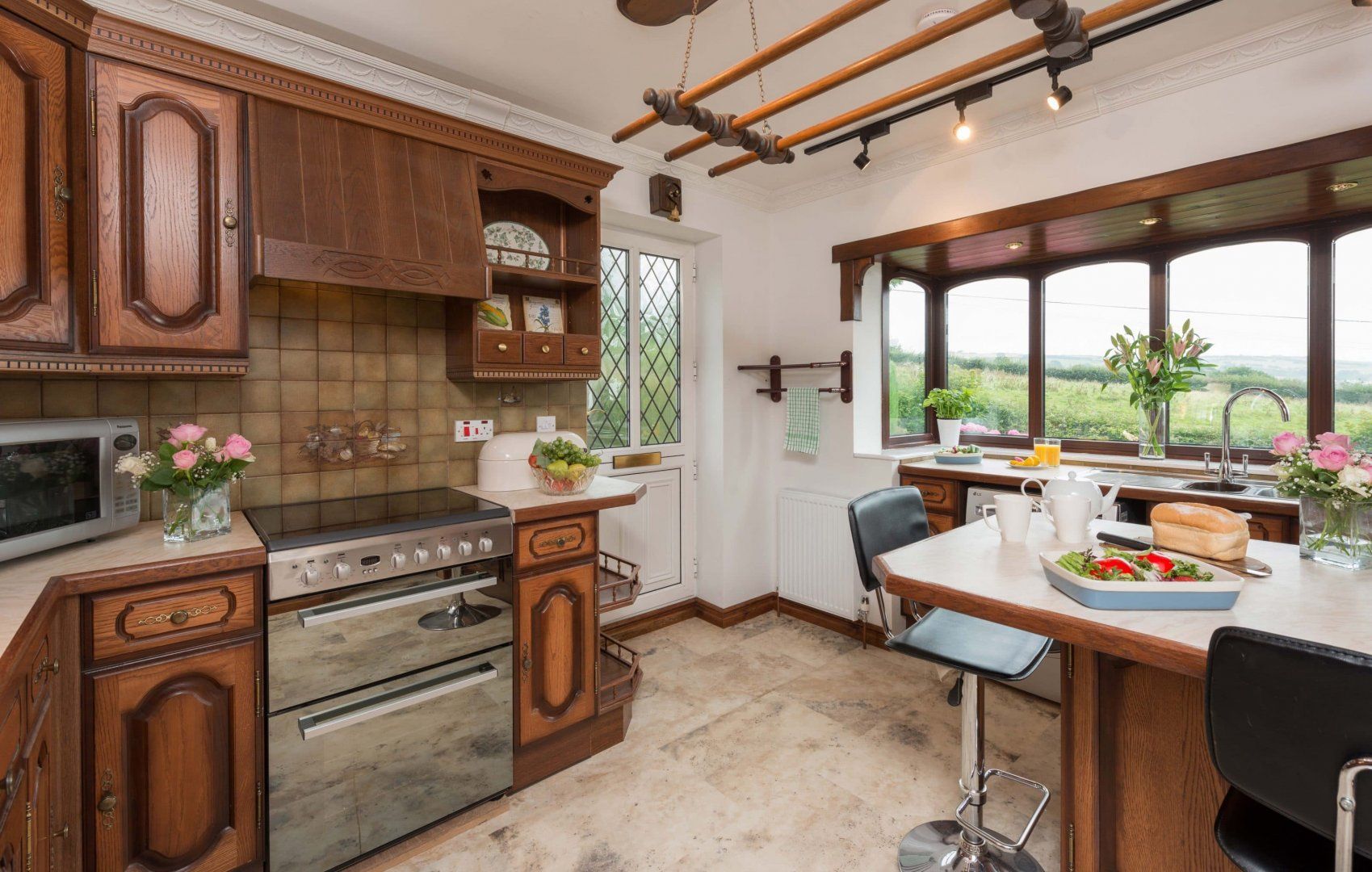 The kitchen has a breakfast bar - you can enjoy breakfast or your morning cuppa whilst enjoying the views - and is equipped with an electric oven and hob, microwave and washing machine/dryer.