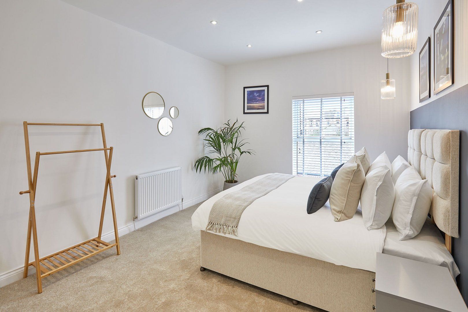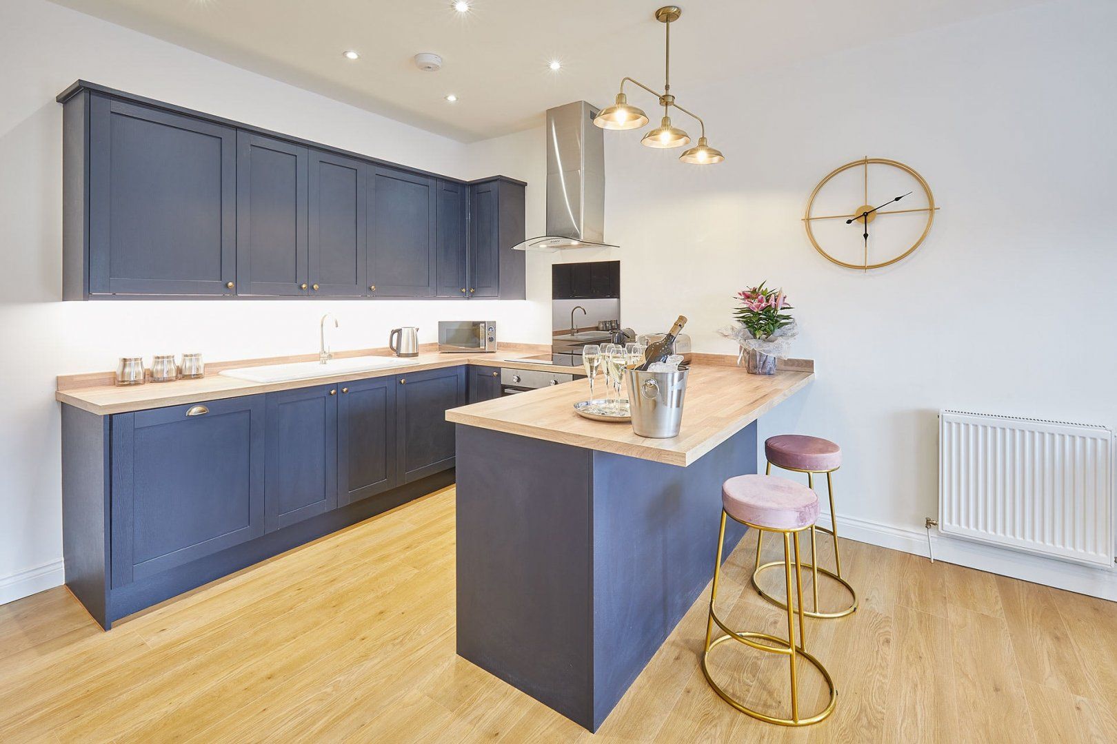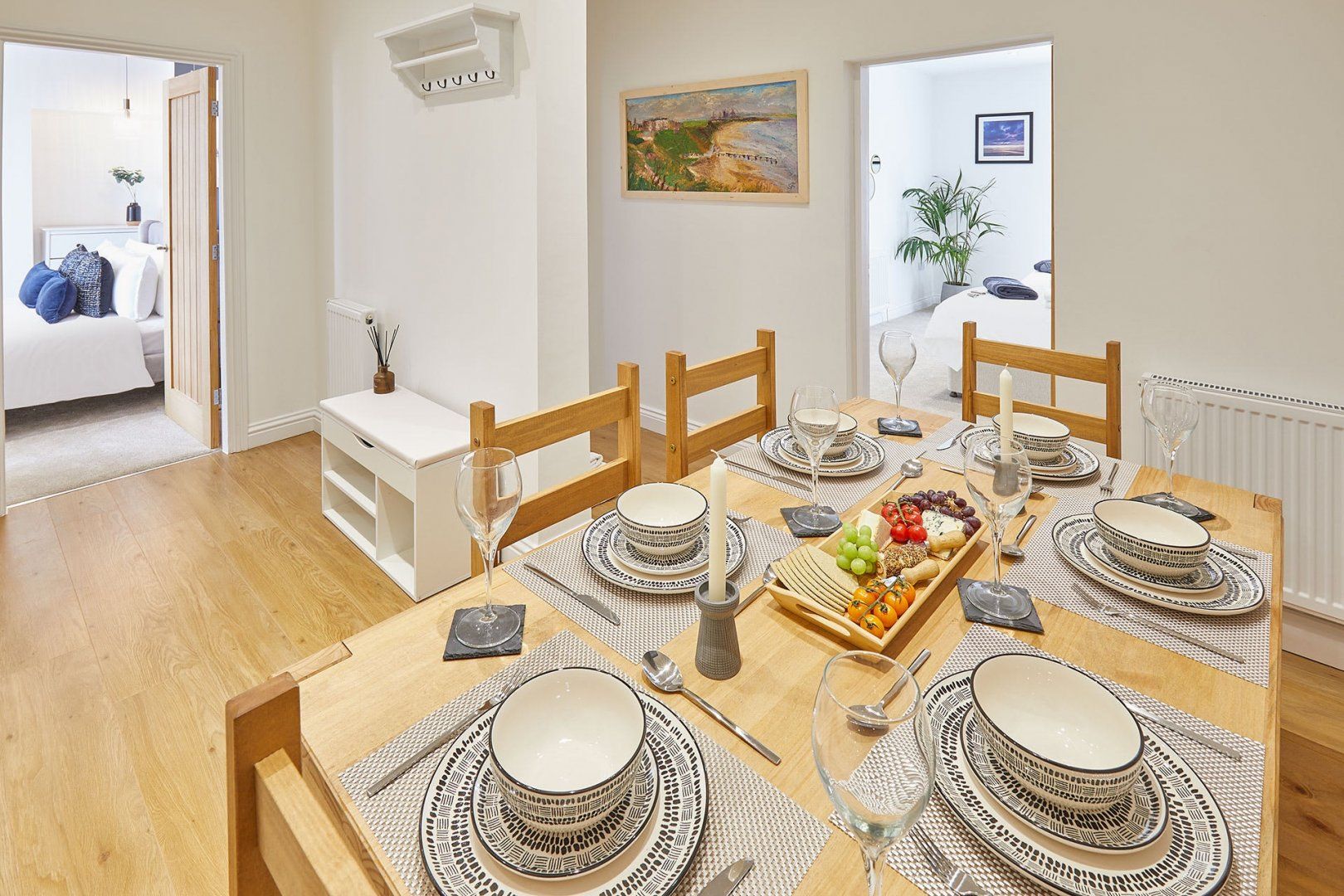 The living room is a delightful mix of mid-century style furniture and modernity. Think velvet scalloped chairs sitting alongside an L-shaped sofa big enough for the whole family. The wooden dining table can comfortably seat six people, and there’s additional room at the breakfast bar if you need it. Bedrooms are soothing spaces in neutral tones, inviting you for a quiet night’s sleep.