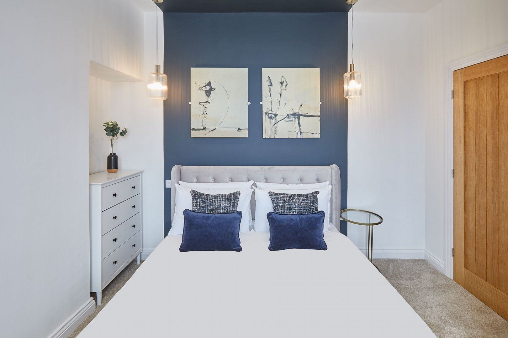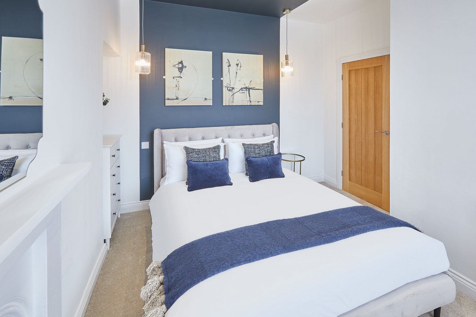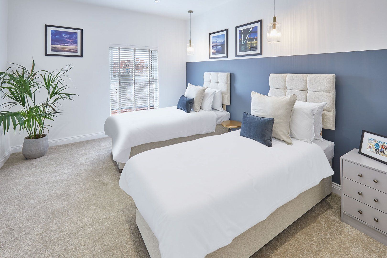 The living room is a delightful mix of mid-century style furniture and modernity. Think velvet scalloped chairs sitting alongside an L-shaped sofa big enough for the whole family. The wooden dining table can comfortably seat six people, and there’s additional room at the breakfast bar if you need it. Bedrooms are soothing spaces in neutral tones, inviting you for a quiet night’s sleep.