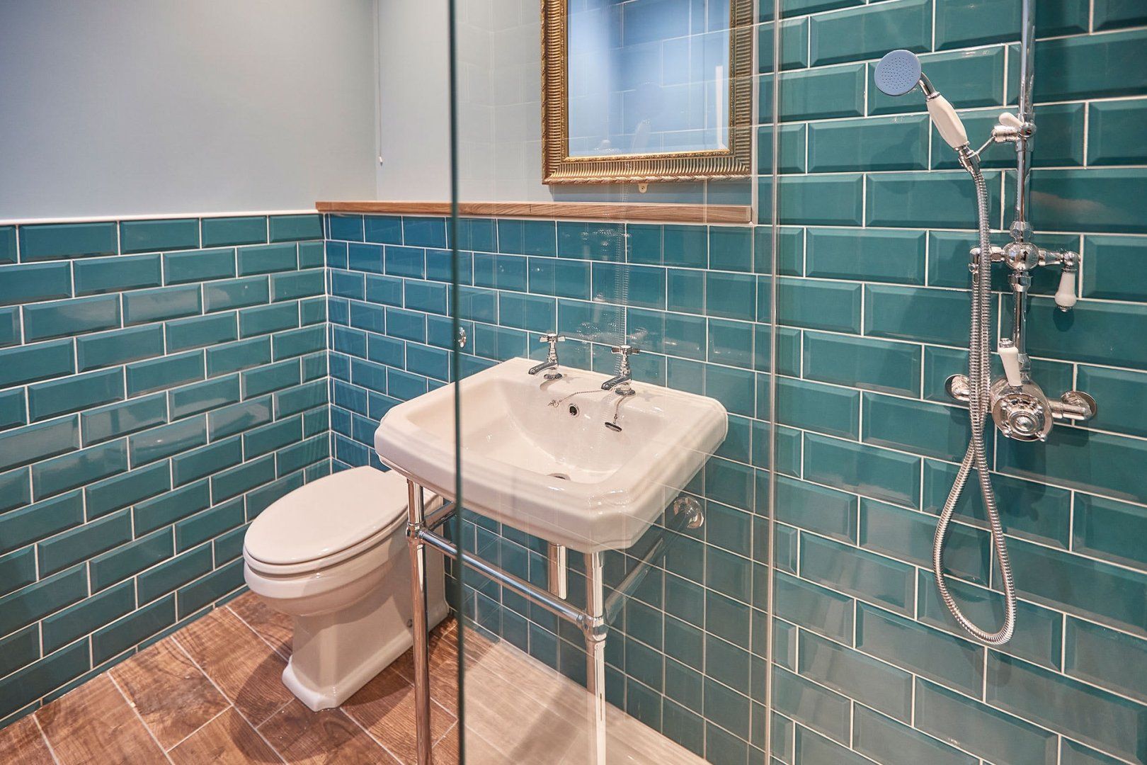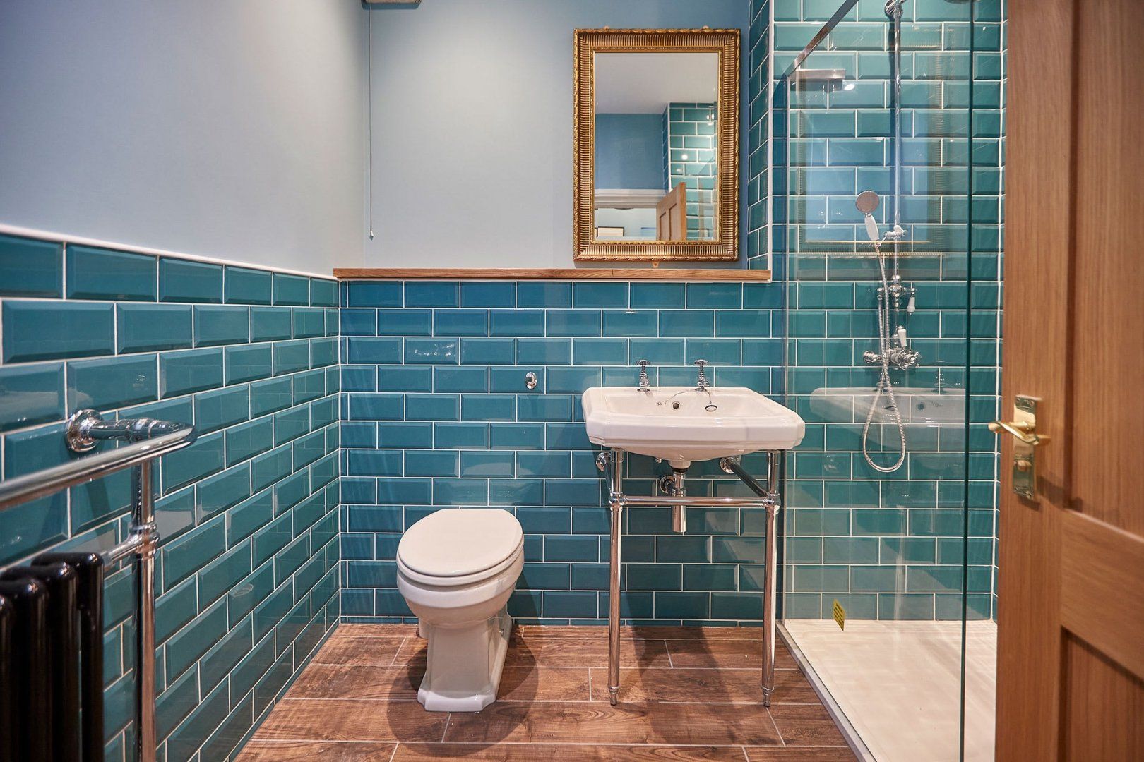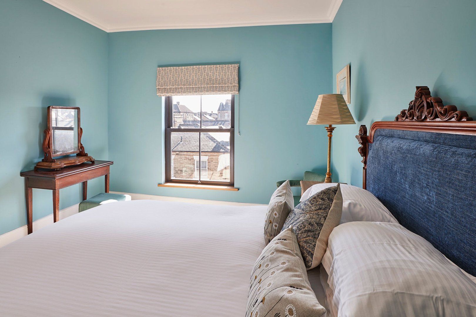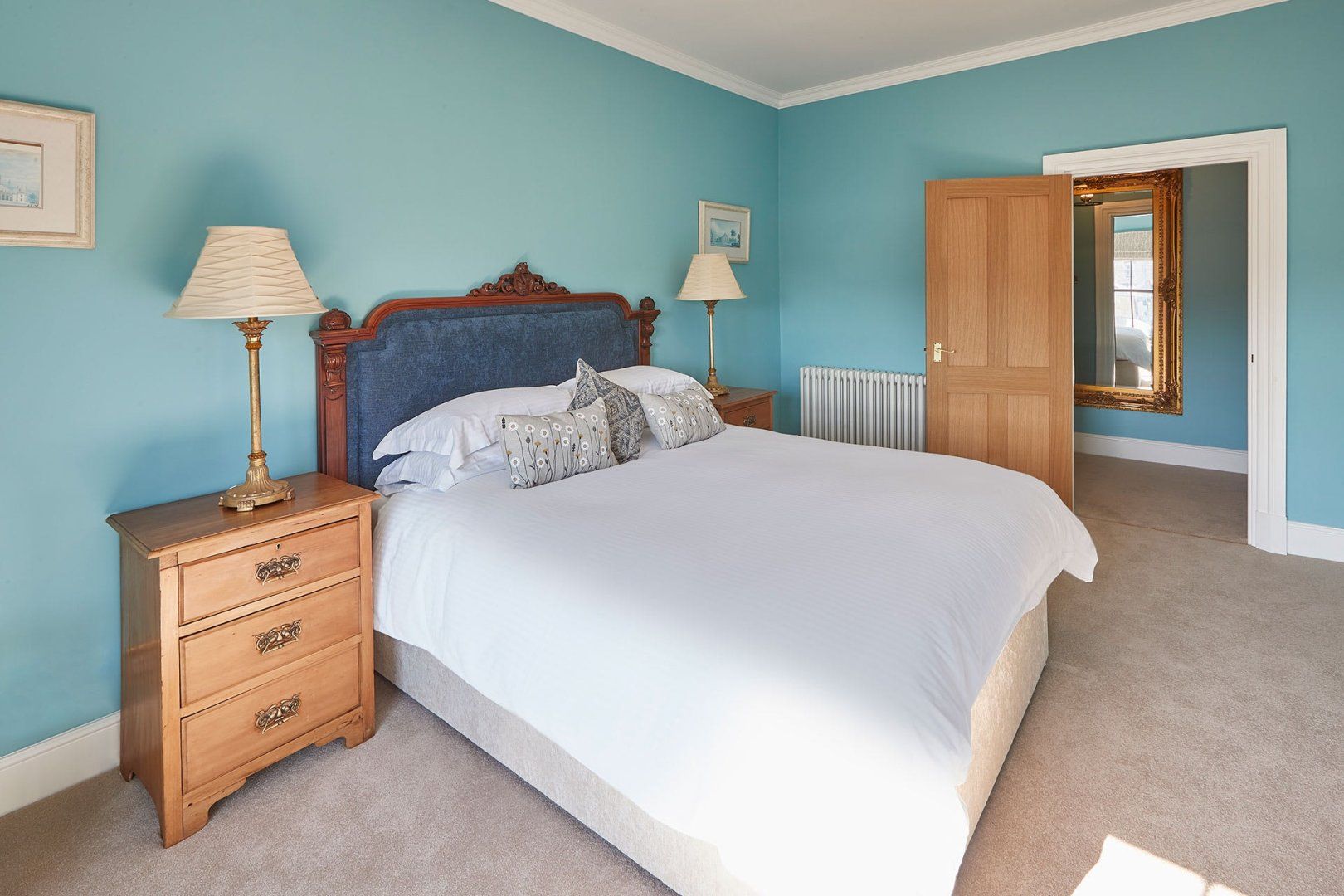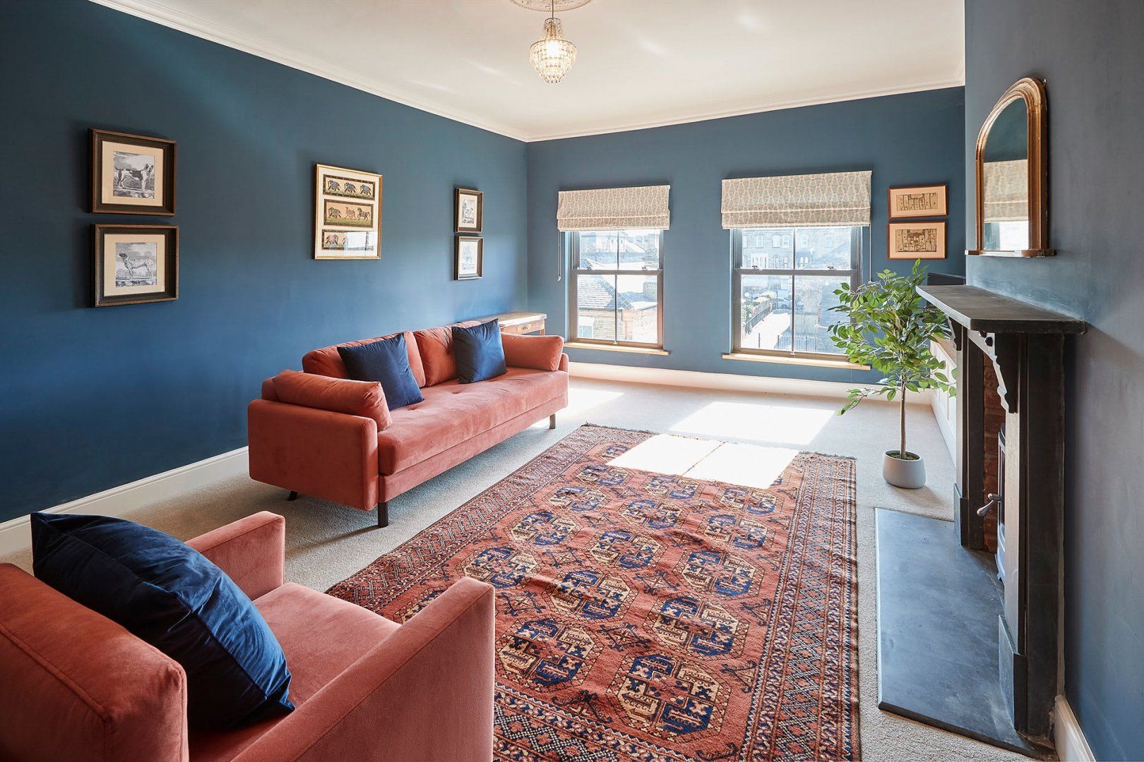 Stylish designs in a coral and sapphire colour palette present this bright and vibrant apartment with bags of charm and elegance. Large Georgian windows invite an abundance of natural daylight through the space, while tasteful plants and a blend of antique and modern furniture pieces build character.