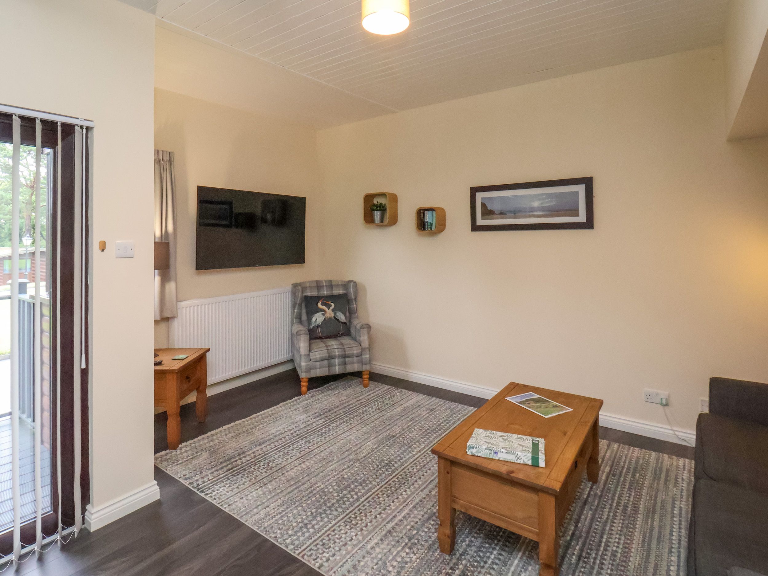Accomodation Details Single-storey. One double bedroom with TV. Shower room with walk-in shower, basin, heated towel rail, and WC. Open-plan living space with kitchen, dining area and sitting area