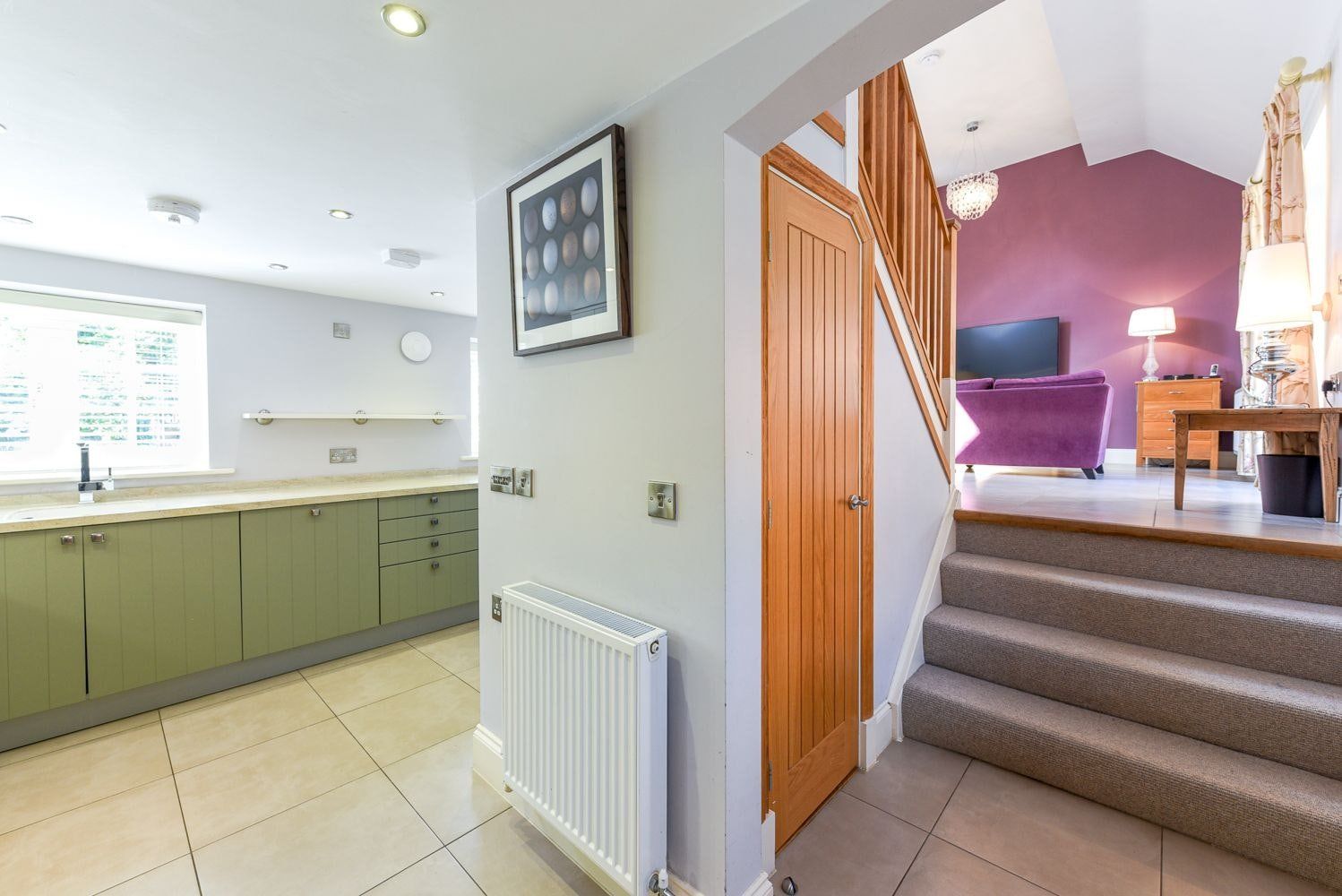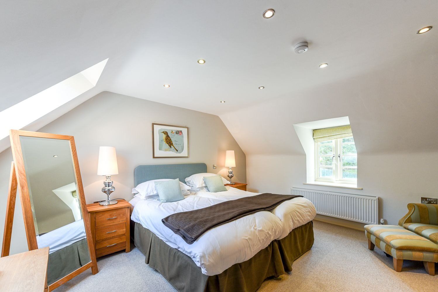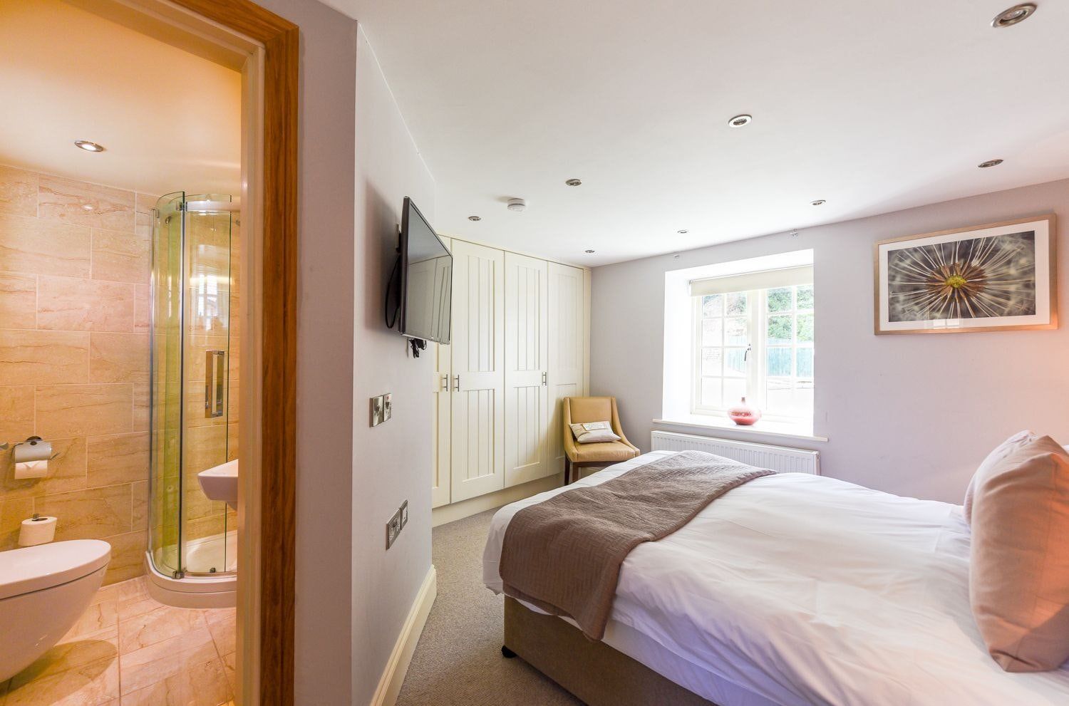 With multiple skylights, this living area gets a breath of natural light and the greenery that surrounds the property. We love the bold use of purple – from the plush sofa to the tasteful TV wall – while the small wooden dining table is perfect for meals together. Step downstairs into the painted green kitchen and find it roomy and well-equipped, ideal for all your self-catered meals. On nice days, enjoy lunch outside on the patio set, overlooking the grounds, and soak in some sunshine. You’ll probably want to head down to the beach too – Sandsend Sands is just a fifteen-minute walk from home. Spend the rest of your time exploring the nearby Whitby and its literary history, beautiful coast and delicious fish and chips.