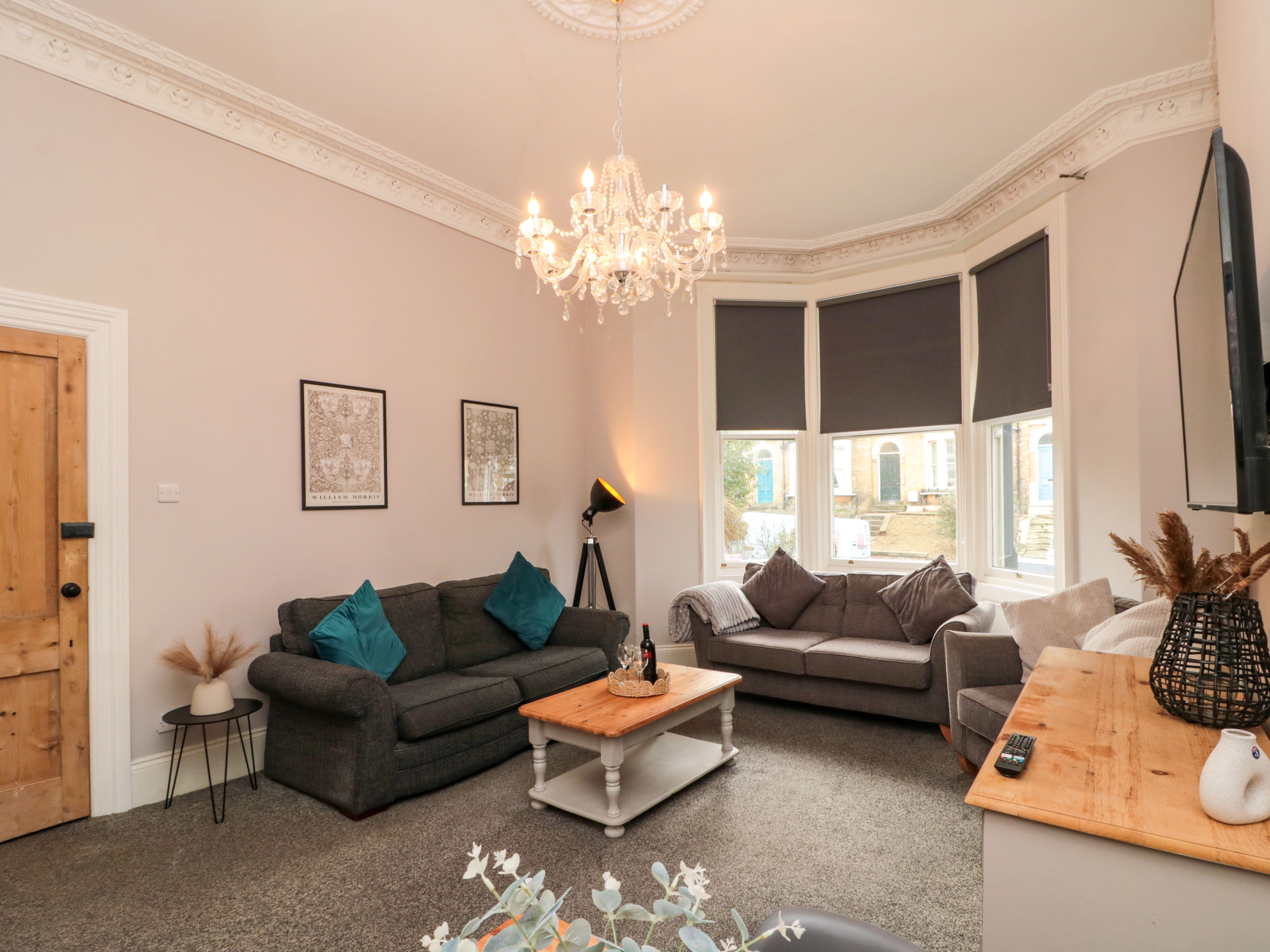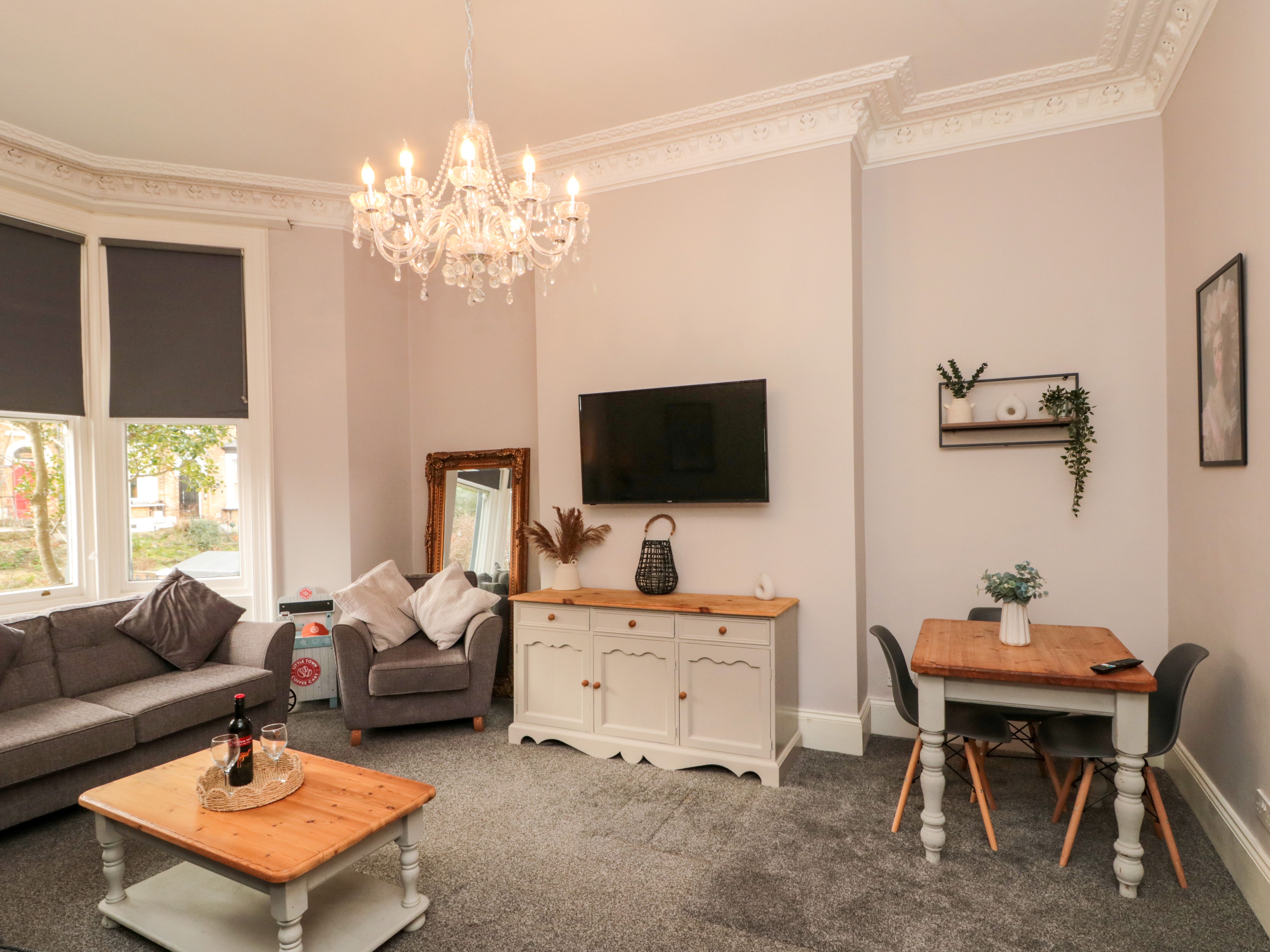 27 Westbourne Grove consists of a kitchen/diner with oven, hob, microwave, washing machine, dishwasher, and dining seating, and a living/dining room with Smart TV and dining table. The bedrooms (all with Smart TVs) consist of three doubles, a third-floor double, two third-floor doubles, a second-floor family room, and a fourth-floor family room, all serviced by en-suite walk-in showers. There is also a ground-floor bathroom with bath, shower over, basin, and WC. WiFi, fuel, power, bed linen, and towels are included in the rent. Outside, there is an enclosed, rear garden with gravel and lawn, plus roadside parking. One well-behaved pet is welcome. Sorry, no smoking. Return year after year to 27 Westbourne Grove. Note: One of the double bedrooms is accessed via another bedroom on the third floor. Note: A few steps throughout property. Note: Washing machine facilities are available; however, children are not permitted in this area due to the presence of cleaning products.