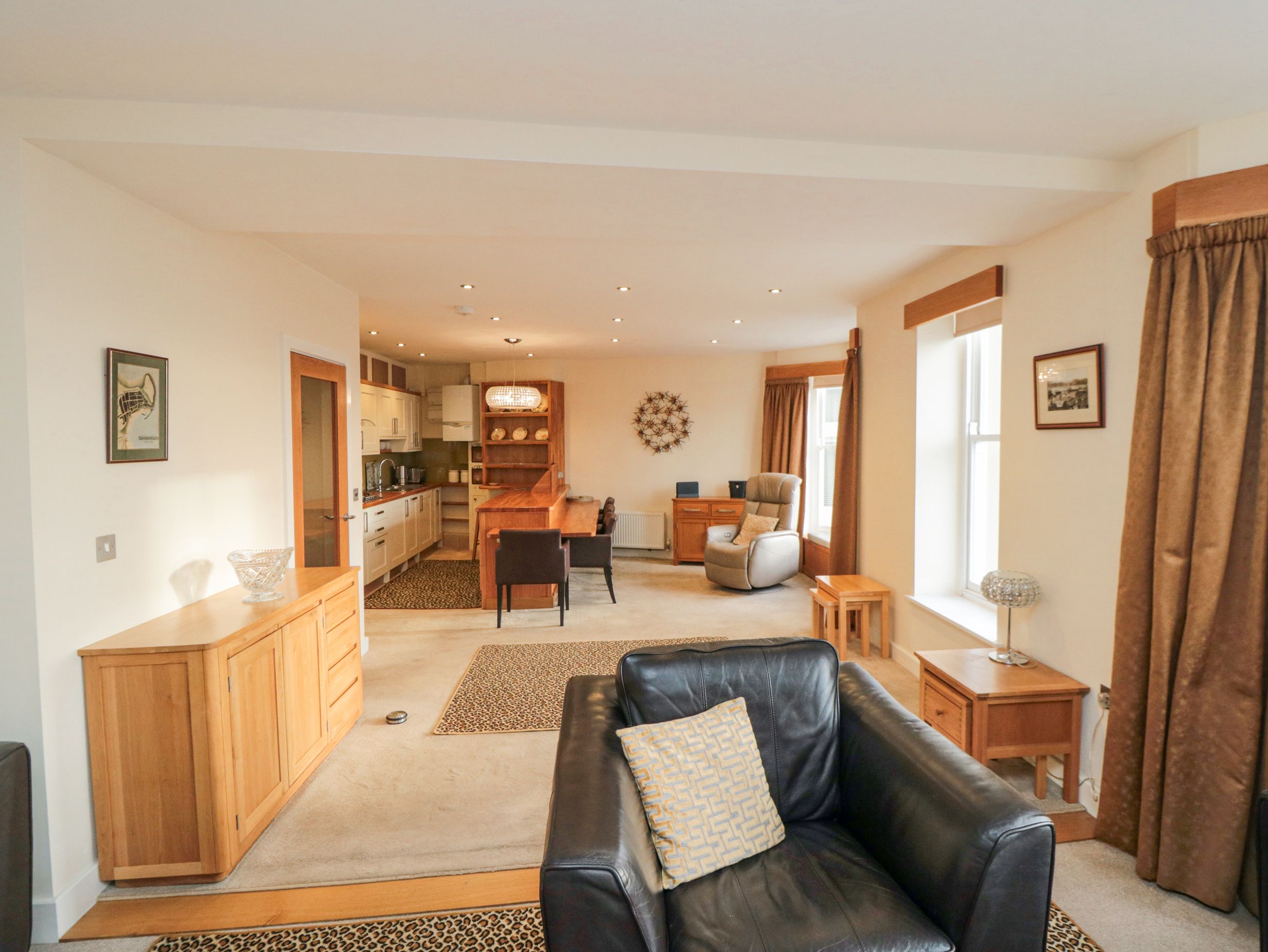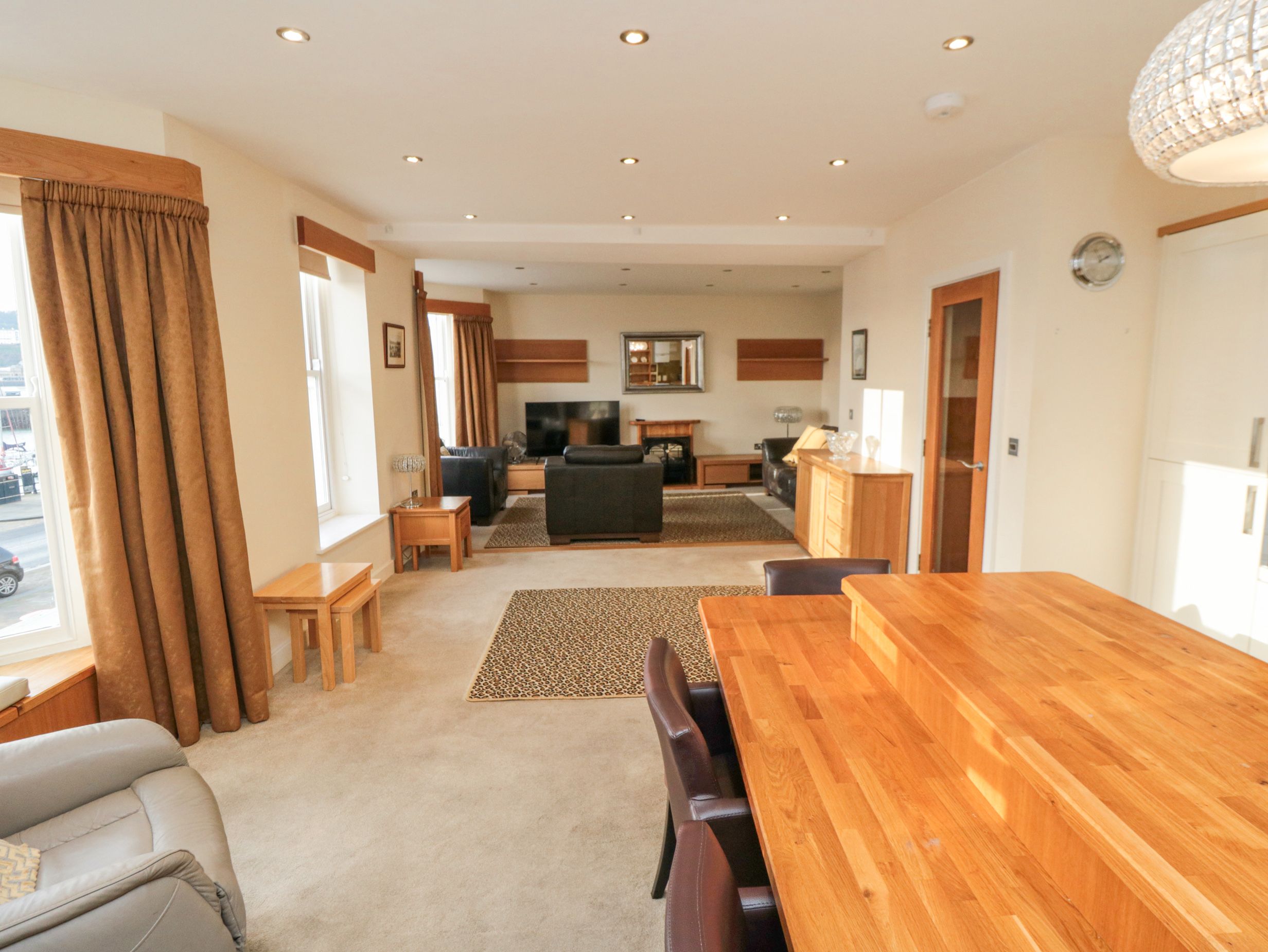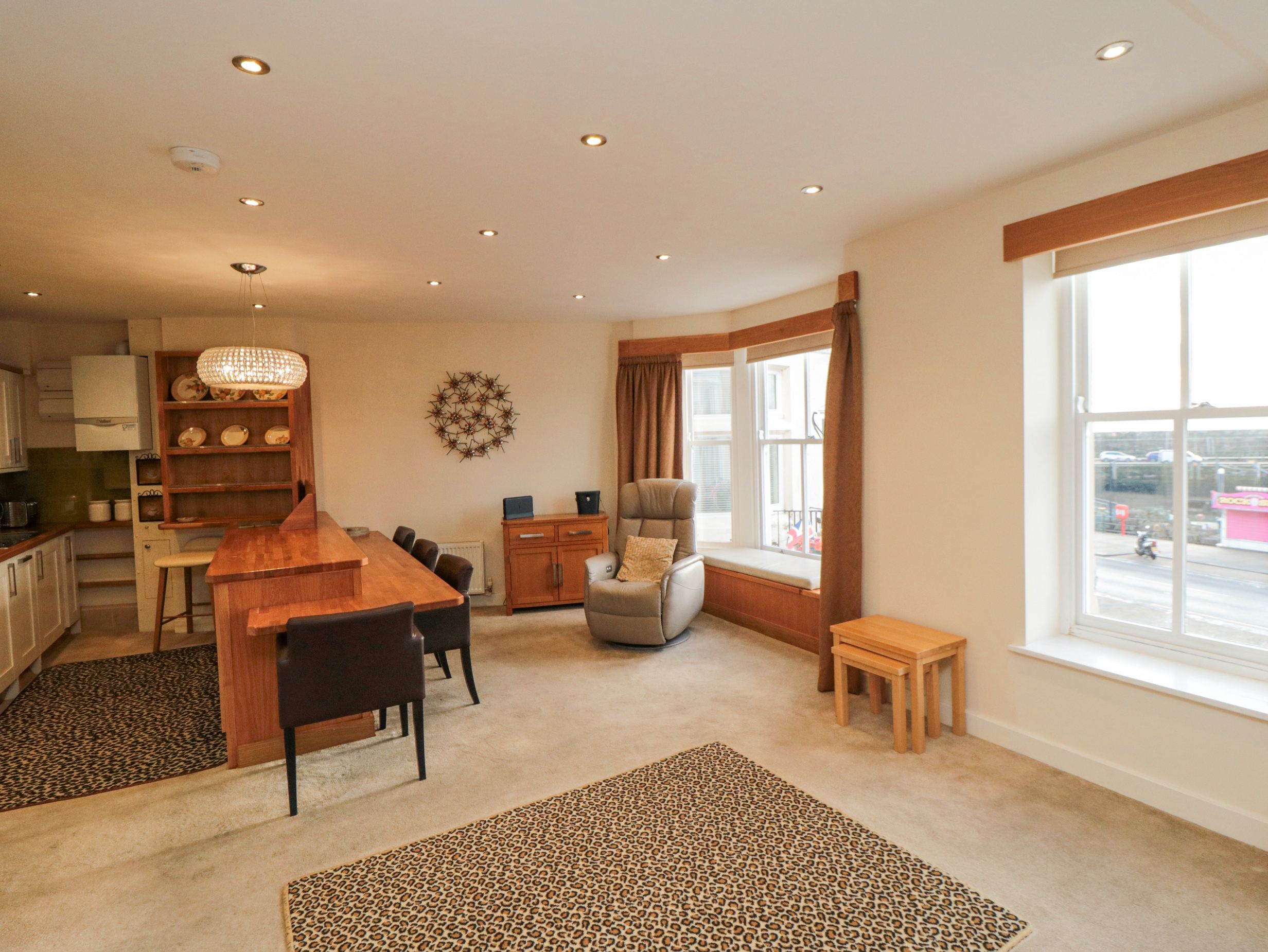 Accomodation Details First-floor apartment. Two bedrooms: 1 x double with TV, 1 x double. Bathroom with bath, walk-in shower, basin, heated towel rail, and WC. Open-plan living space with kitchen, dining area, and sitting area with electric fire
