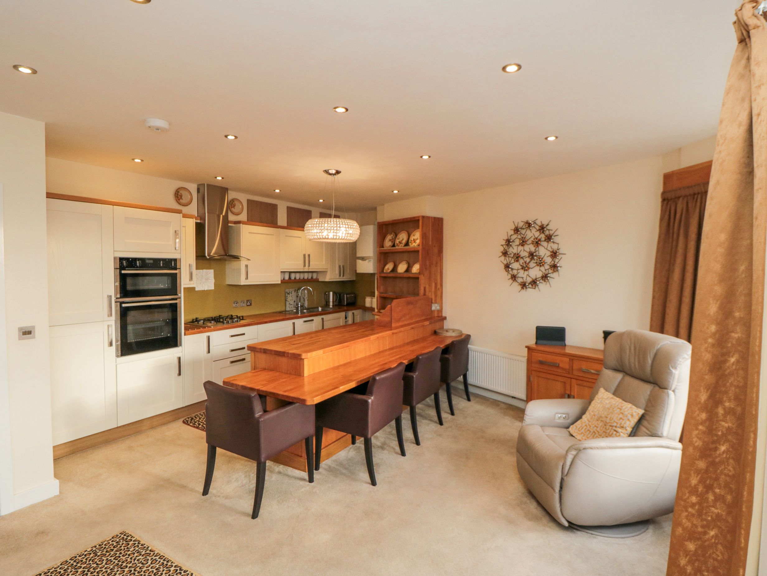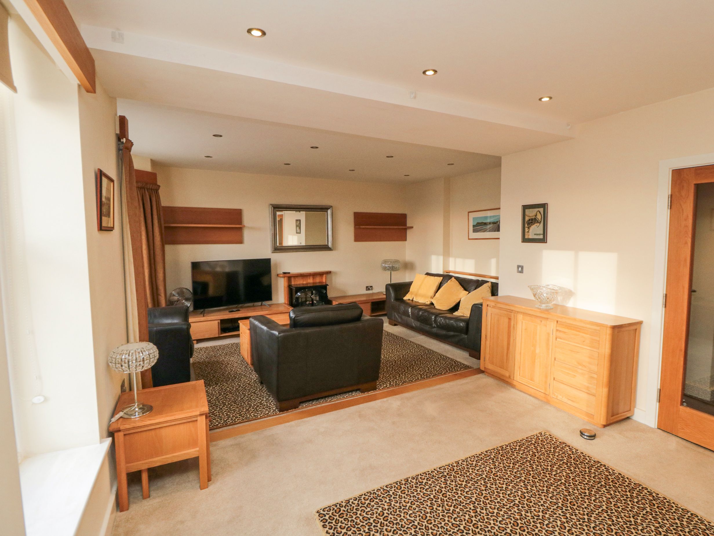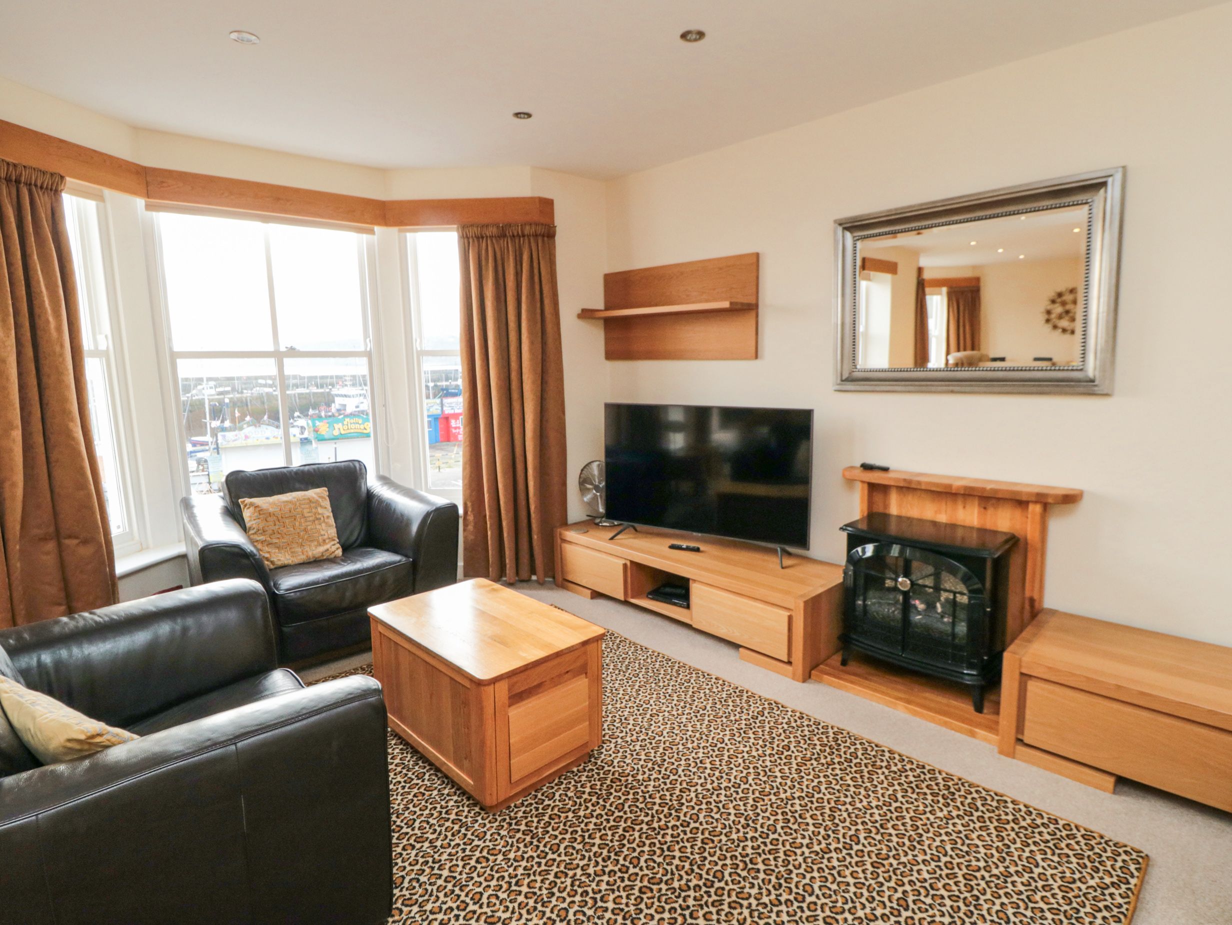 Accomodation Details First-floor apartment. Two bedrooms: 1 x double with TV, 1 x double. Bathroom with bath, walk-in shower, basin, heated towel rail, and WC. Open-plan living space with kitchen, dining area, and sitting area with electric fire