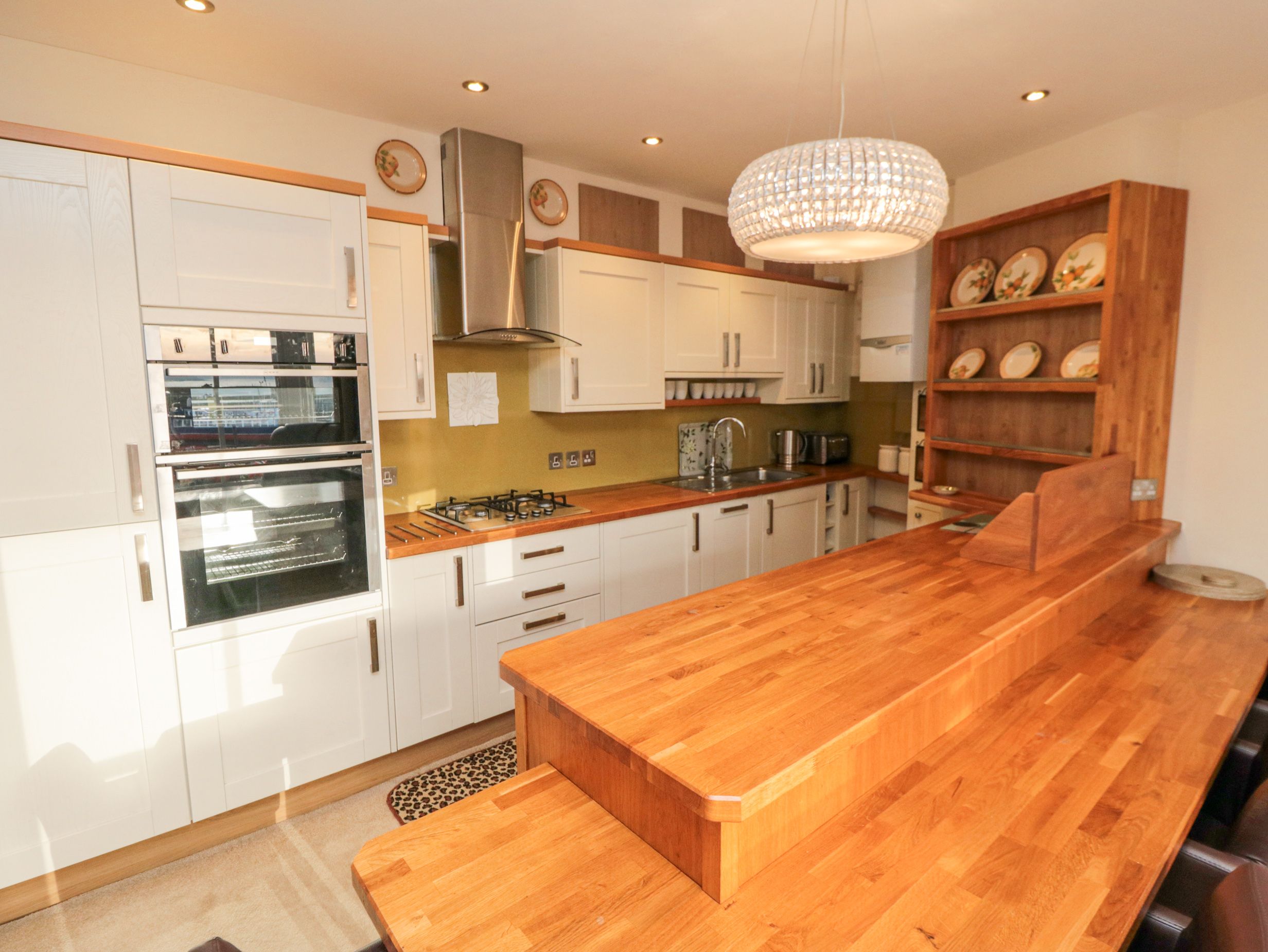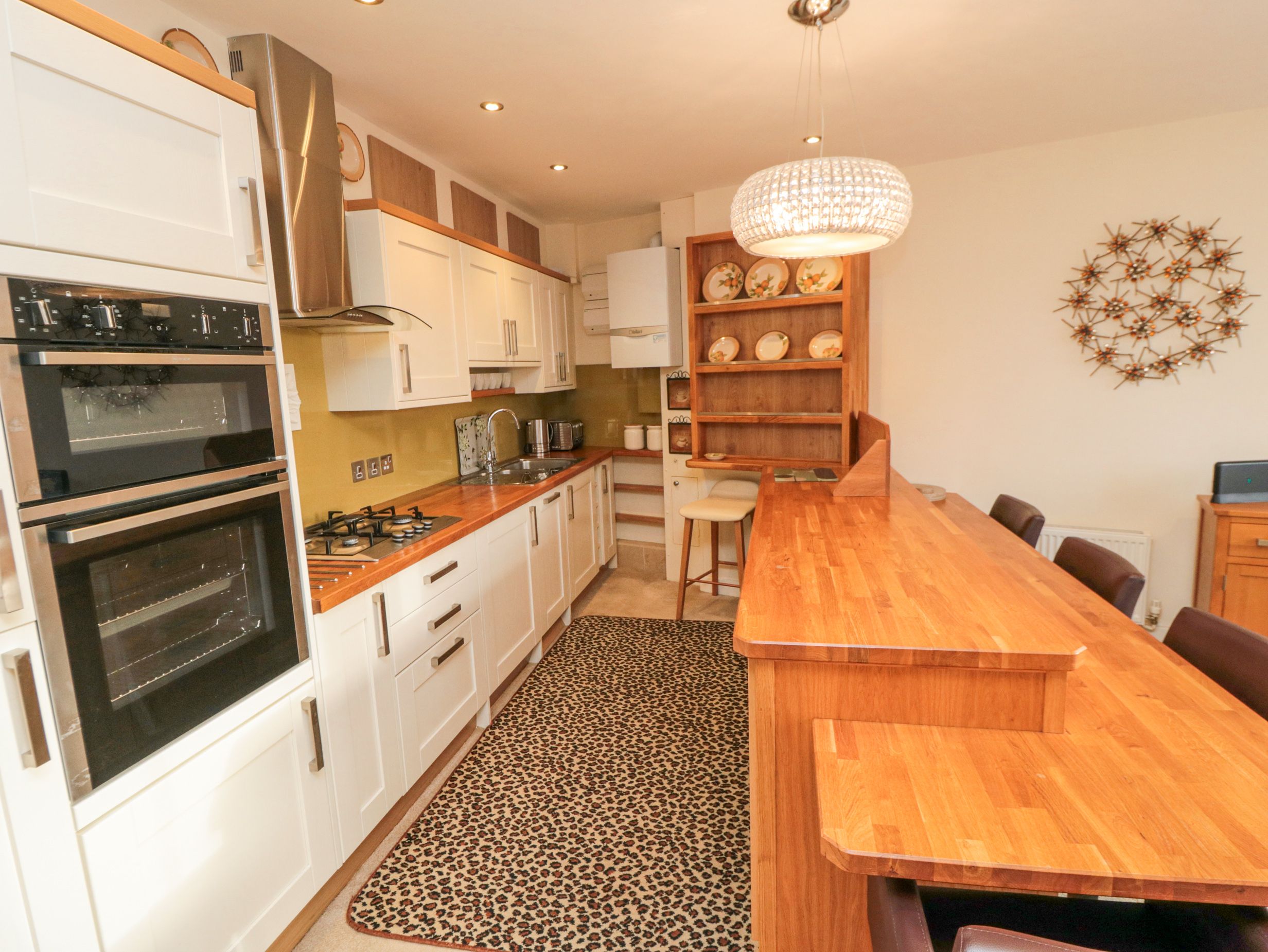 Holiday home 43a Quay Street, a first-floor apartment, consists of an open-plan living space including a kitchen with oven, hob, fridge/freezer, and washing machine, a dining area with dining seating four, and a sitting area with electric fire and TV. The bedrooms consist of two doubles. There is a bathroom with bath, walk-in shower, basin, heated towel rail, and WC. WiFi, fuel, power, bed linen, and towels included in the rent. Sorry, no pets and no smoking. Shop and pub 0.1 miles, beach 0.4 miles. Start your coastal adventures at 43a Quay Street. Note: Washing machine is in storage cupboard.