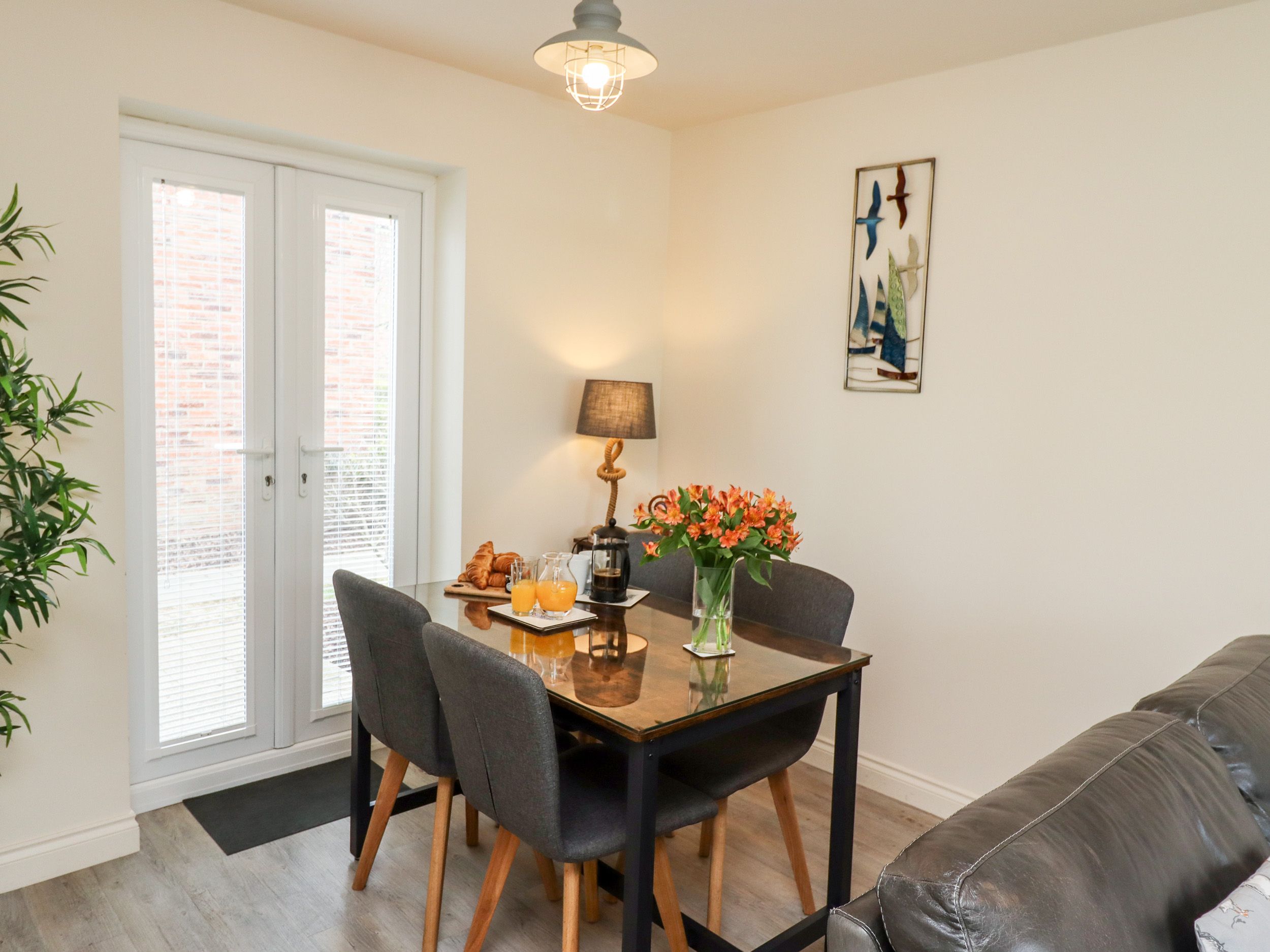 The entrance hall leads to a smart open plan sitting room with comfortable seating and a TV/DVD player. A dining room provides an spot to enjoy meals together whilst discussing the day's planned adventures, with French doors leading to the rear garden area.