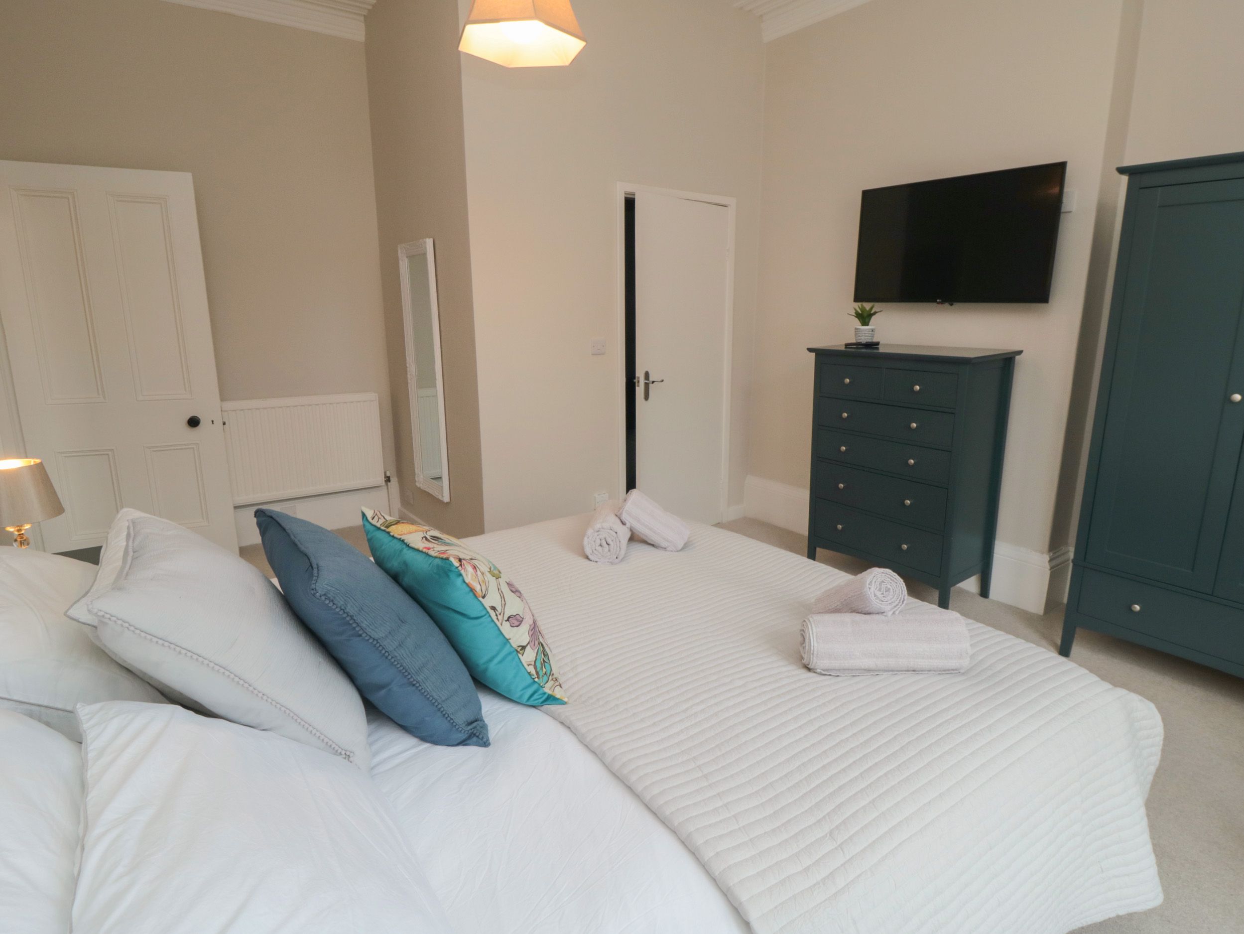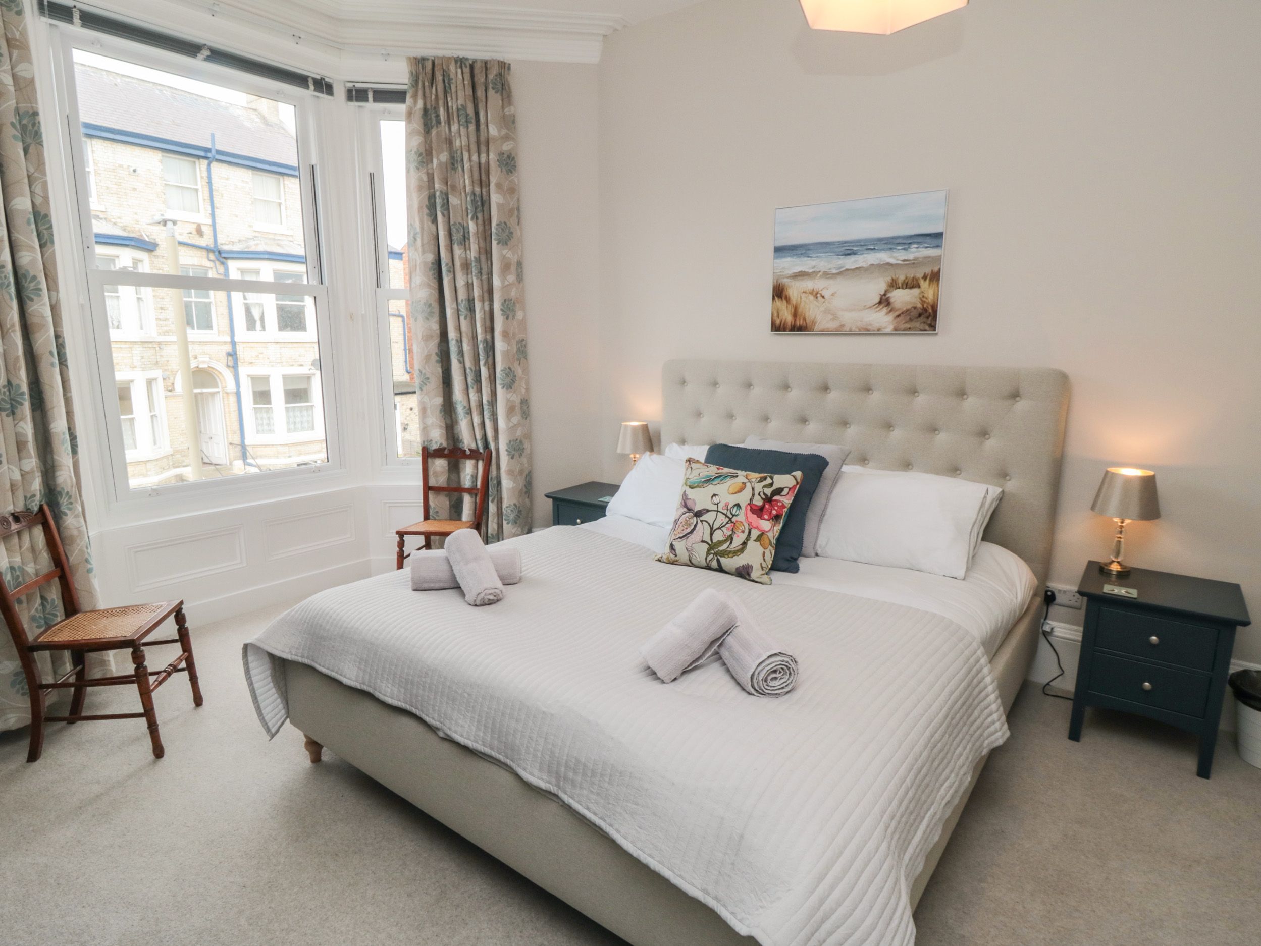 Holiday home Spinnaker House, a three-storey home has a kitchen/diner, utility, dining room, sitting room with electric fire, snug, and games room, along with nine bedrooms, six of which have en-suites; there's also a bathroom and a shower room. Appliances include an electric oven and hob, microwave, fridge/freezer, washing machine, tumble dryer, and wine chiller, and for entertainment, six Smart TVs and a foosball table. Outside there is an enclosed rear patio with lawn and furniture, and roadside parking. Two well-behaved dogs welcome with a £30 supplement per pet. Sorry, no smoking. WiFi, fuel, power, bed linen and towels are all included in the price. You'll find a shop in 0.3 miles, a pub in 0.4 miles, and the beach in 0.7 miles. For a large group break to North Yorkshire, book Spinnaker House. Note: There are steps to the exterior of the home; please take care. Note: No stag, hen, or similar parties.