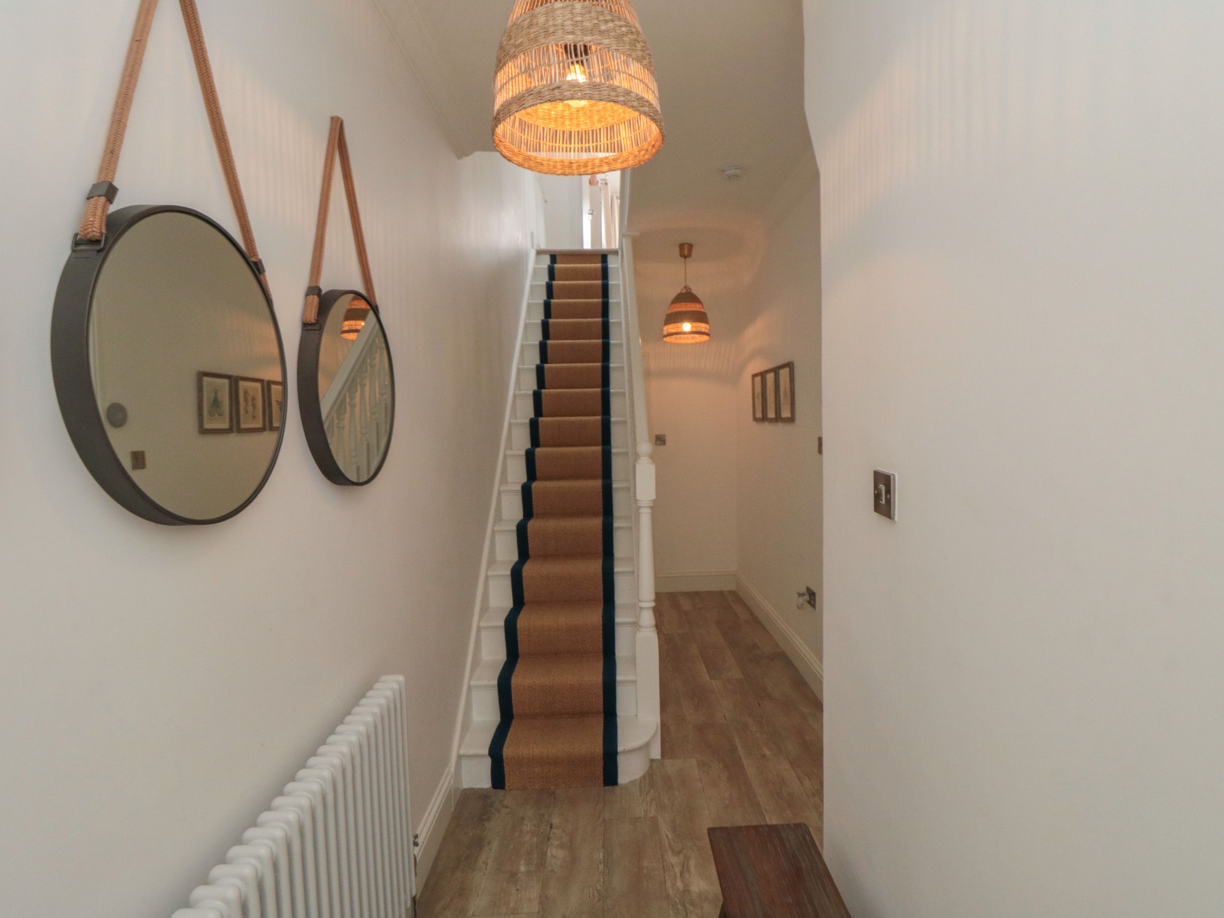 Amenities Central heating. Electric oven and hob, microwave, slow cooker, fridge/freezer, washer/dryer, dishwasher, coffee machine, kettle and toaster. Smart TV, Sky Glass, WiFi. Welcome pack inc wine, chocolates, crisps. Bed linen and towels inc. in rent. Highchair, cot and stairgate available. Roadside parking. Enclosed rear courtyard with furniture. Exterior hot tap and dog basin to wash paws in the rear garden. Two well-behaved pets welcome. Sorry, no smoking. Shop 0.2 miles, pub 0.3 miles, beach 0.6 miles. Note: There are steps up to the entrance. Note: There are steps up to the garden
