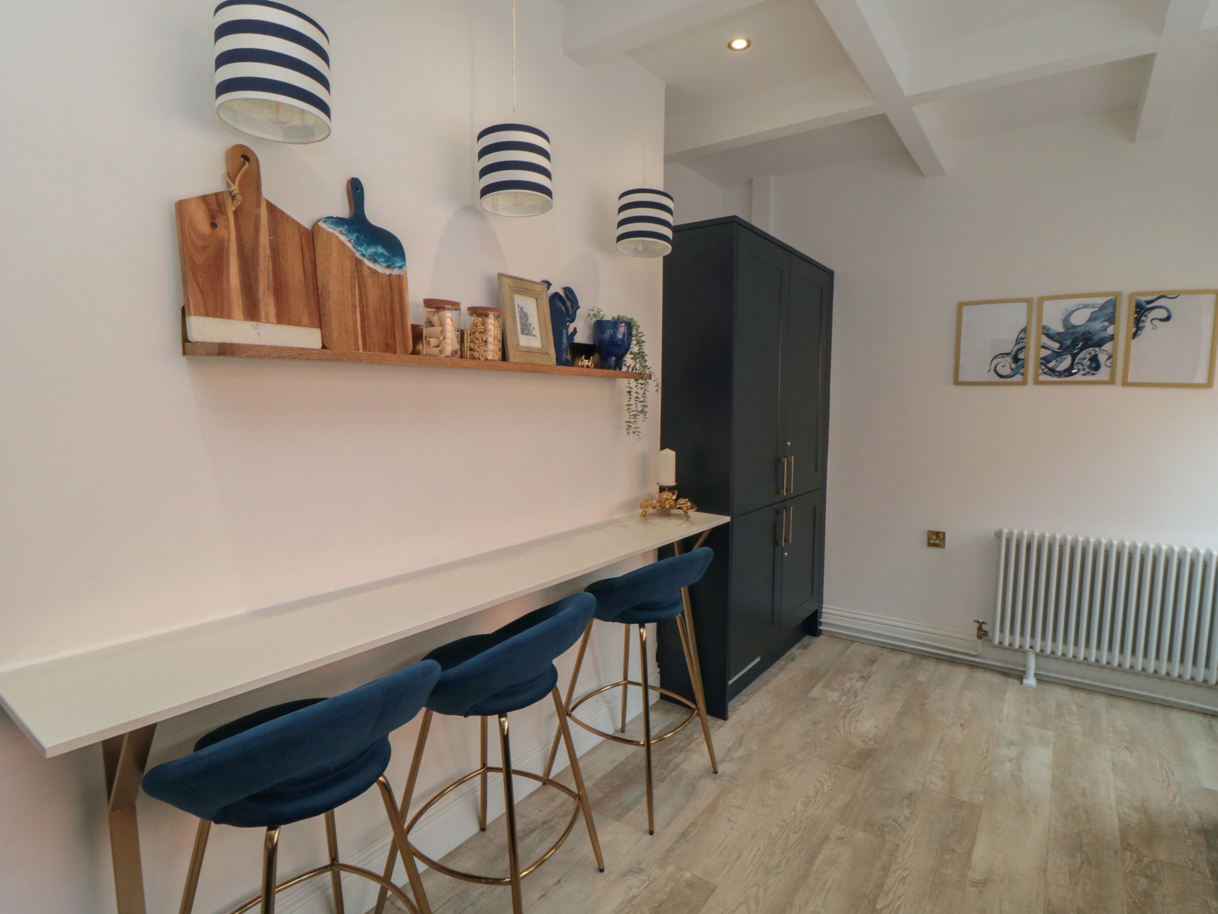 Holiday home Thirty Four By the Sea consists of king-size bedroom with en-suite walk-in shower, basin, heated towel rail and WC, a double bedroom and a triple bunk bedroom (double below, single above) with travel cot, along with a wet room. There’s a kitchen equipped with an electric oven and hob, microwave, fridge/freezer, washer/dryer, dishwasher, coffee machine, kettle and toaster. There’s a living/dining room with woodburning stove and Smart TV. WiFi, fuel, power, starter pack for woodburning stove, bed linen, and towels are included in the rent. A highchair, travel cot and stair gate are available. Outside, there’s roadside parking and an enclosed rear courtyard with furniture. Two well-behaved pets welcome. Sorry, no smoking. Shop 0.2 miles, pub 0.3 miles, beach 0.6 miles. Visit the best of North Yorkshire with a stay at Thirty Four By the Sea. Note: There are steps up to the entrance. Note: There are steps up to the garden. The property has a minimum of 3 night stay