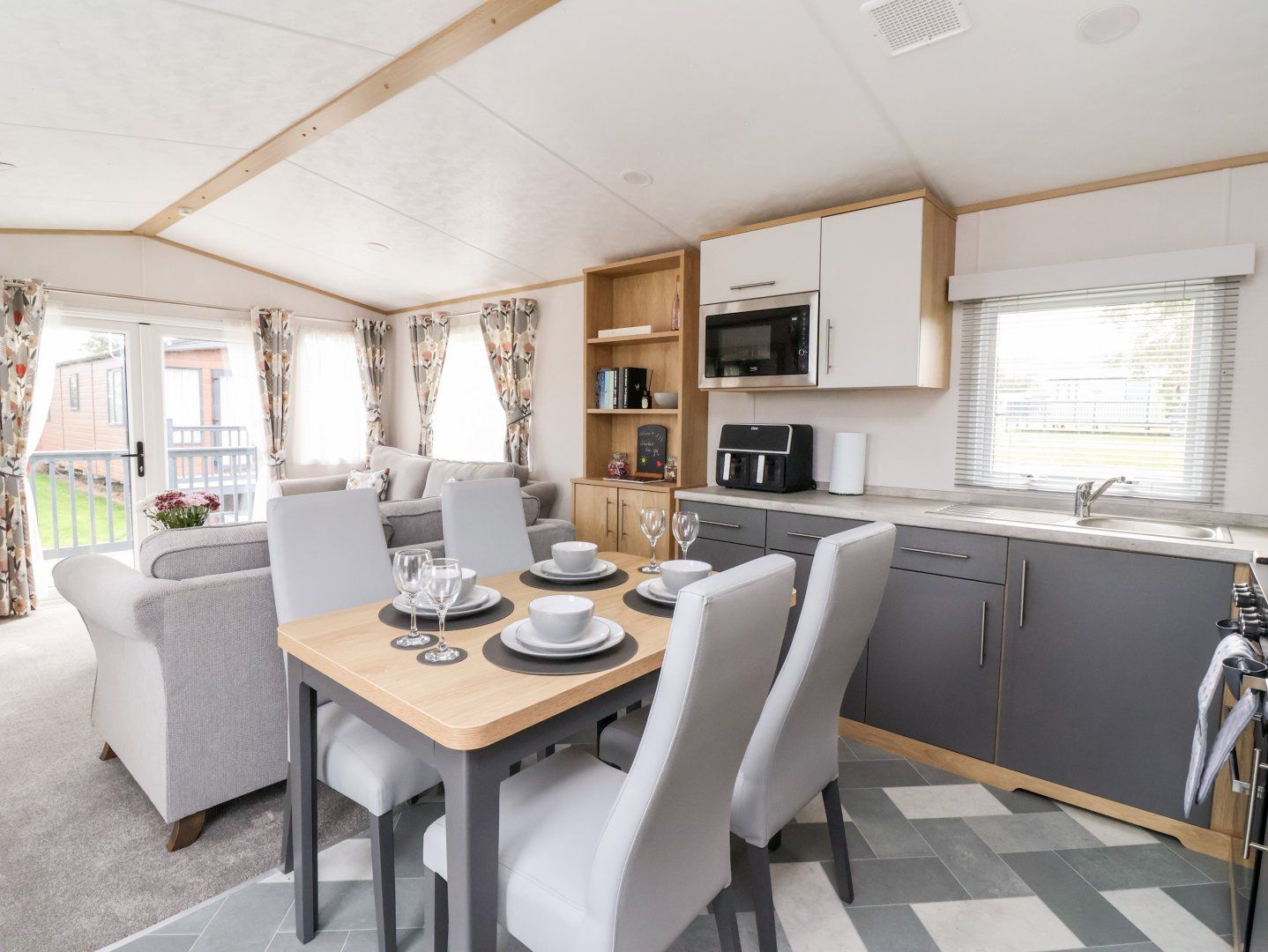 Holiday home Silverdale View, a single-storey lodge has an open-plan kitchen, dining area and sitting area and electric fire, a king-size bedroom with en-suite, a twin, and a shower room. Appliances consist of an electric oven, gas hob, microwave, fridge/freezer, Air fryer, and Smart TV. Outside there is an enclosed, wrap-around decked area with furniture and hot tub, designated parking for one car, and further parking in the public car park. Two well-behaved dogs welcomed, but sorry, no smoking. WiFi, fuel, power, bed linen and towels are all included in the price. You'll find a shop in 1 mile and a pub in 1.1 miles. Take to rural North Yorkshire at Silverdale View. Note: There is an on-site bar. Note: There are steps to the exterior, unsuitable for those with limited mobility.