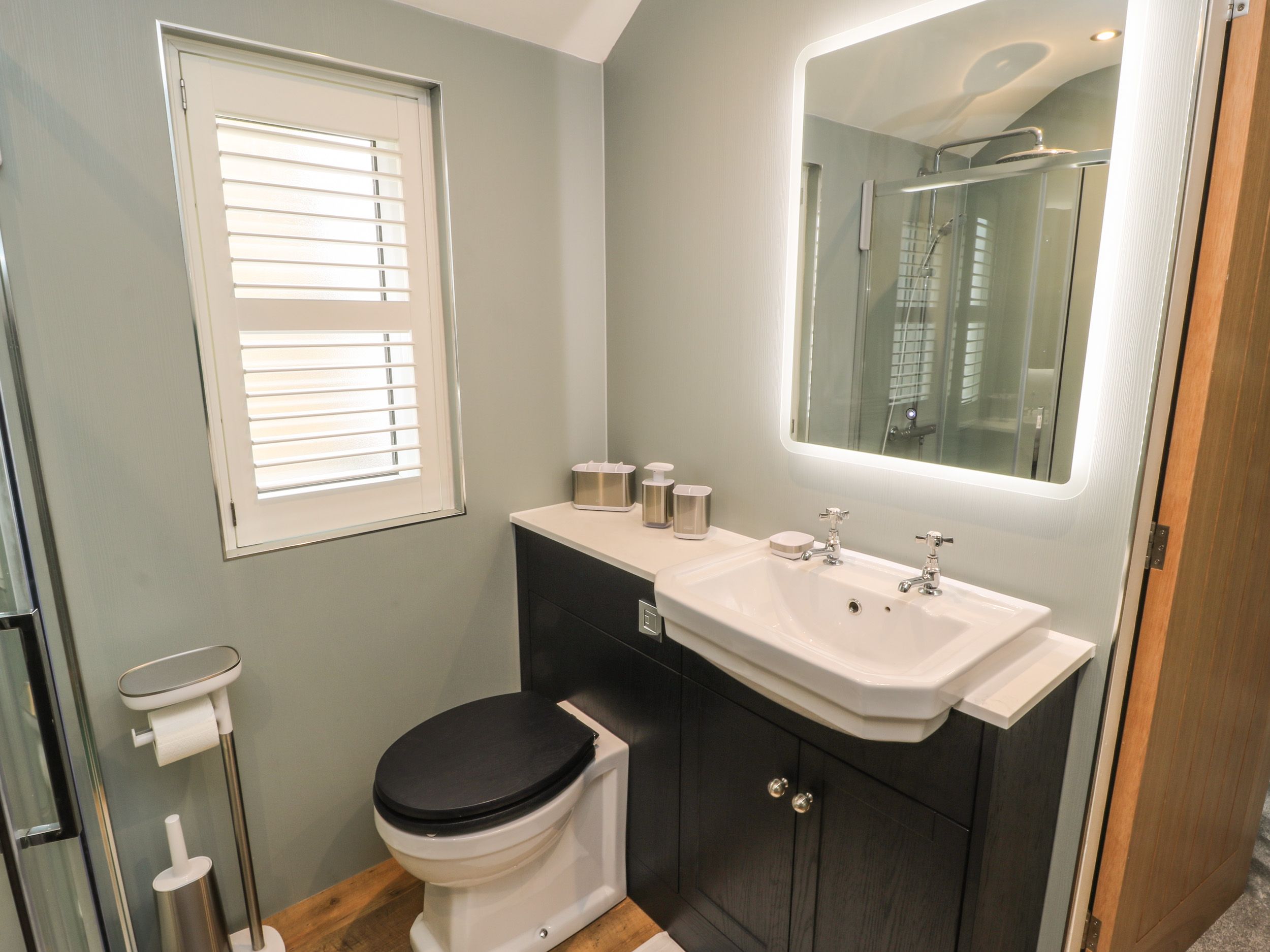 One king-size bedroom. Shower room with walk-in shower, basin, heated towel rail and WC. Open-plan living space with kitchen, dining area and sitting area with woodburning stove