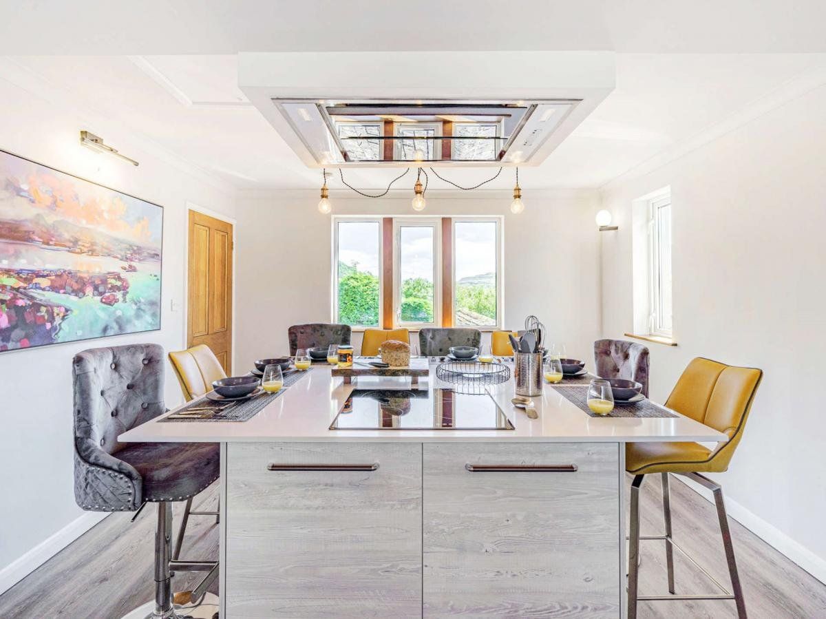 The luxury house has an upside-down layout with two bedrooms and a bathroom on the ground floor. It also features a games room, wood burners, a stunning dining room, a balcony, and an enclosed garden.