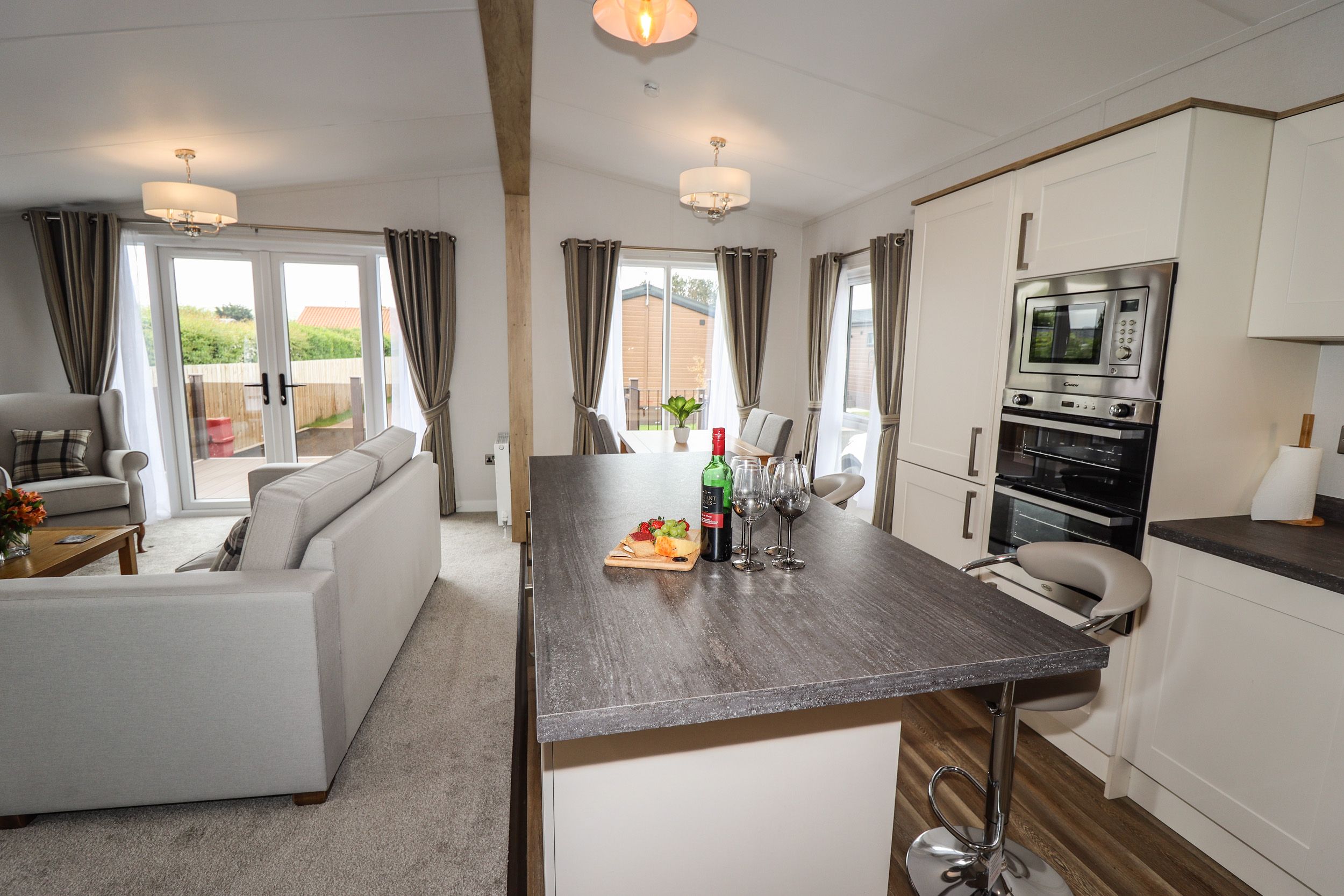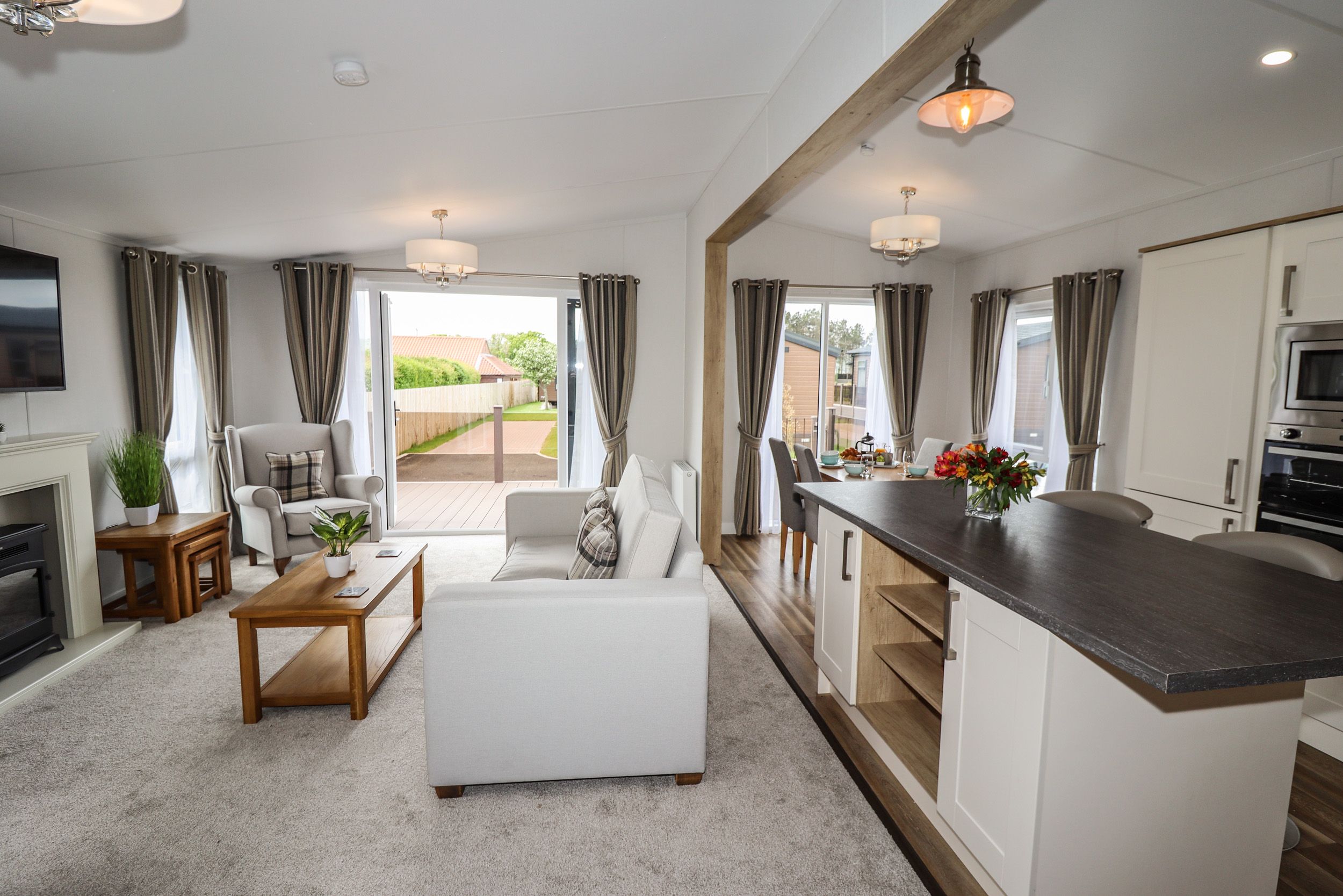 Accomodation Details All-one-level. Two bedrooms: 1 x king-size with en-suite walk-in shower, basin and WC, 1 x twin. Bathroom with bath, separate walk-in shower, basin and WC. Open-plan living space with kitchen, dining area and sitting area with fire. included towels and bedding