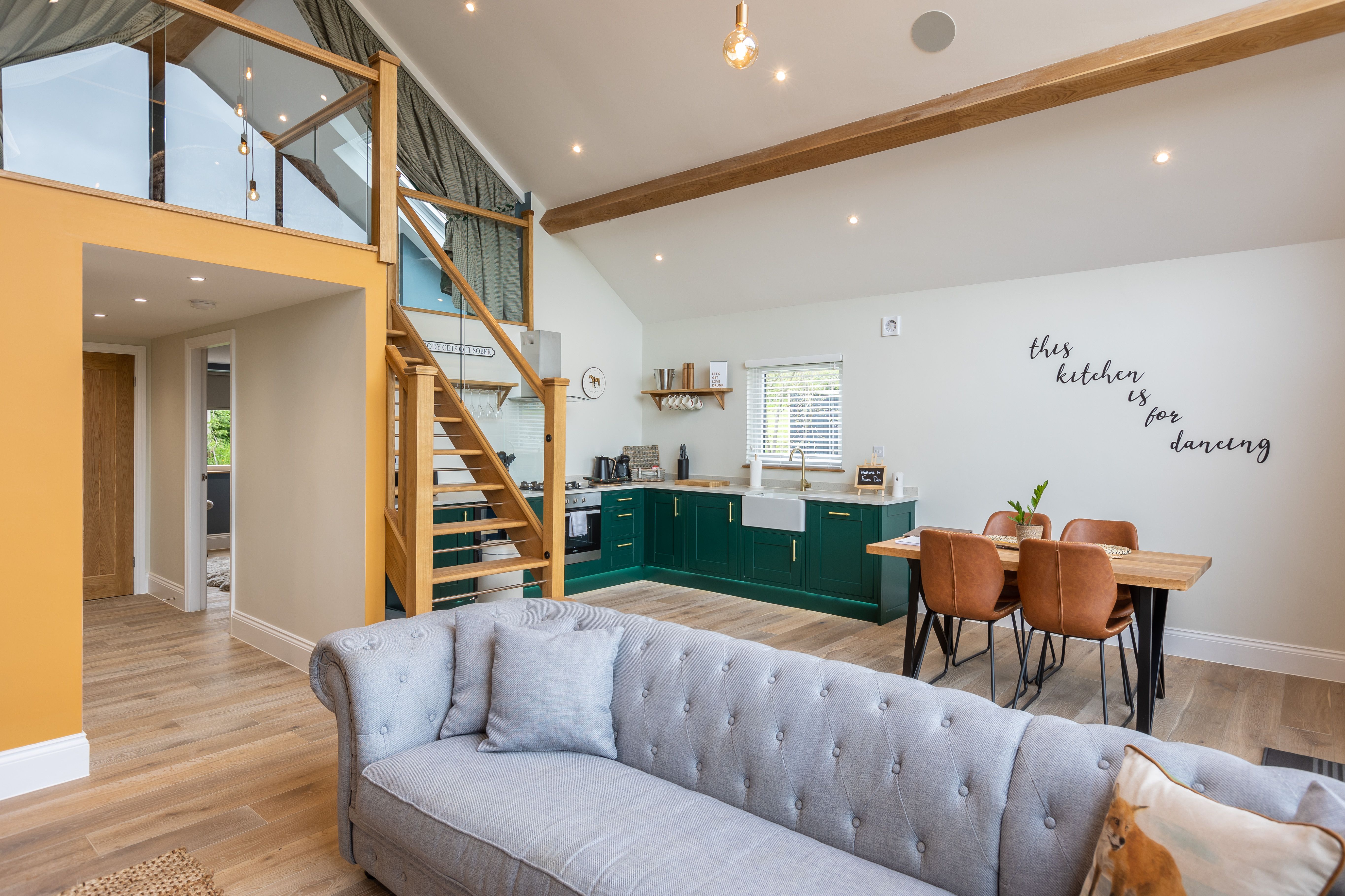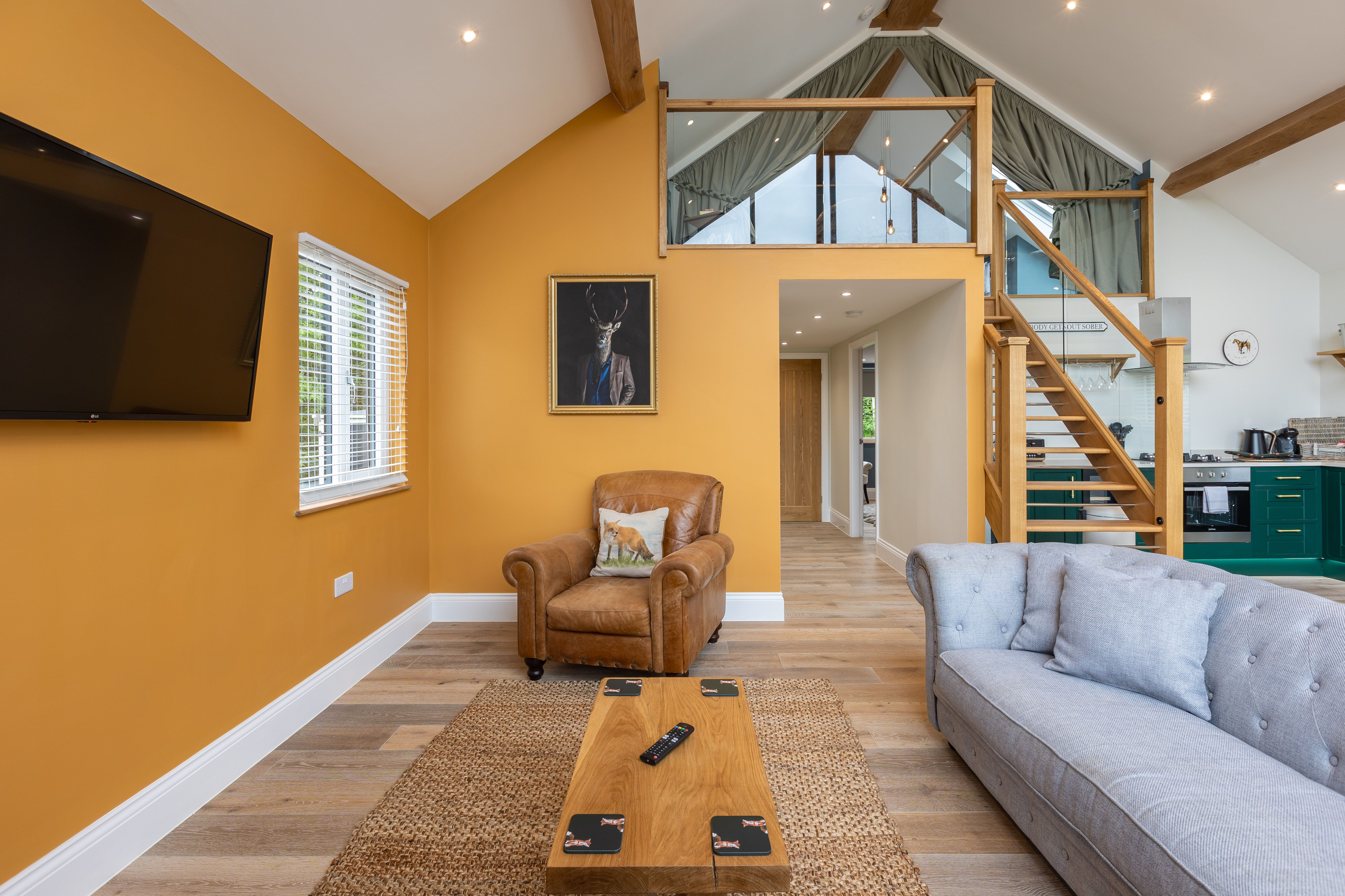 Accomodation Details Single-storey with mezzanine. 1 x mezzanine king-size with en-suite walk-in shower, basin and WC, 1 x king-size. Ground-floor bathroom with freestanding bath, walk-in shower, basin and WC. Open-plan living space with kitchen, dining area and sitting area with woodburning stove. Utility