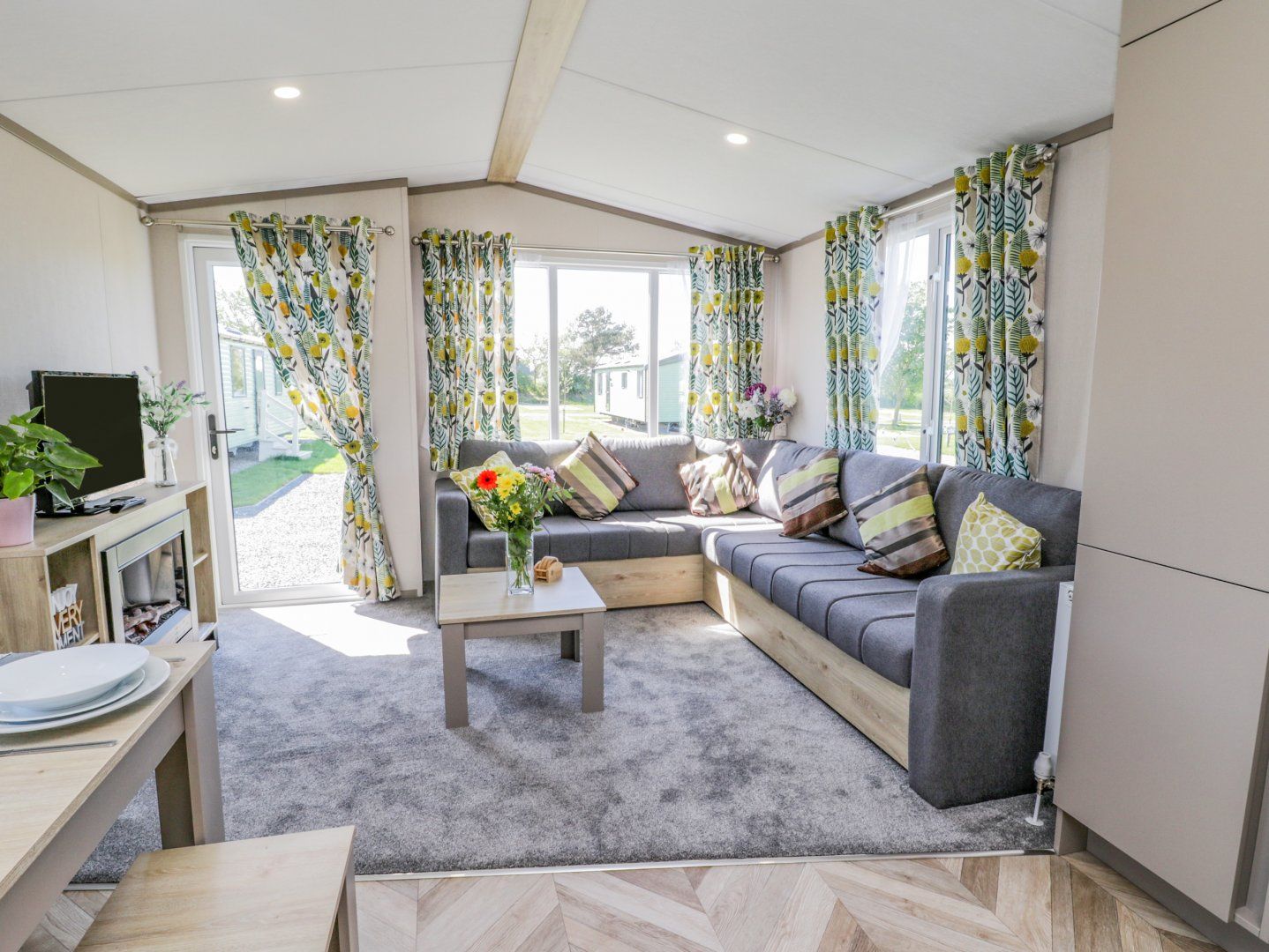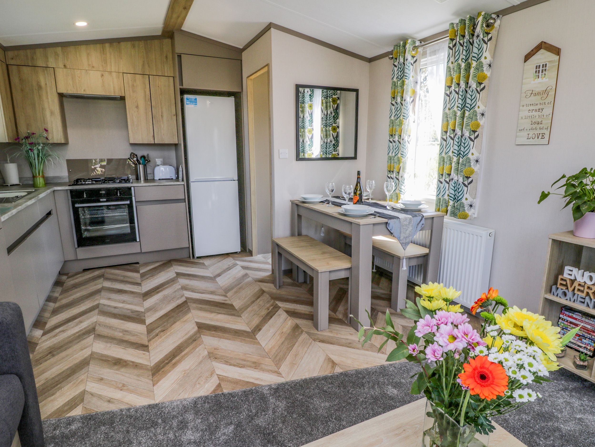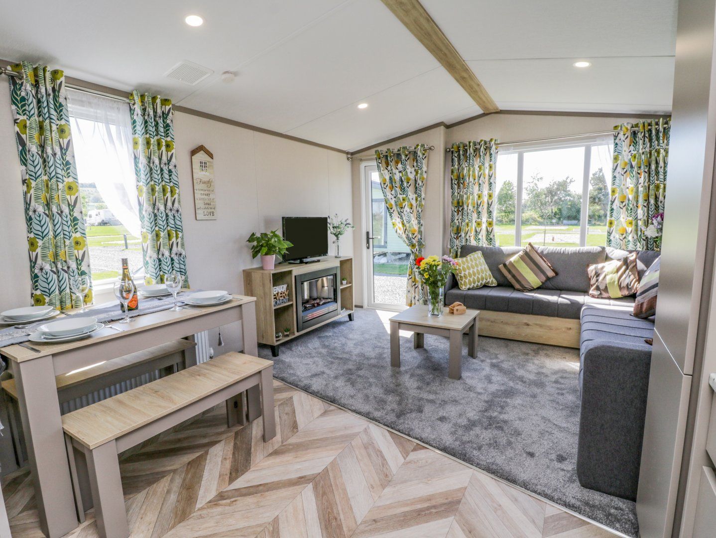 Gas central heating with electric fire. Electric oven, gas hob, microwave, fridge/freezer. Smart TV, WiFi. Fuel and power inc. in rent. Bed linen and towels inc. in rent. Travel cot and highchair available on request. Off-road parking for 1 car. Side garden with lawn, secure gated decking, furniture, and sunken hot tub. Two well-behaved dogs welcome. Sorry, no smoking. Shop 1.4 miles, pub 1.6 miles. Note: There are steps up to the lodge. Note: On-site bar open at weekends
