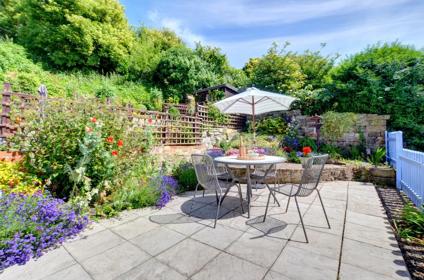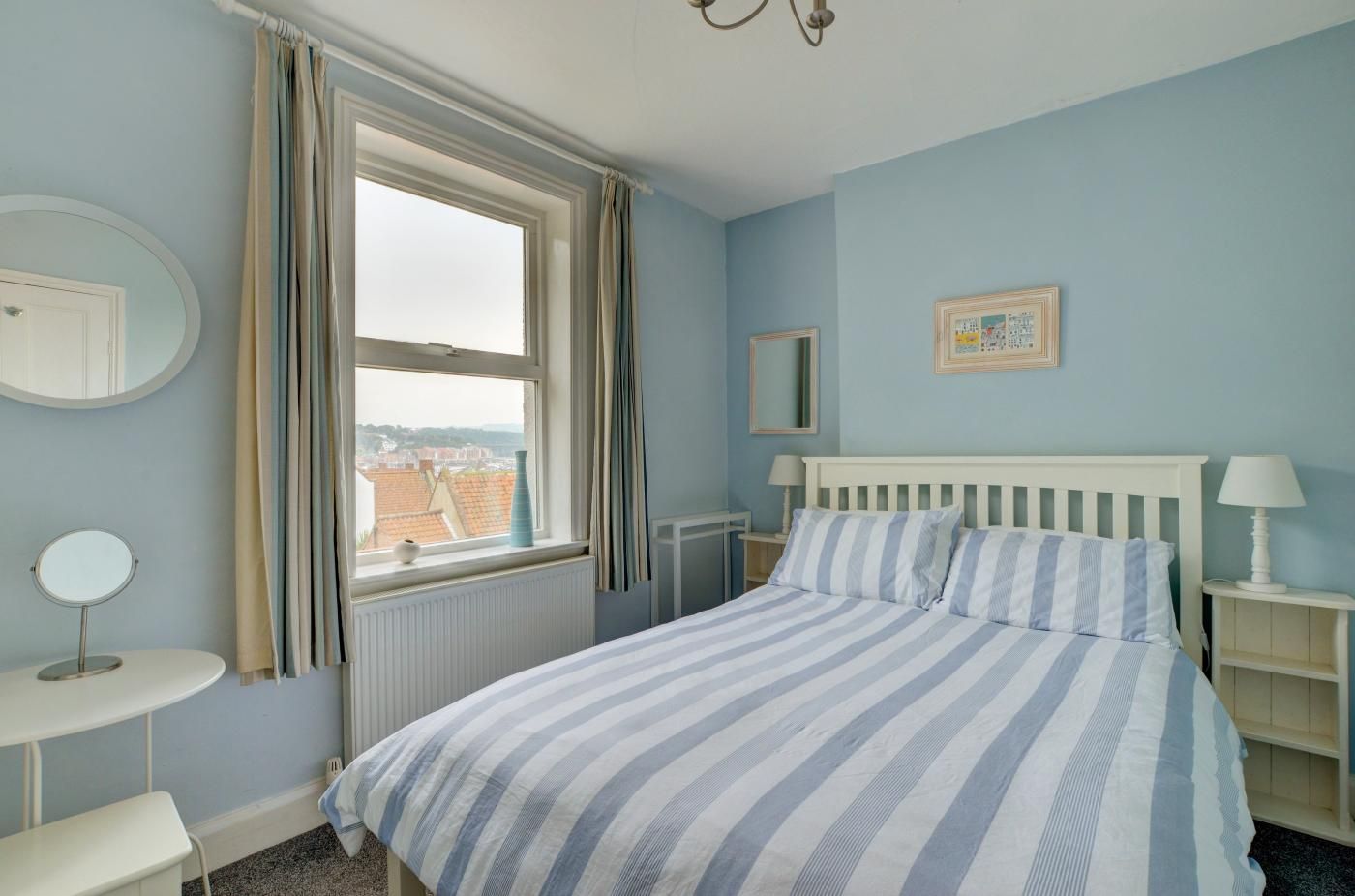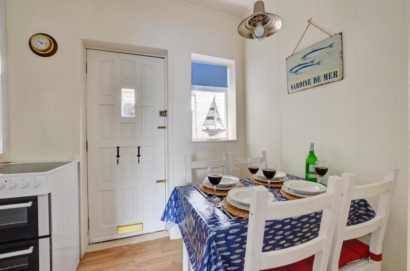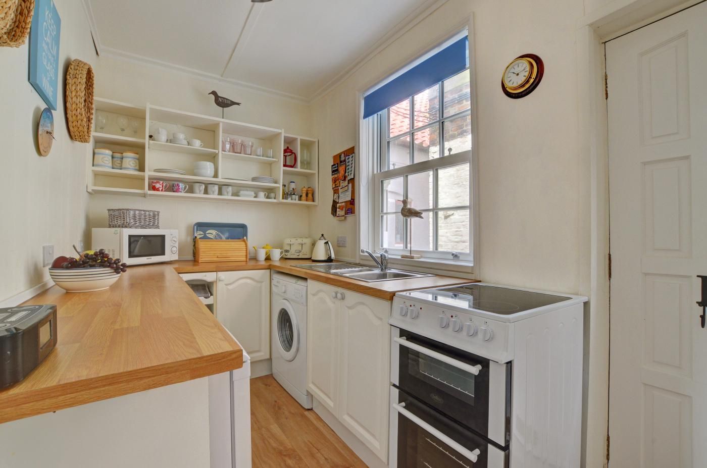 In the evenings, snuggle up in the homely lounge by the wood burner effect gas fire or dine alfresco in the pretty cottage garden with sea views. Climb 32 steps to reach the front door of the property and make yourself at home in the comfortable lounge with neutral tones, a soft rug beneath your feet and two plump sofas which sit on either side of the wood burner effect gas fire and SmartTV.