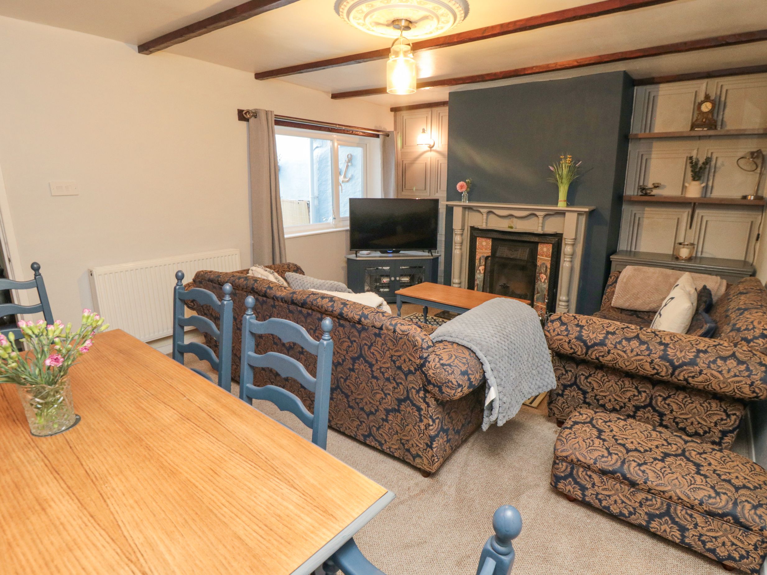 Three Anchor Cottage consists of a kitchen with an electric oven, gas hob, microwave, fridge, kettle, toaster, and slow cooker, and a living/dining room with a smart TV and dining table for six guests. The bedrooms consist of a king-size, double, and a twin (exclusive for children due to being located under the eaves of the cottage). There is a bathroom with a corner bath, walk-in shower, basin, and WC. Outside, there is a private courtyard with furniture and roadside parking on a first-come, first-served basis, and public car parks nearby (fees apply). Sorry, no pets and no smoking. Pub 0.1 miles, shop and beach 0.3 miles. WiFi, fuel, power, bed linen and towels are all included in the price. Enjoy your trip to the property at Three Anchor Cottage. Note: Maximum four adults and two children due to low ceiling in twin room. Note: Check-in from 3 pm and check-out by 11 am.