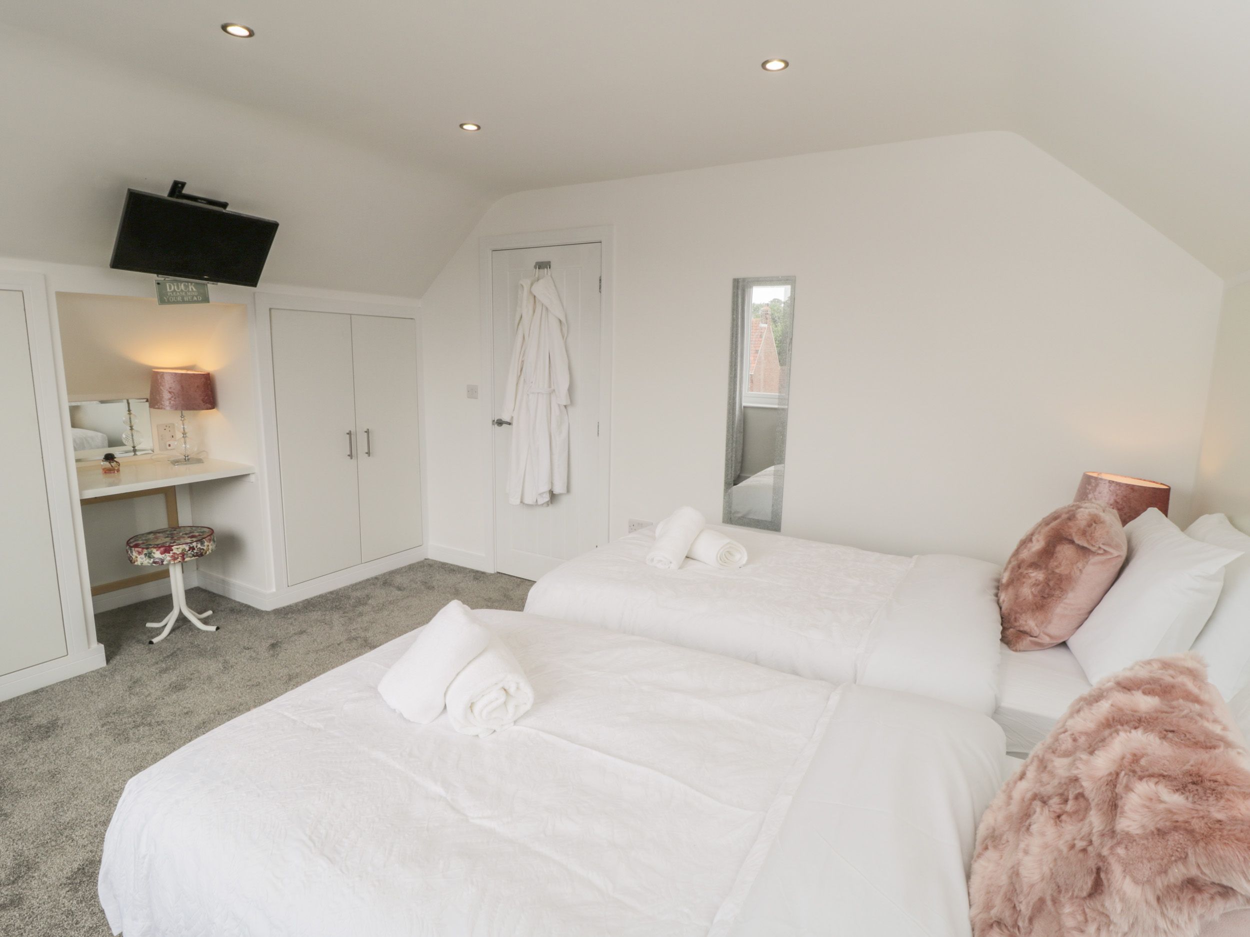 Three bedrooms: 1 x king-size double, 1 x ground-floor double, 1 x twin. Shower room with walk-in shower, basin and WC. Ground-floor wet room with walk-in shower, basin and WC. Open-plan living room with kitchen, dining area and sitting area. Utility room.