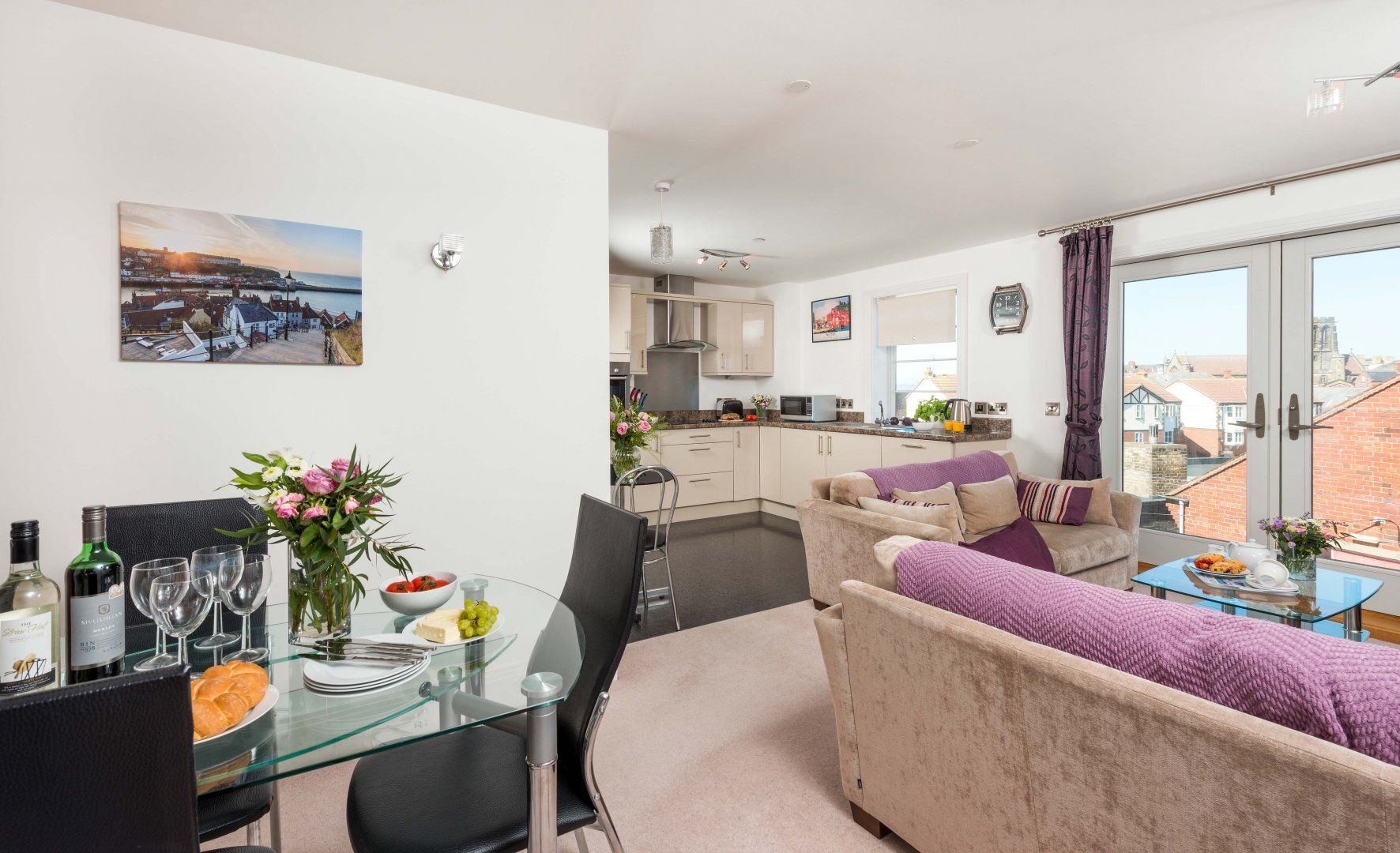 Open plan living area with kitchen, dining area and sitting area, double doors and Juliet balcony.