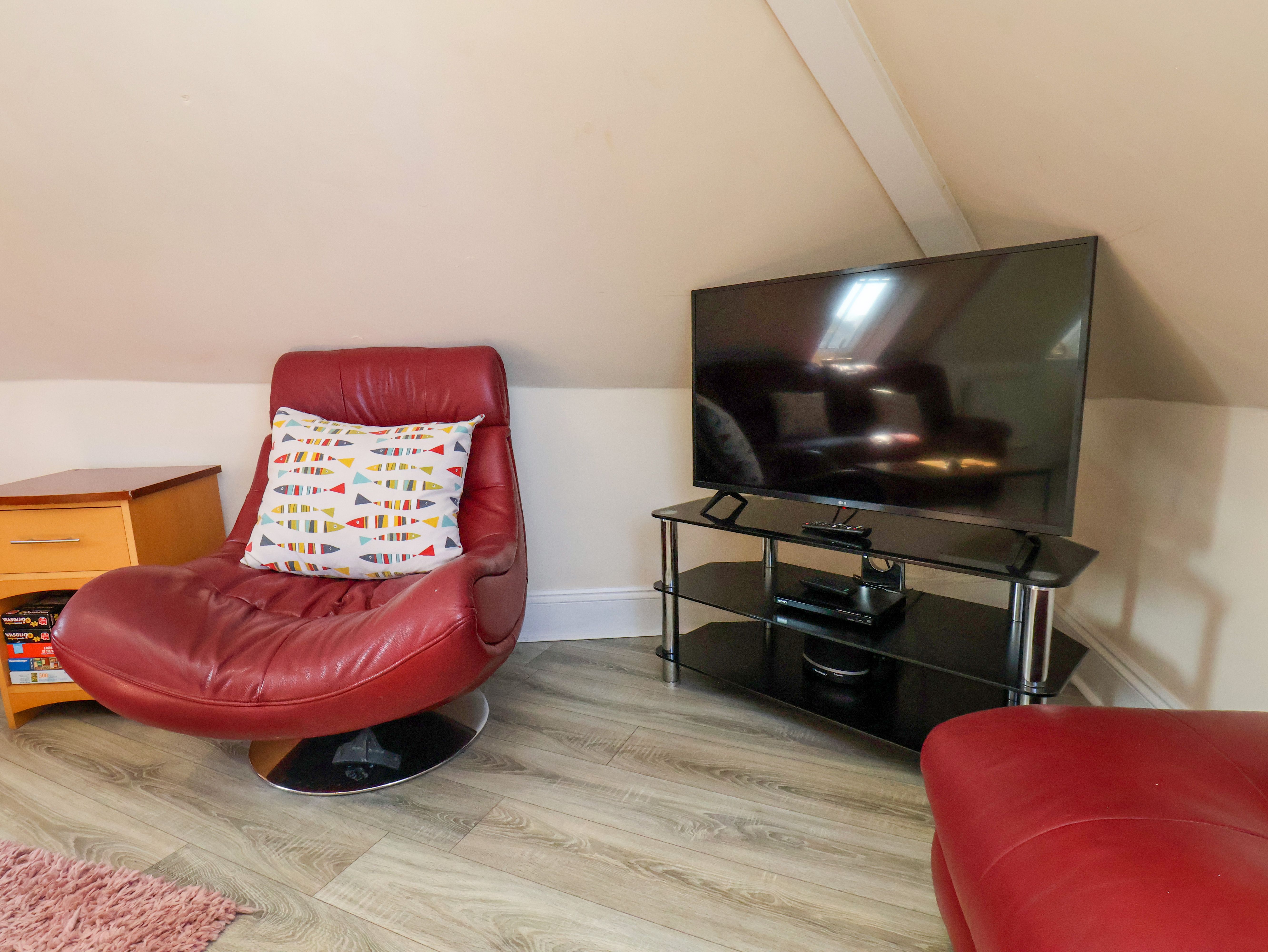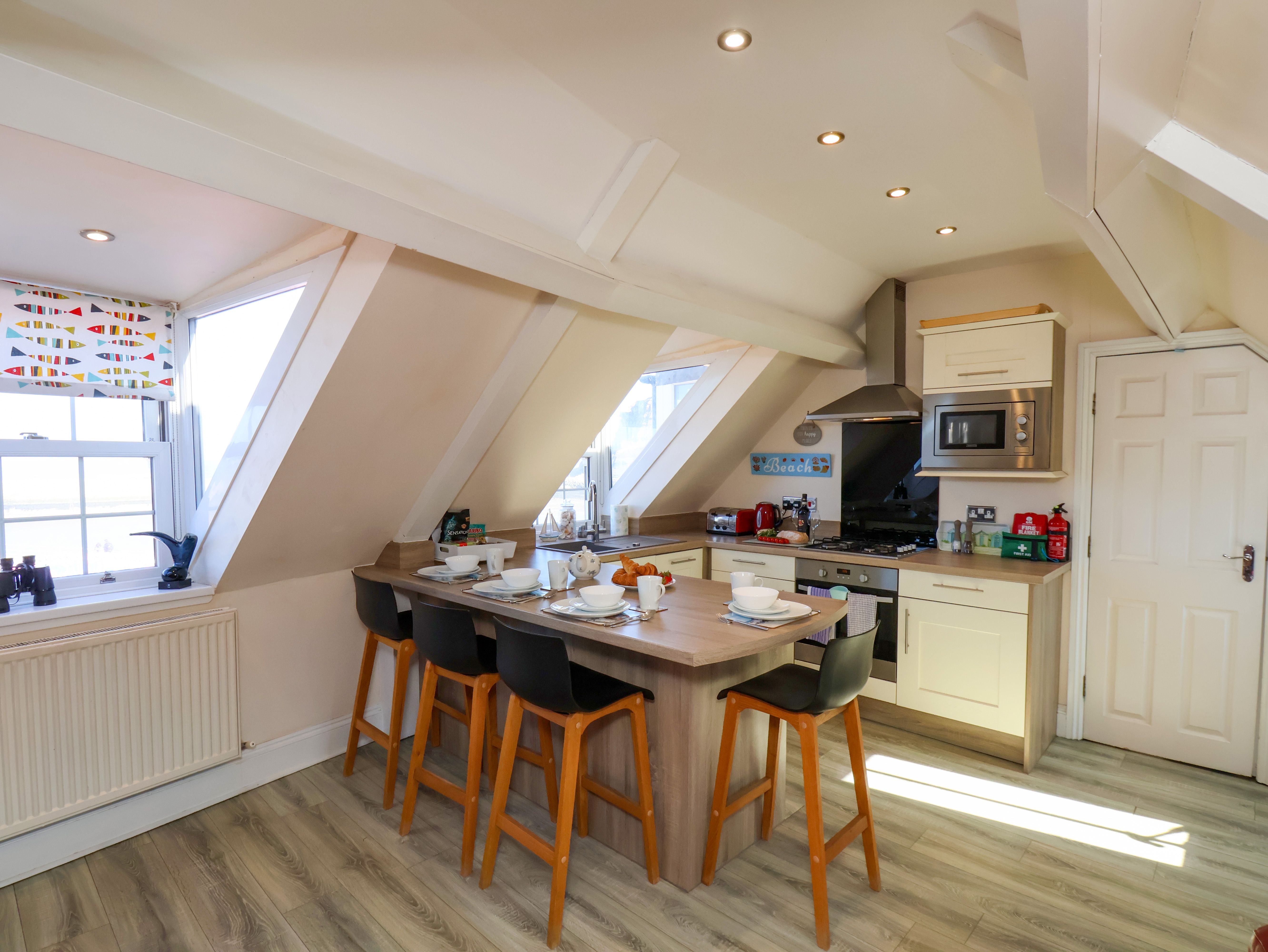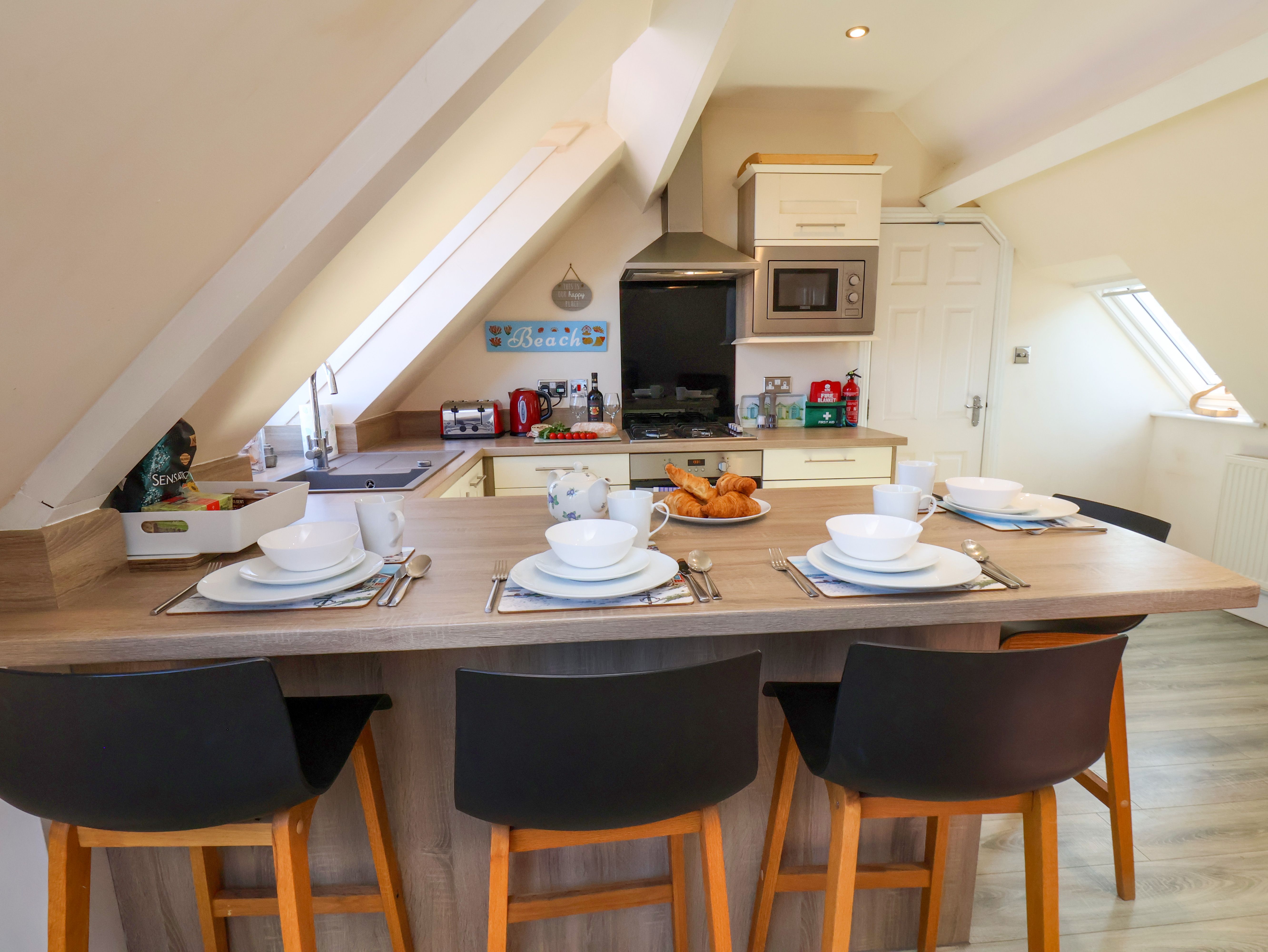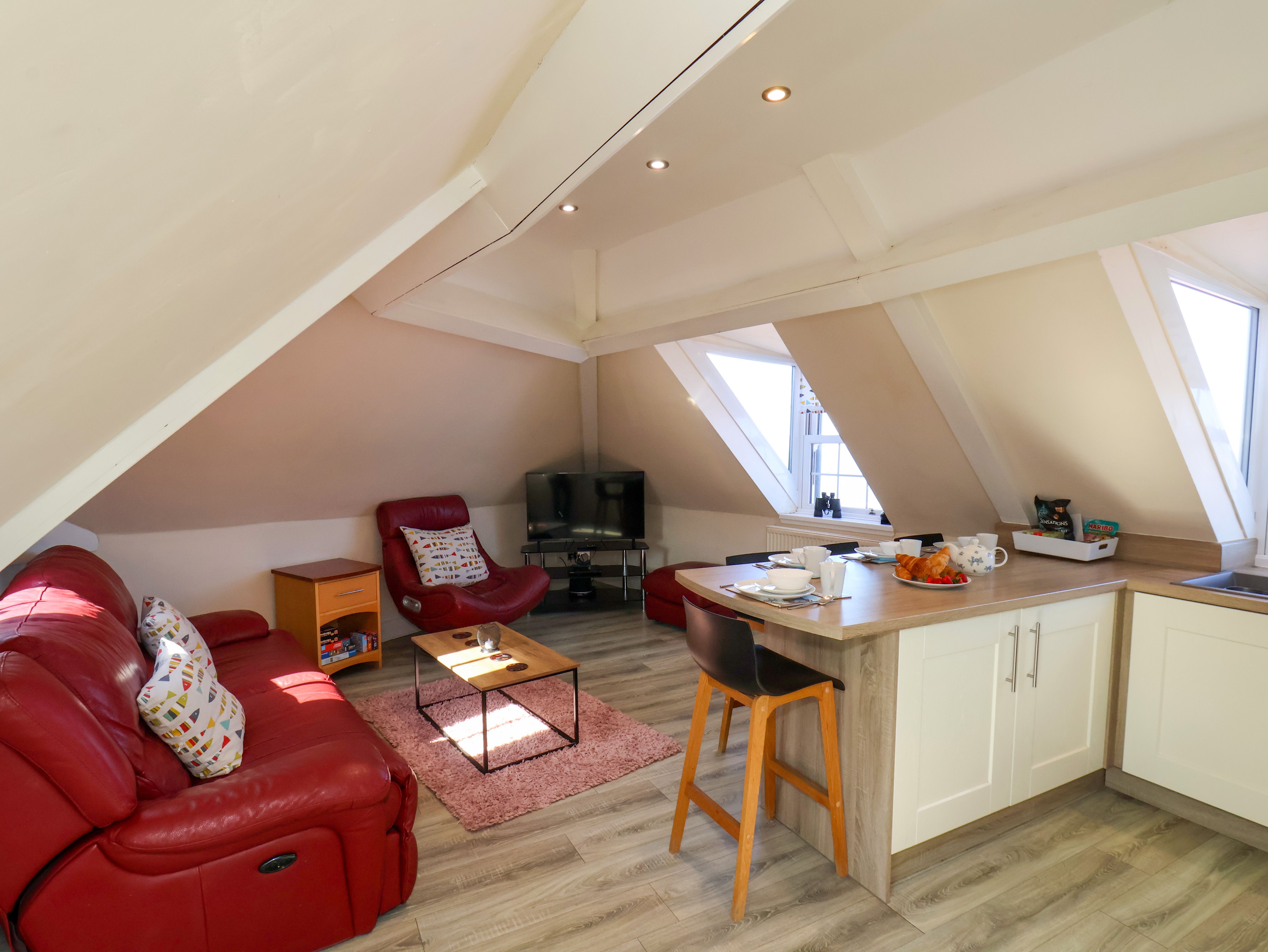 Holiday home The open plan sitting room has good comfortable seating, a flat screen TV and DVD player, dining table and four chairs and a modern fitted kitchen with oven, hob, fridge, freezer and microwave.