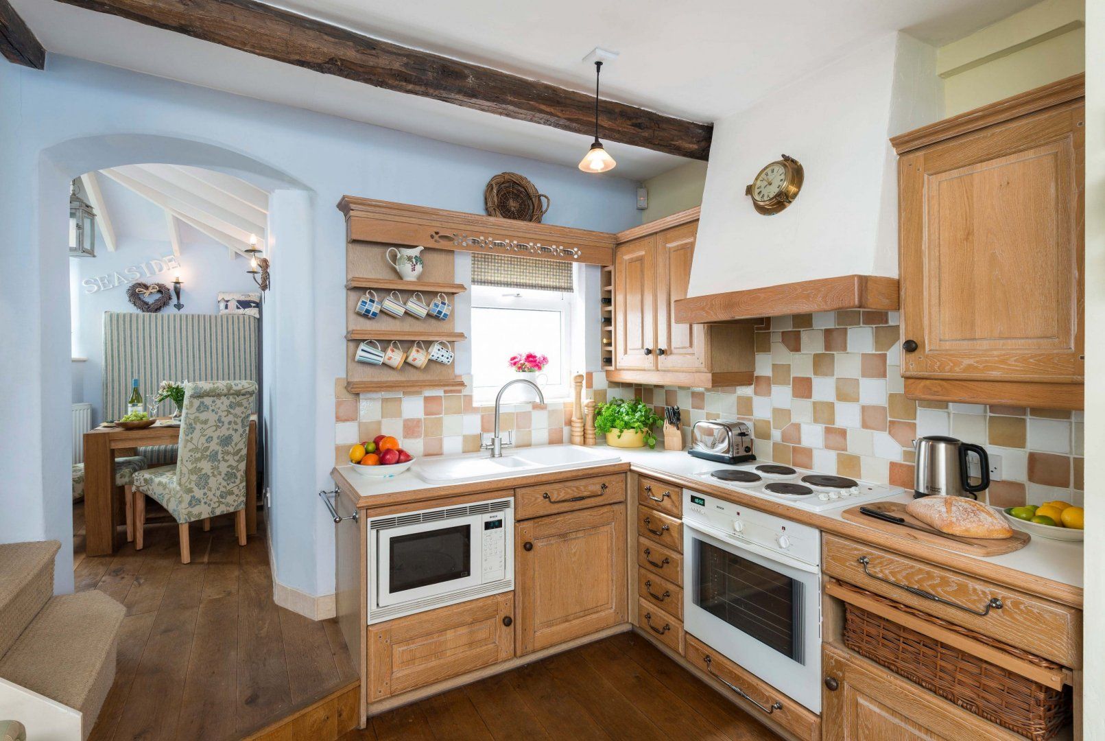 There is an open plan living area which has a sitting room, which boasts a wood burning stove – perfect for cosy evenings – with comfortable seating, a small library of books and wall sconces which hold candles – lovely to sit and enjoy the fire by candlelight and a glass of chilled Prosecco!