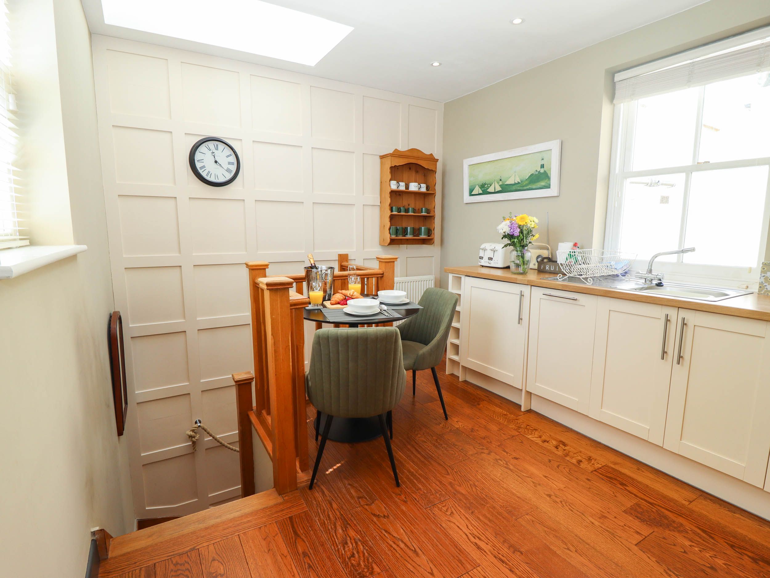 There is a comfortable sitting room with views towards the harbour and with views of the iconic Whitby Abbey. Decorated in relaxing neutral tones with beach scenes in driftwood-style frames, there is a TV with Freeview and Netflix together with a DVD player.