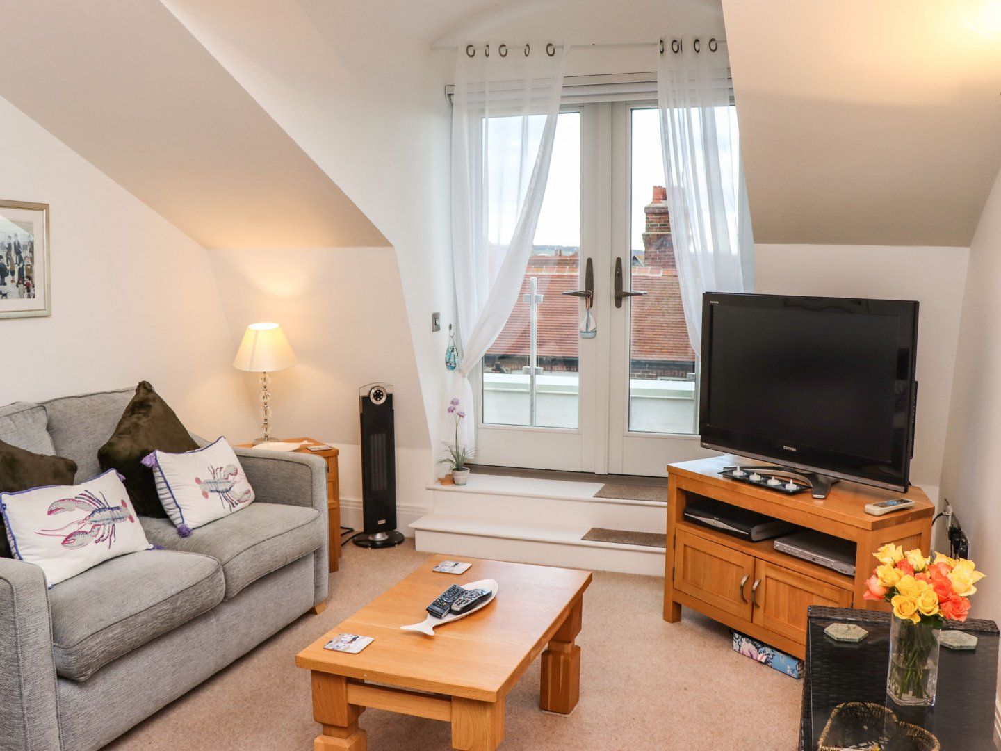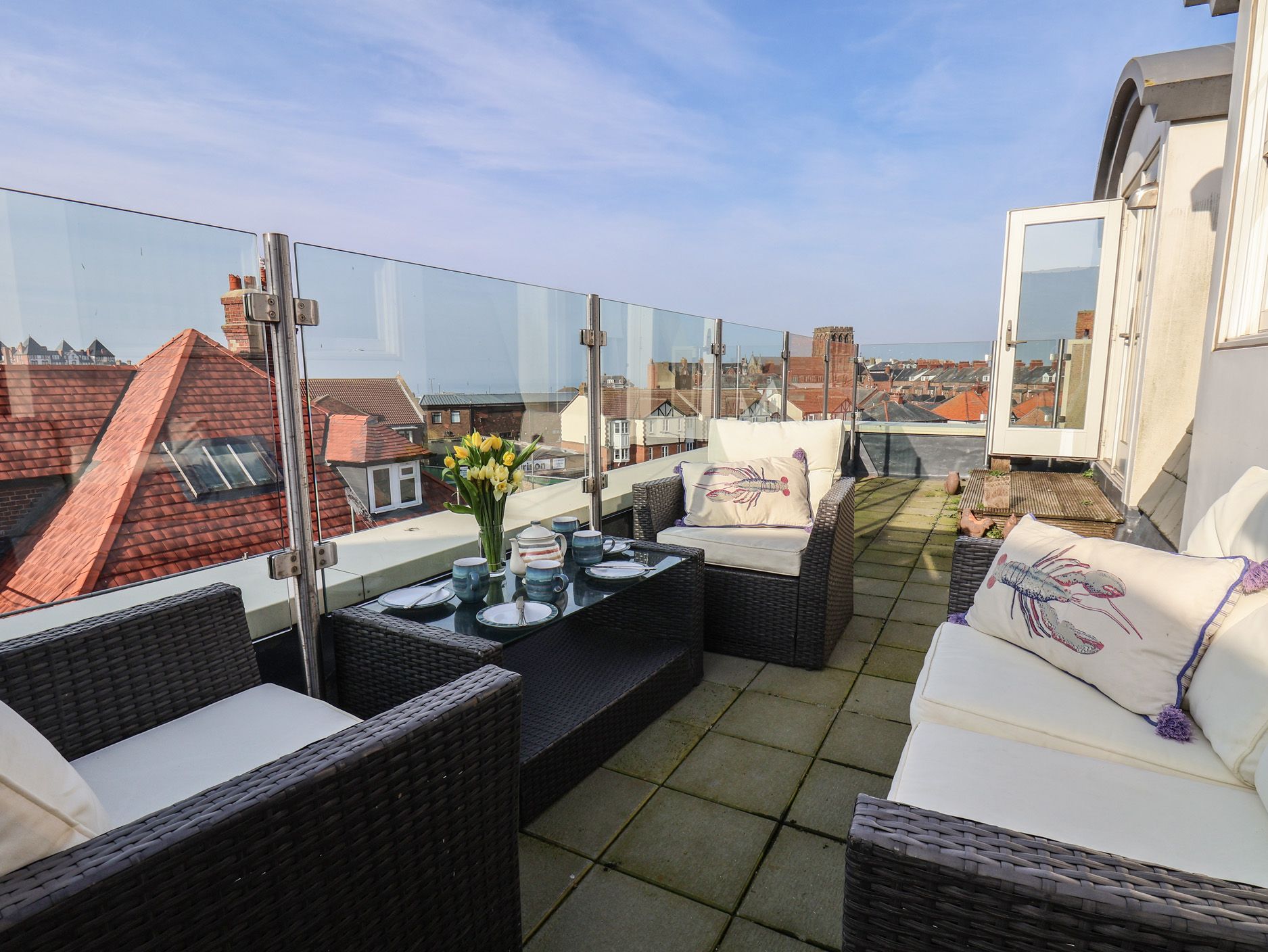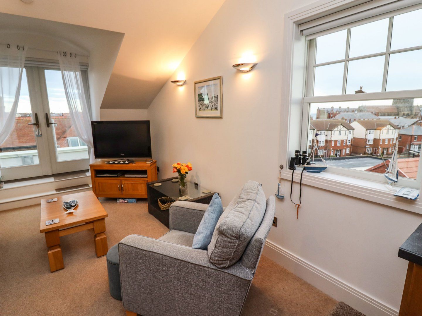 The open-plan living space includes a kitchen housing an oven and hob, microwave, fridge/freezer, dining seating and a TV with Sky. The bedrooms include a master twin and a double, serviced by a bathroom. Outside there is a patio with furniture, as well as designated parking for once car. This apartment does not accept pets or smoking. Within 0.5 miles or less there is a shop, pub and beach. WiFi, fuel, power, bed linen and towels are included in rent. Choose Sunset View for your next escape to Whitby. Note: Cot and highchair not provided, please bring your own.
